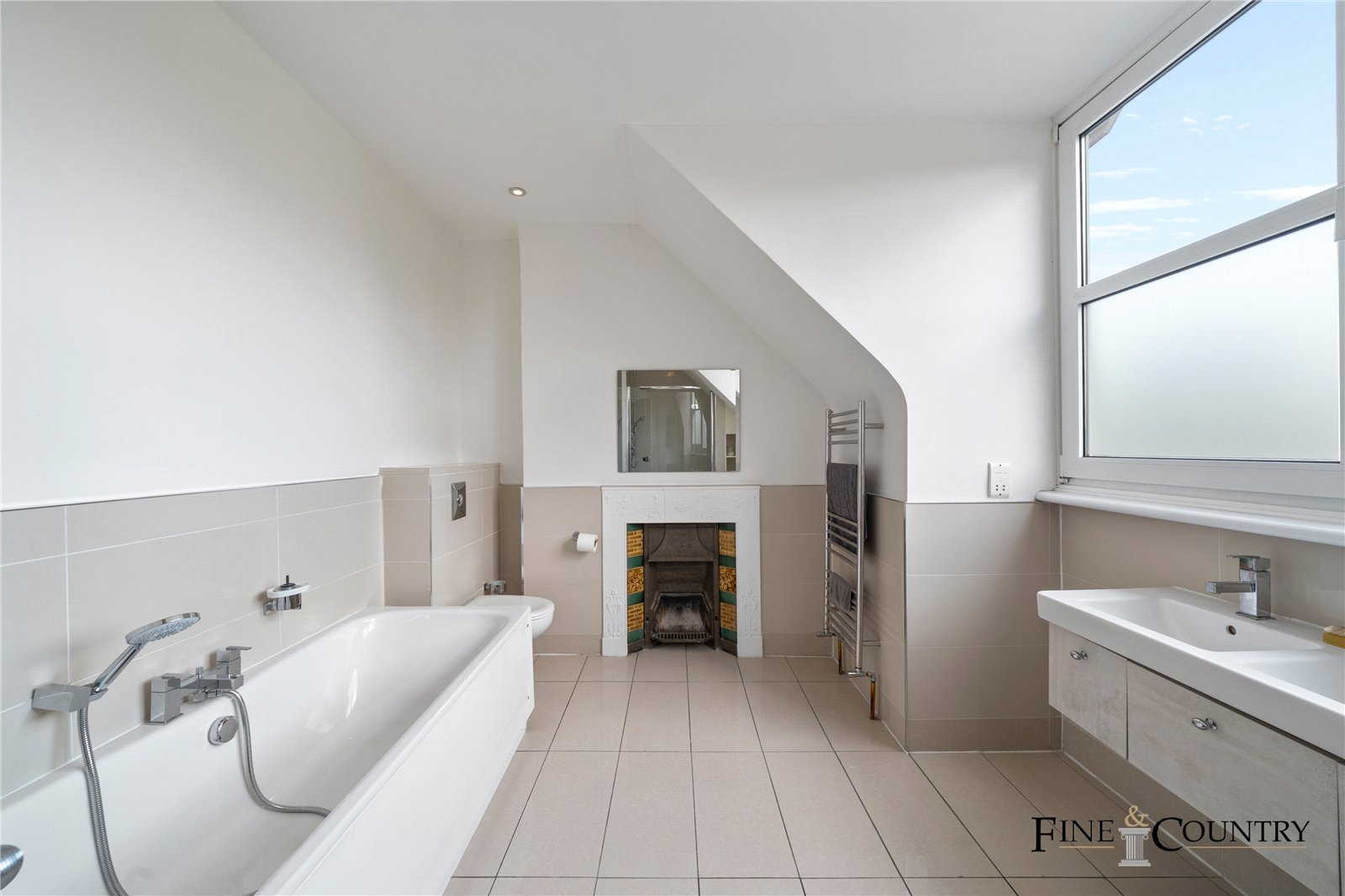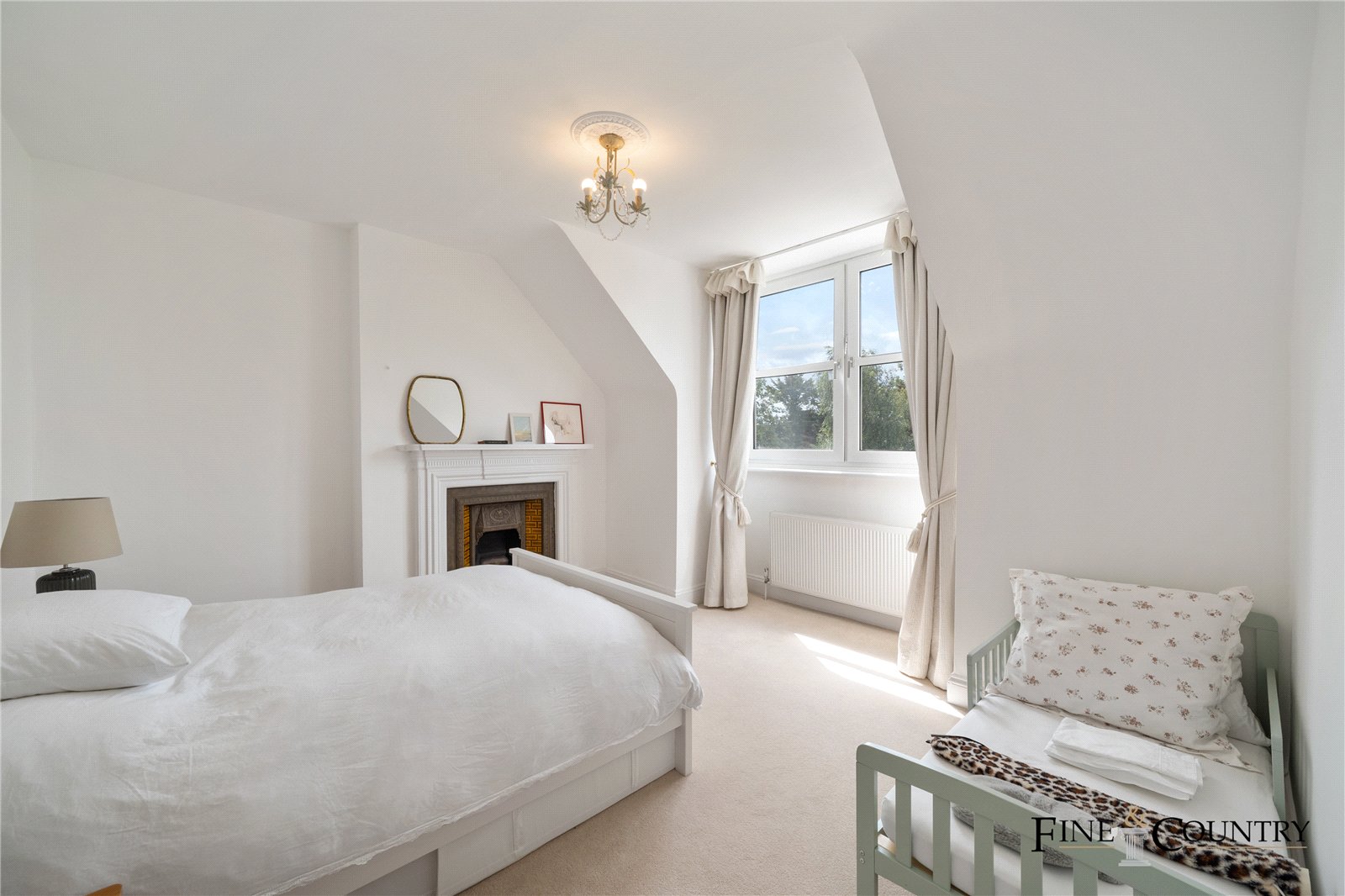 The second floor reveals three further generously proportioned bedrooms, each imbued with distinct character and charm. Elegant Edwardian tiled fireplacesbelieved to be original William Morris designsserve as captivating focal points, lending an artisanal quality to the spaces. The impressive ceiling heights and deep-set bay windows enhance the sense of volume and light, while subtle architectural details nod to the homes early 20th-century heritage. Whether styled as tranquil bedrooms, creative studios or study spaces, these rooms offer exceptional versatility. A stylishly appointed family bathroom, complete with modern fixtures and natural light, completes this well-balanced upper level.