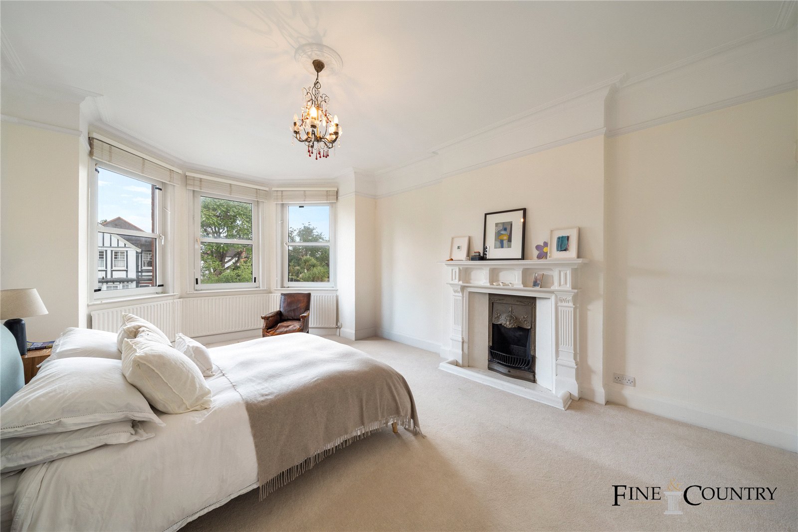 The first floor is centred around an exceptional principal bedroom suitean impressively scaled, bay-fronted space that captures soft natural light through three elegant sash windows. High ceilings, refined cornicing and a grand period fireplace lend the room an unmistakable sense of Edwardian sophistication, while the generous proportions provide ample room for seating or dressing areas. This serene retreat is complete with a private en-suite bathroom, making it a true sanctuary within the home. Two further double bedrooms also occupy this floor, each beautifully proportioned and thoughtfully positioned for privacy and functionality. A stylish family bathroom with contemporary fittings, alongside a separate WC, ensures convenience for family life or visiting guests.