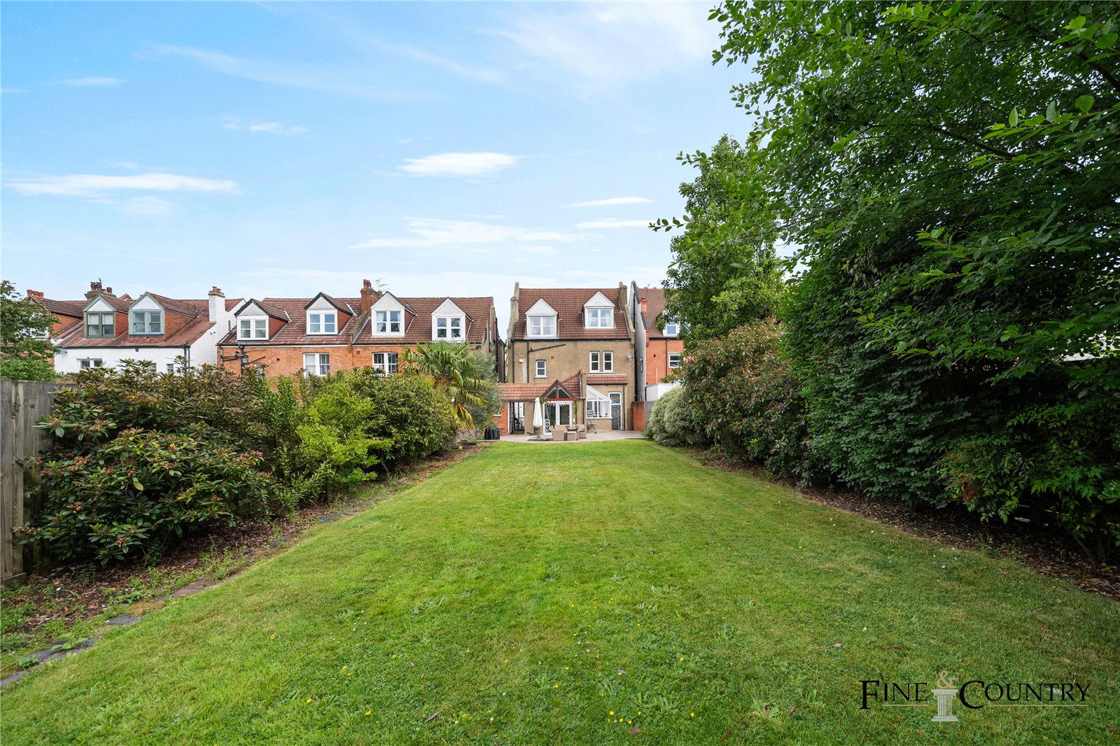 Bordered by mature greenery, the home opens through a characterful arched entrance and into a welcoming hallway laid with original monochrome tiles. A grand mahogany balustrade staircase sweeps upwards, anchoring the heart of the house with elegance and scale. To the left, the exceptional 41 ft reception/dining room flows front to back, with generous ceiling heights, ornate cornicing, and dual bay windows bathing the space in natural light. Soft timber flooring and decorative fireplaces provide warmth and refinement, making this a perfect space for hosting or unwinding.