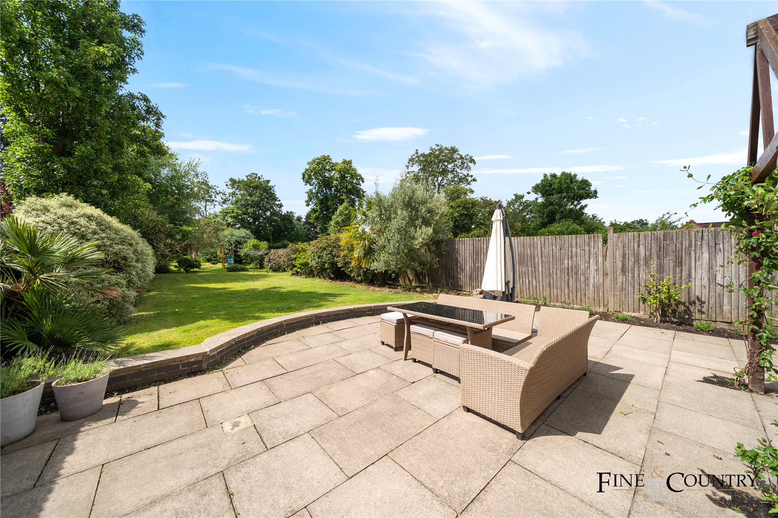 At the rear of the home, the contemporary kitchen is a strikingly light-filled space, defined by its dramatic vaulted ceiling and full-height glazing that opens directly onto the south-facing garden. Clean, sleek gloss finish cabinetry is complemented by polished black granite worktops, offering both style and durability. Integrated appliances, including a built-in oven and extractor, are seamlessly positioned for convenience, adding a touch of modern practicality.