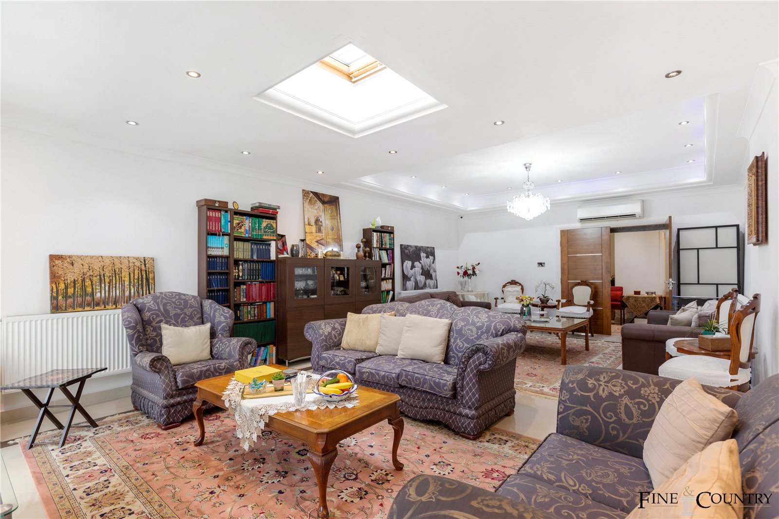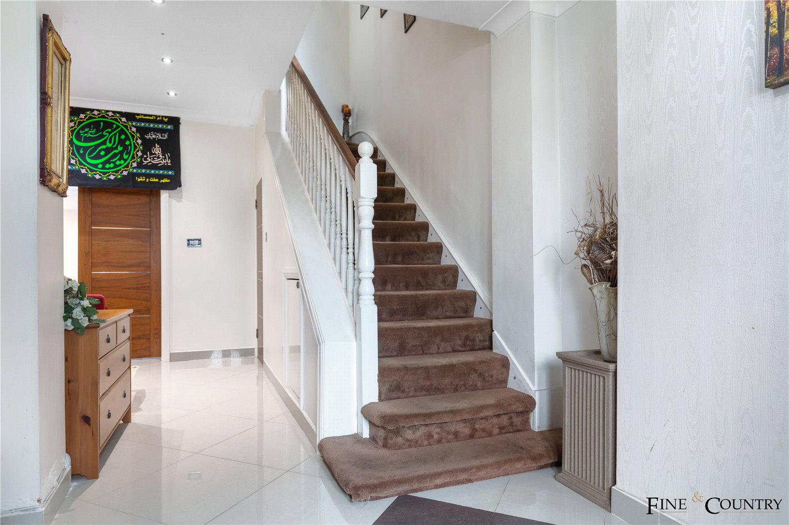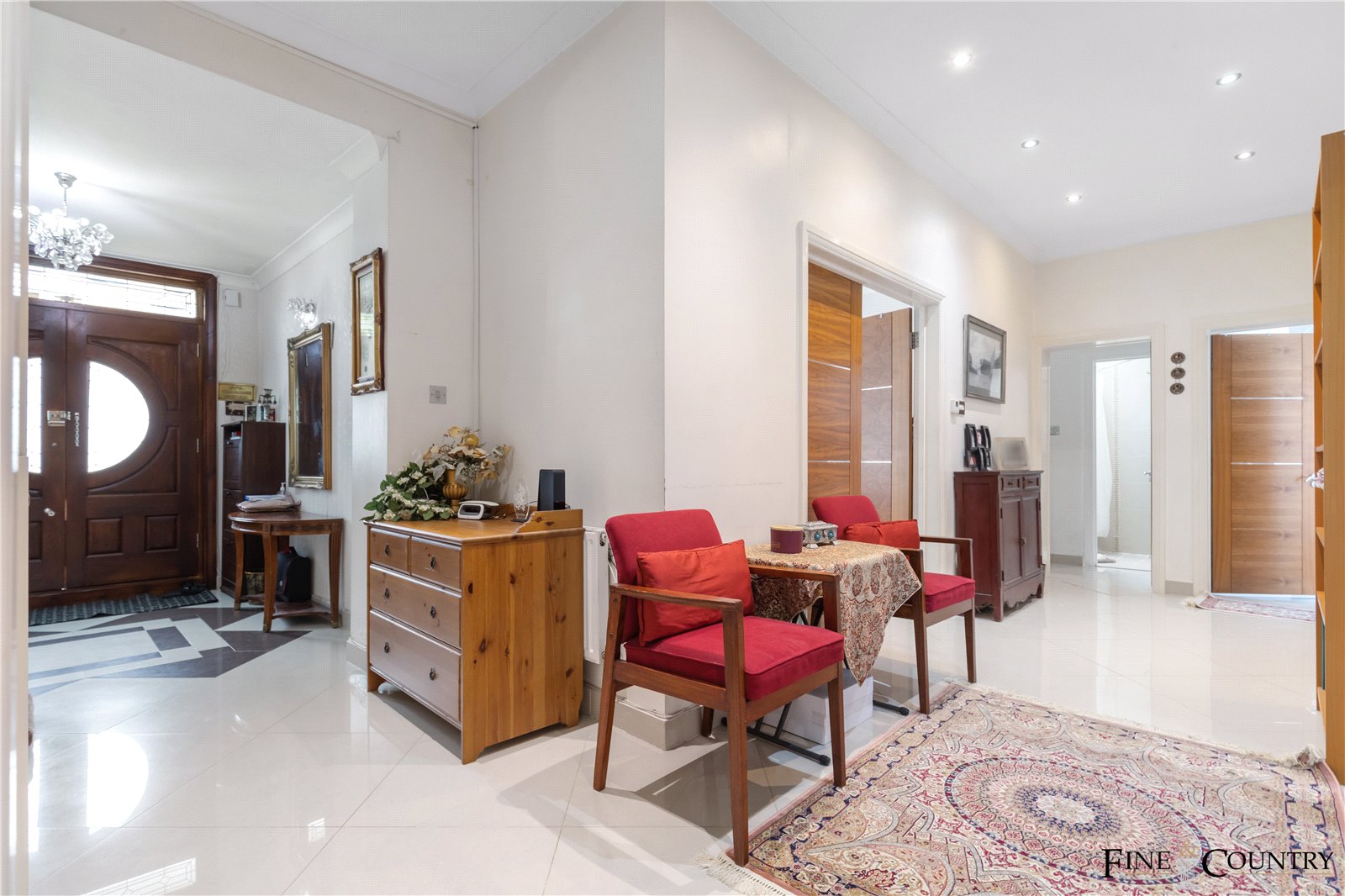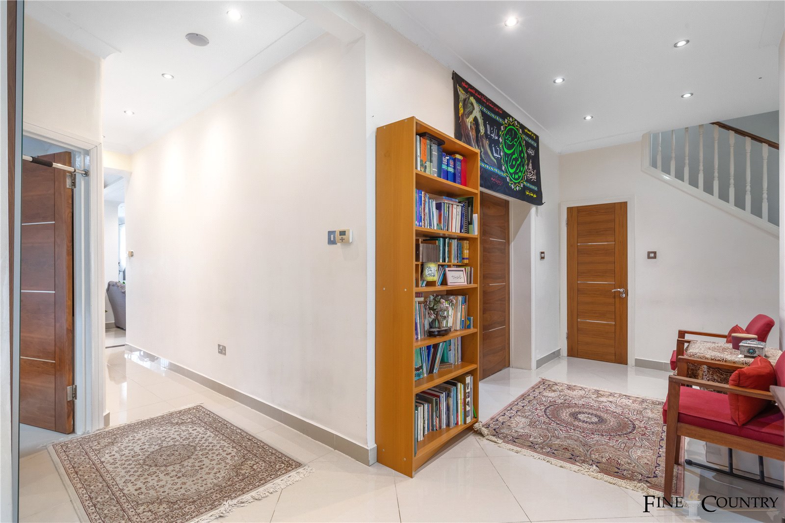 This beautiful semi-detached home distinguished by its classic white façade and lush and beautifully designed front garden offers a grand driveway leading to the main entrance, boasting substantial off-street parking. The entryway, flanked by ornate columns, ushers you into a spacious and welcoming entrance hall that introduces the refined aesthetic of the home.