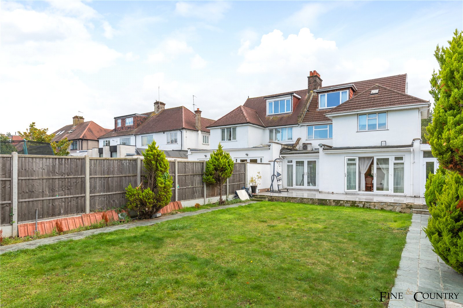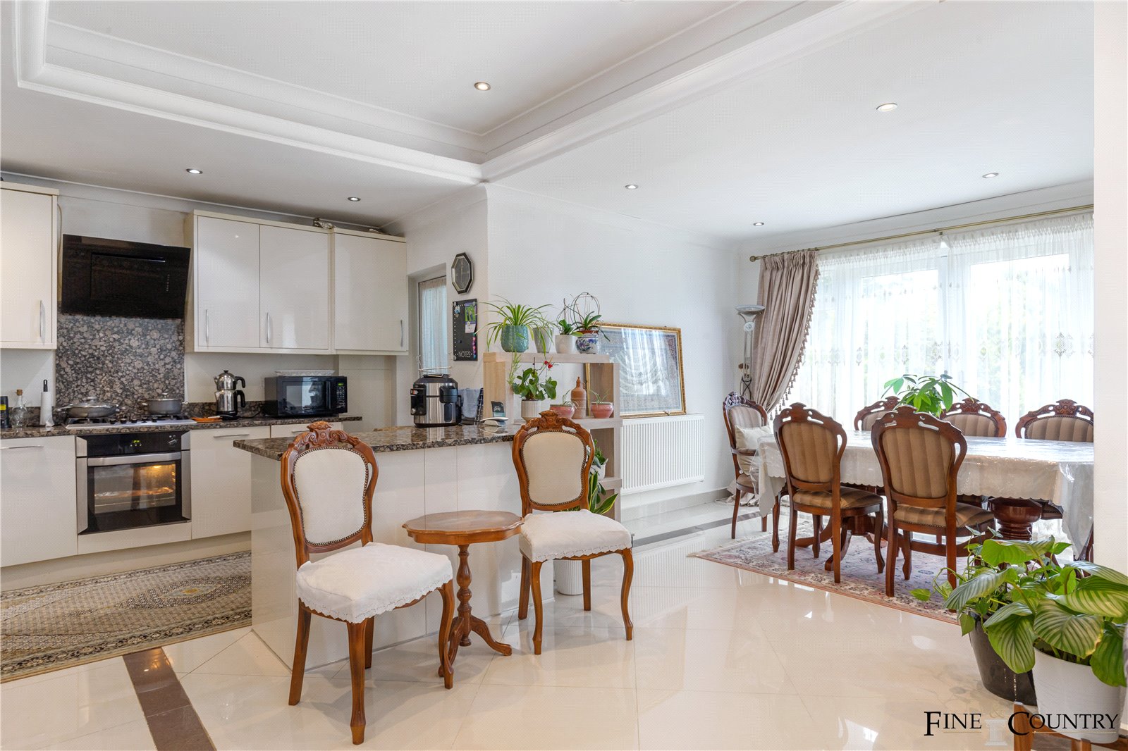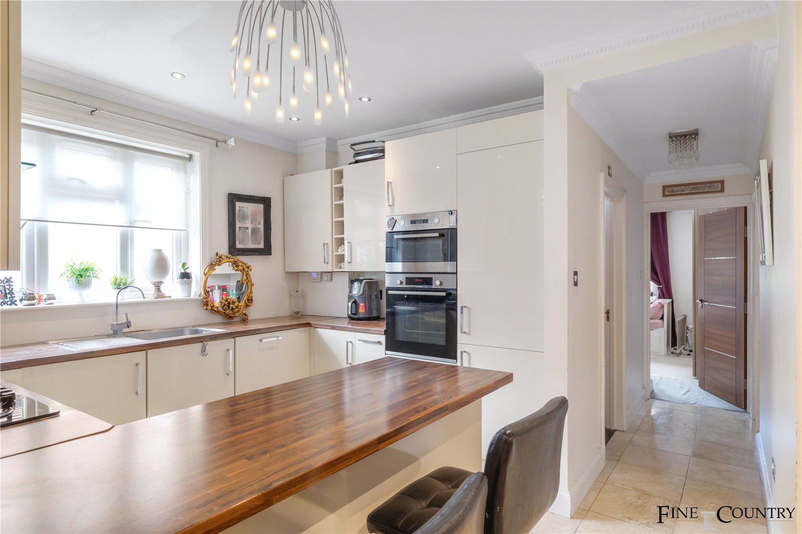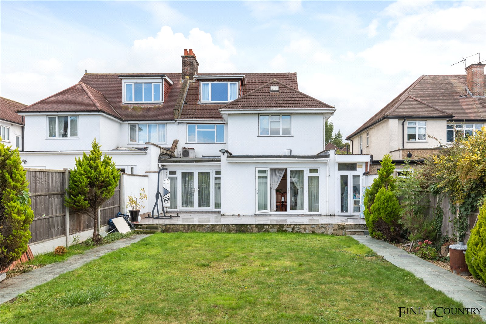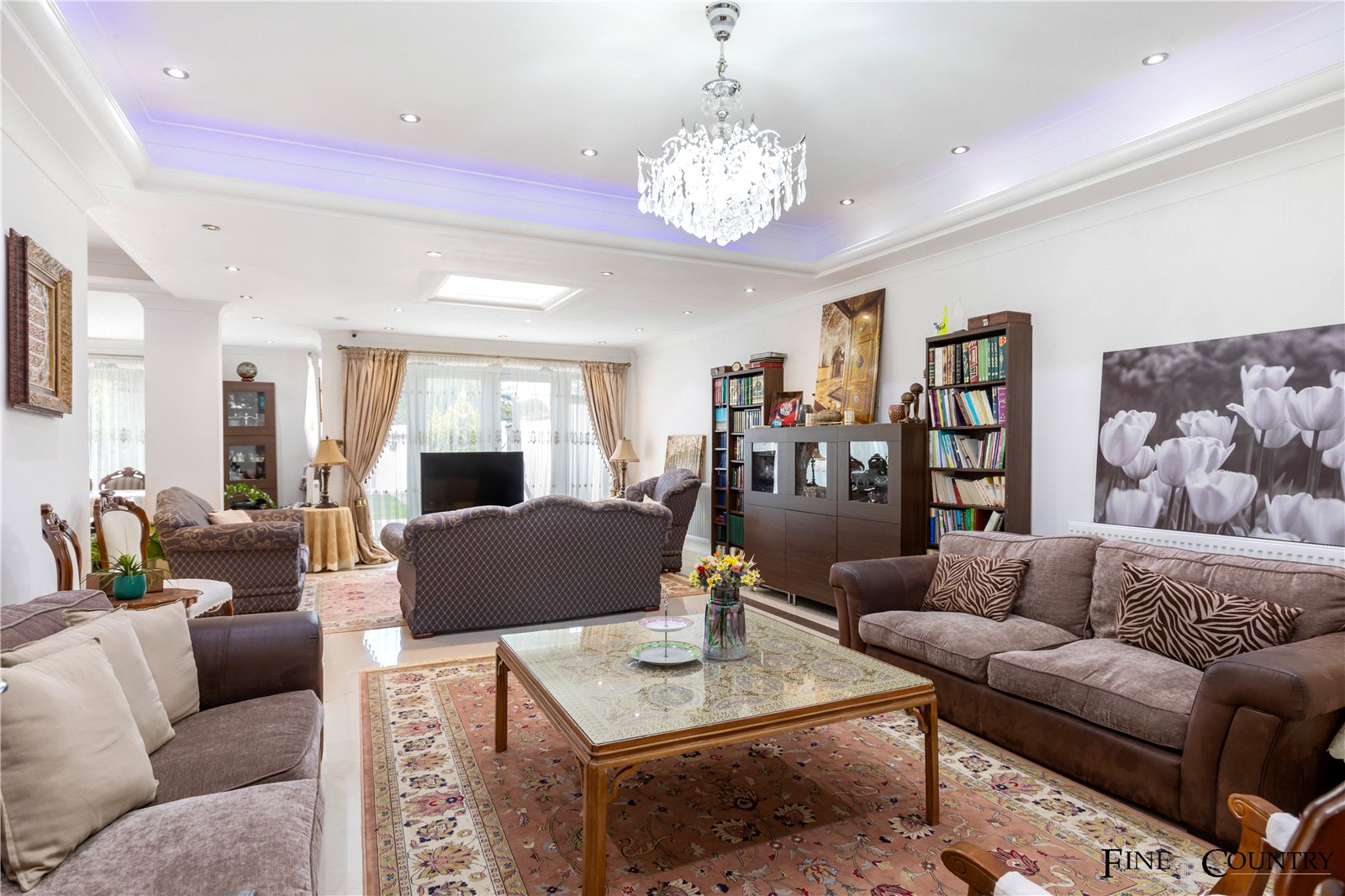 This beautiful semi-detached home distinguished by its classic white façade and lush and beautifully designed front garden offers a grand driveway leading to the main entrance, boasting substantial off-street parking. The entryway, flanked by ornate columns, ushers you into a spacious and welcoming entrance hall that introduces the refined aesthetic of the home.