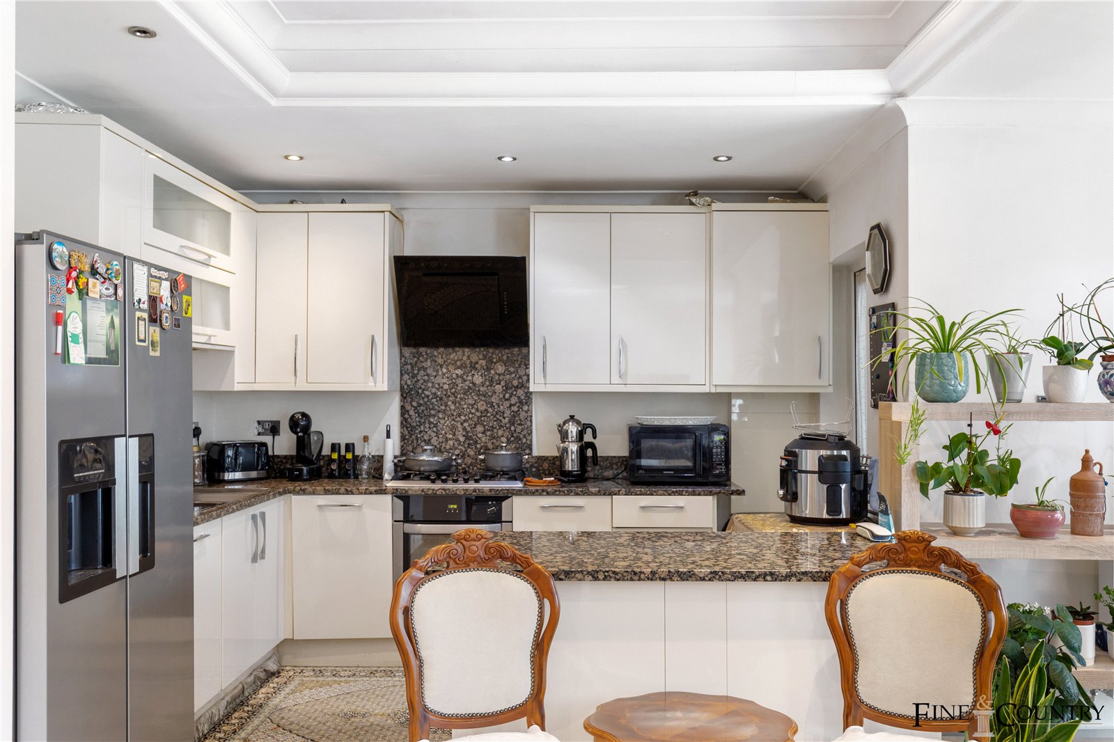 The kitchen is a masterpiece of design, equipped with modern appliances, custom cabinetry, and sleek granite countertops, centred around an expansive island that doubles as a casual dining and additional workspace. A utility room adjacent to the kitchen provides practical storage solutions and laundry facilities, with direct access to the garden for functional indoor-outdoor connectivity. The adjacent formal dining area, with large glass doors, opens directly to the garden, perfect for alfresco dining and seamless entertaining.