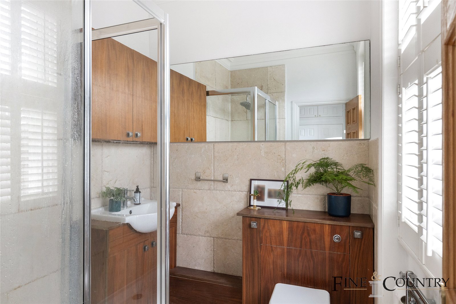 Ascending to the raised ground floor reveals a spacious retreat, encompassing a grand one-bedroom apartment spanning 750 square feet. The open plan reception/kitchen/dining area epitomizes modern elegance, boasting integrated appliances, marble worktops, and a separate utility area. Original cornicing adorns the lofty ceilings, enhancing the sense of grandeur, while the expansive sash window offers enchanting views of the garden. The large bedroom, a sanctuary of comfort and style, is adorned with wooden shutters and offers ample storage space. The accompanying bathroom, exuding contemporary sophistication, offers a luxurious respite from the bustle of daily life.
