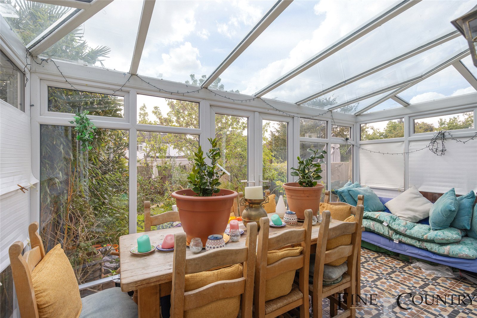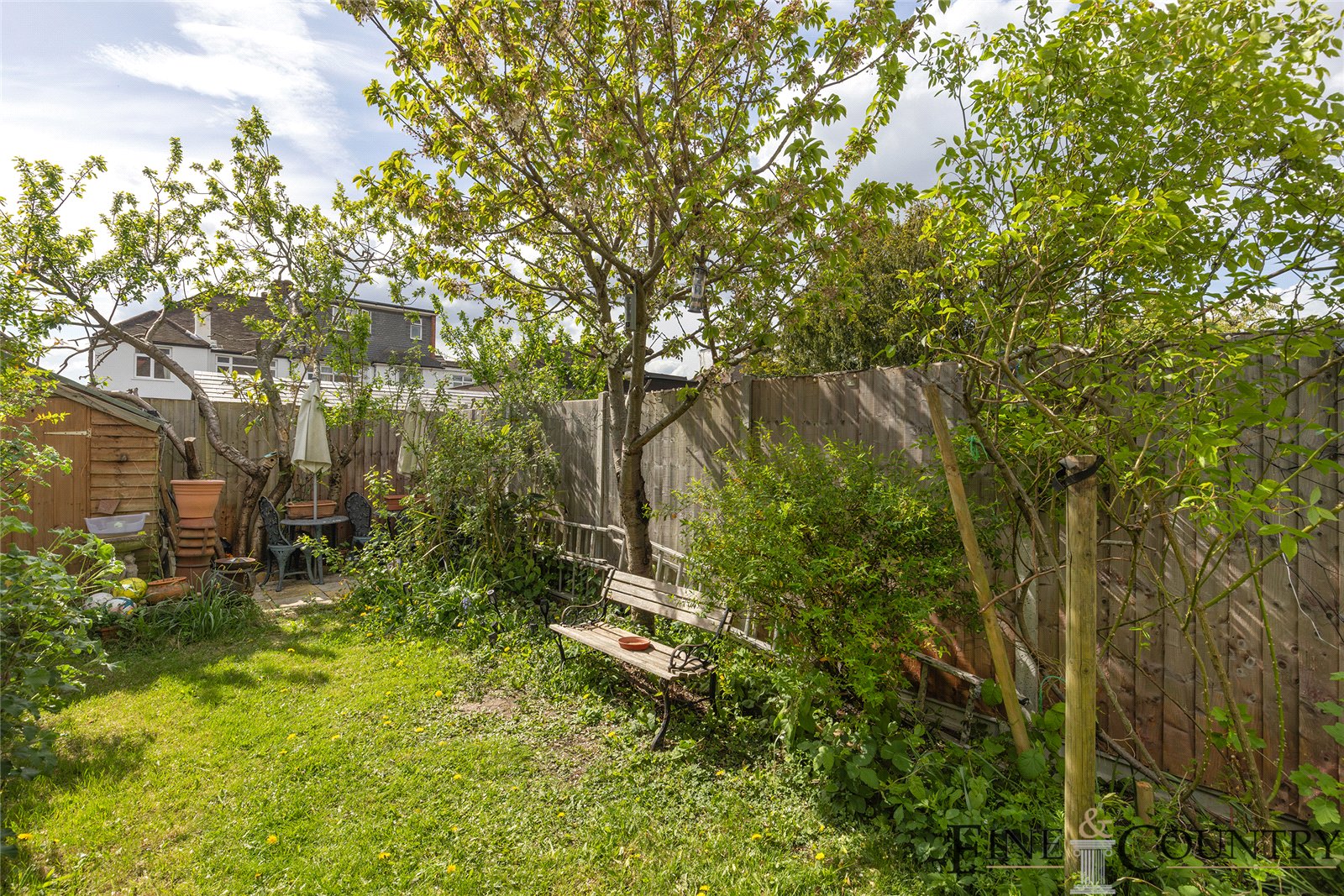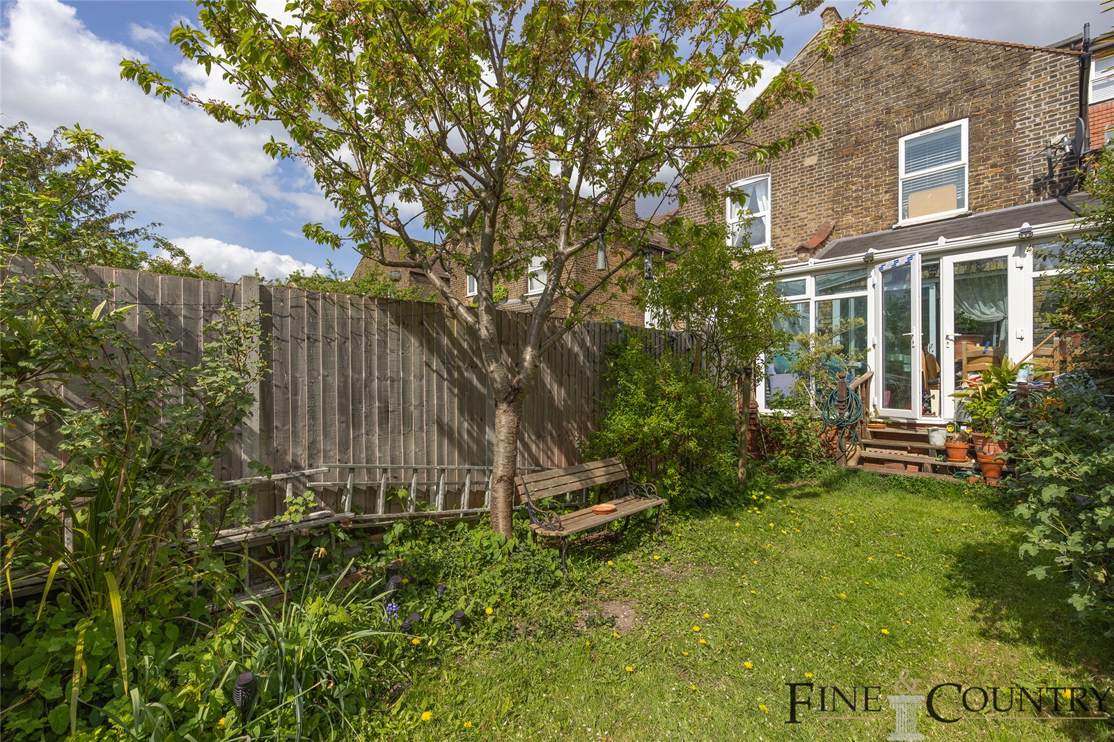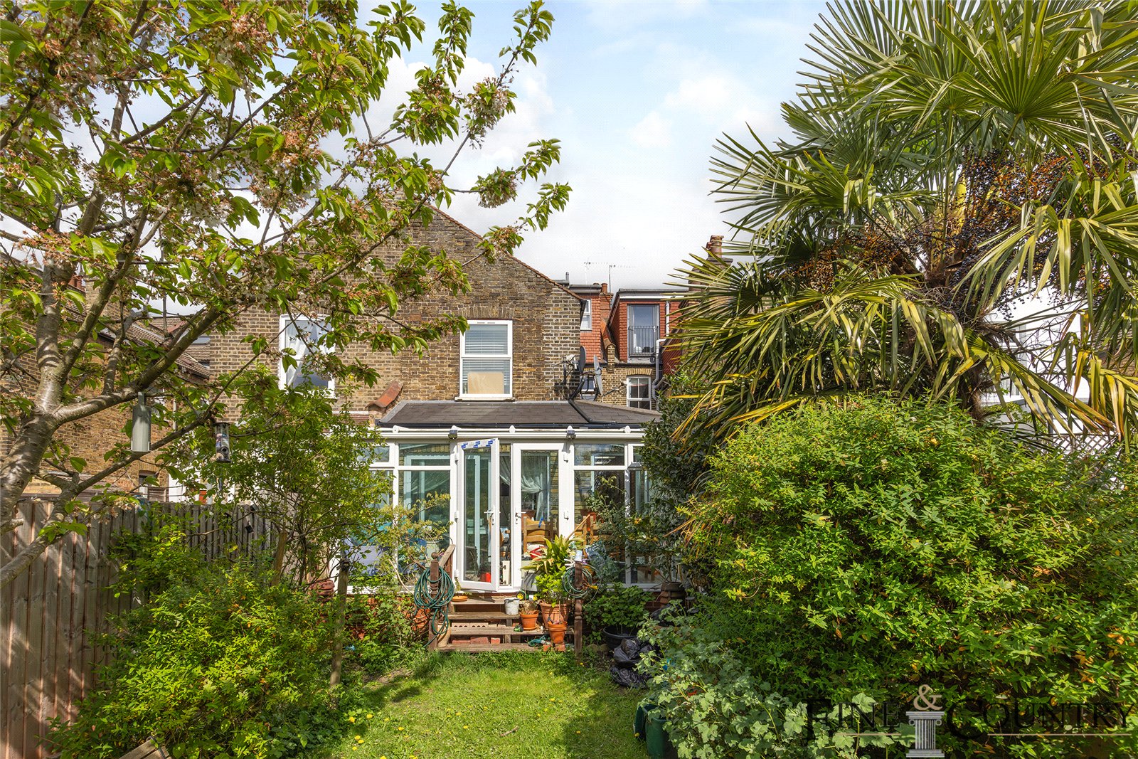 Stepping from the conservatory into the garden, you find a lush west-facing oasis of approximately 33 feet. Mature trees, leafy perennials and raised planting beds wrap the lawn, offering a natural sense of enclosure. There is ample space for outdoor dining or play, and the aspect ensures abundant afternoon and evening light.