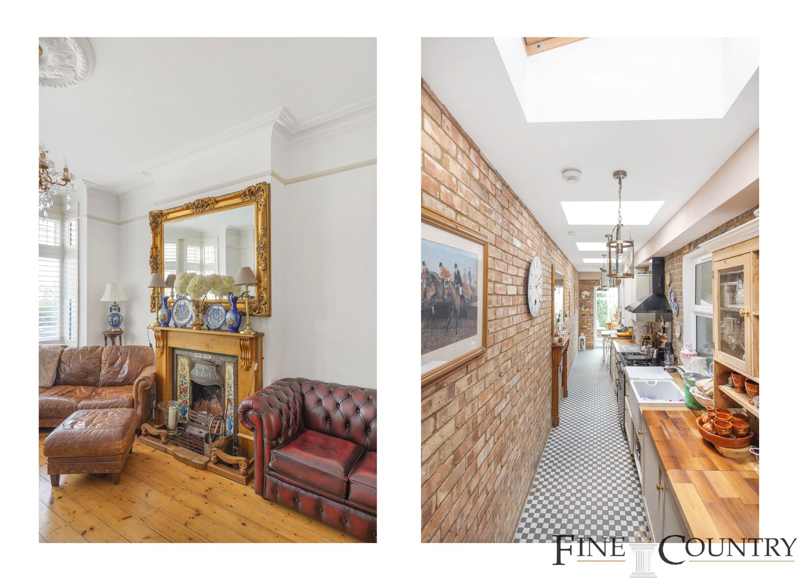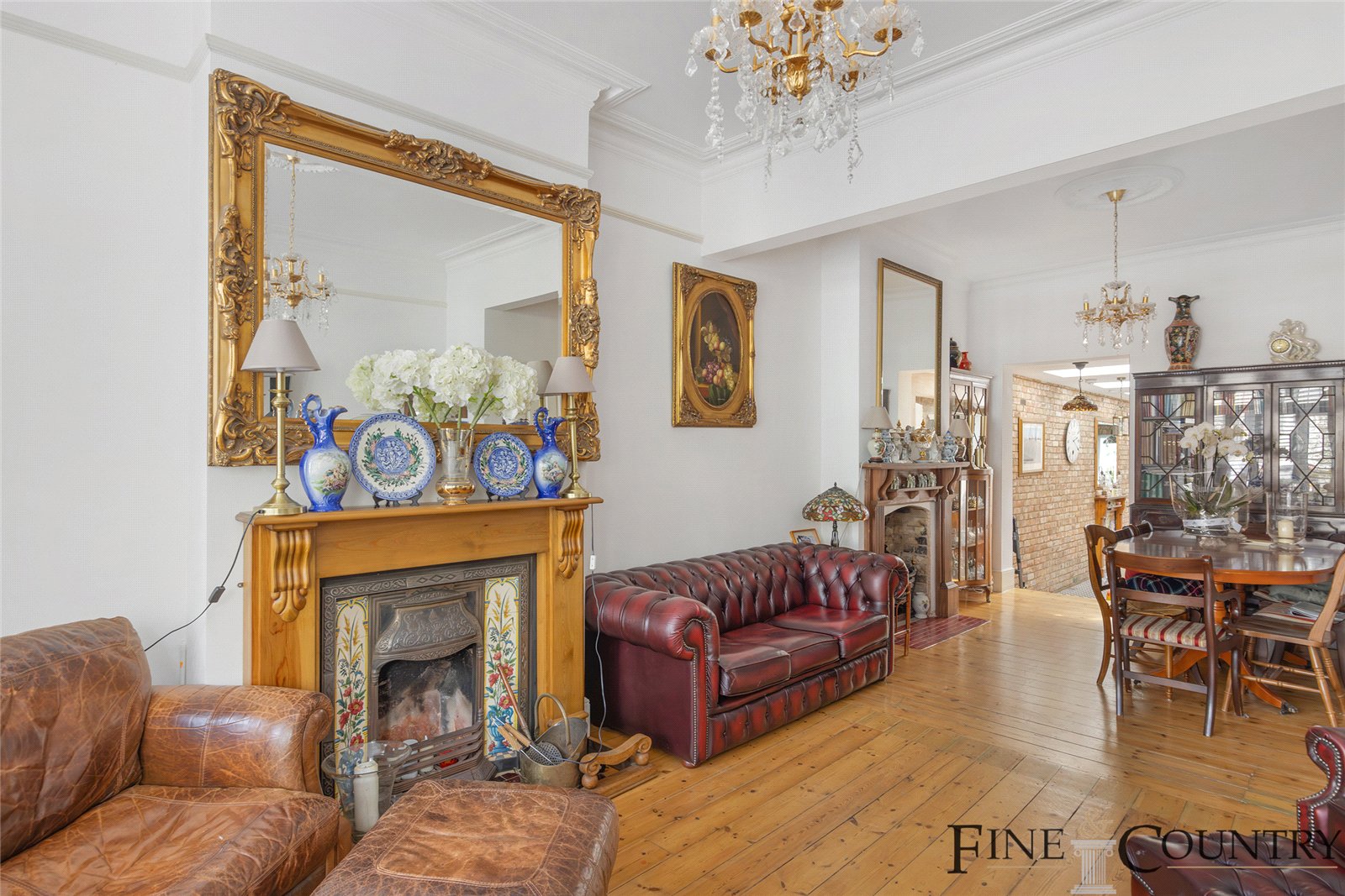 To the front, a full-width reception room features high ceilings, intricate plasterwork, and a striking carved fireplace with gilded mirror surround. The rear kitchen, fitted with rustic cabinetry, open shelving, and a butler sink, continues the homes artisanal character, enhanced by exposed brick and striking floor tiling. The space flows into a glass-roofed conservatory, filling the heart of the home with west-facing sunlight and garden views. Perfectly suited for entertaining, lounging or dining, this space fosters an organic connection with the garden beyond.