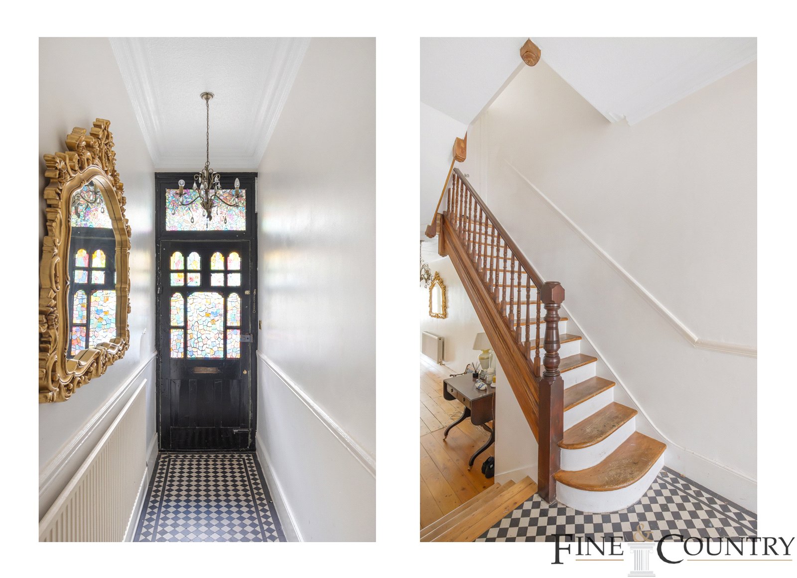 The ground floor opens via a stained-glass front door framed by an arched portico an exquisite prelude to the homes architectural narrative. The entrance hall is laid with monochrome tiles and lined with decorative coving, setting a tone of classic elegance. A gently curving original staircase with turned balusters rises above, drawing light from above and guiding movement upwards.