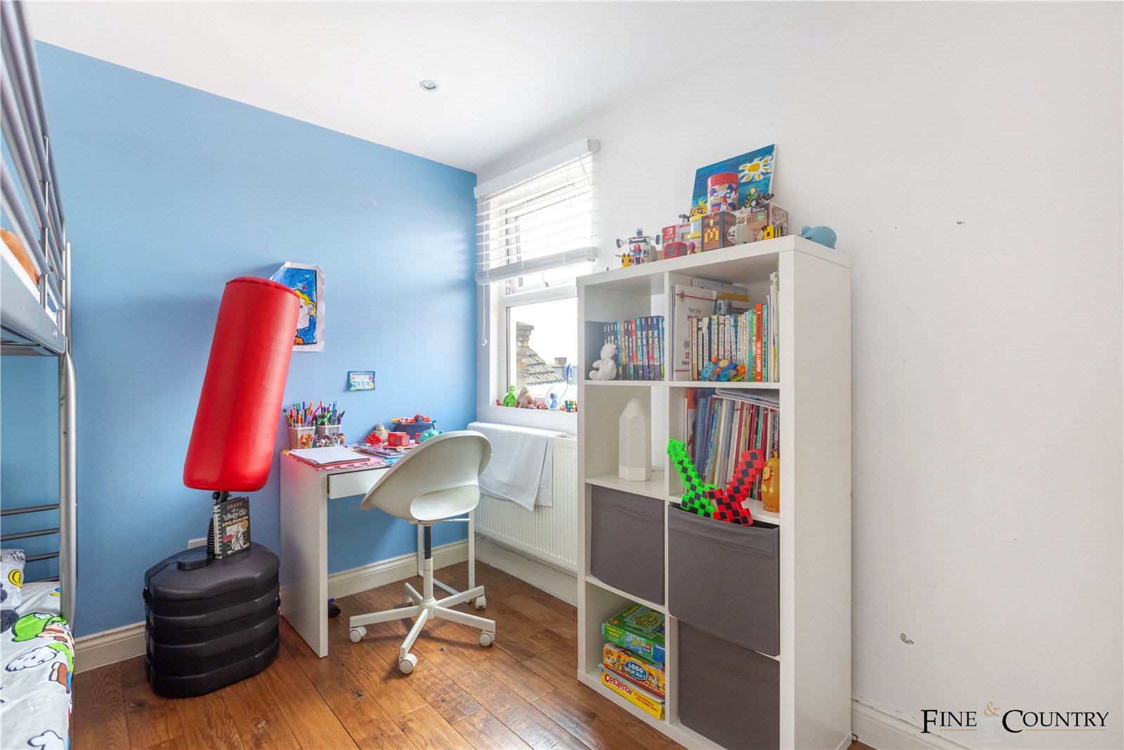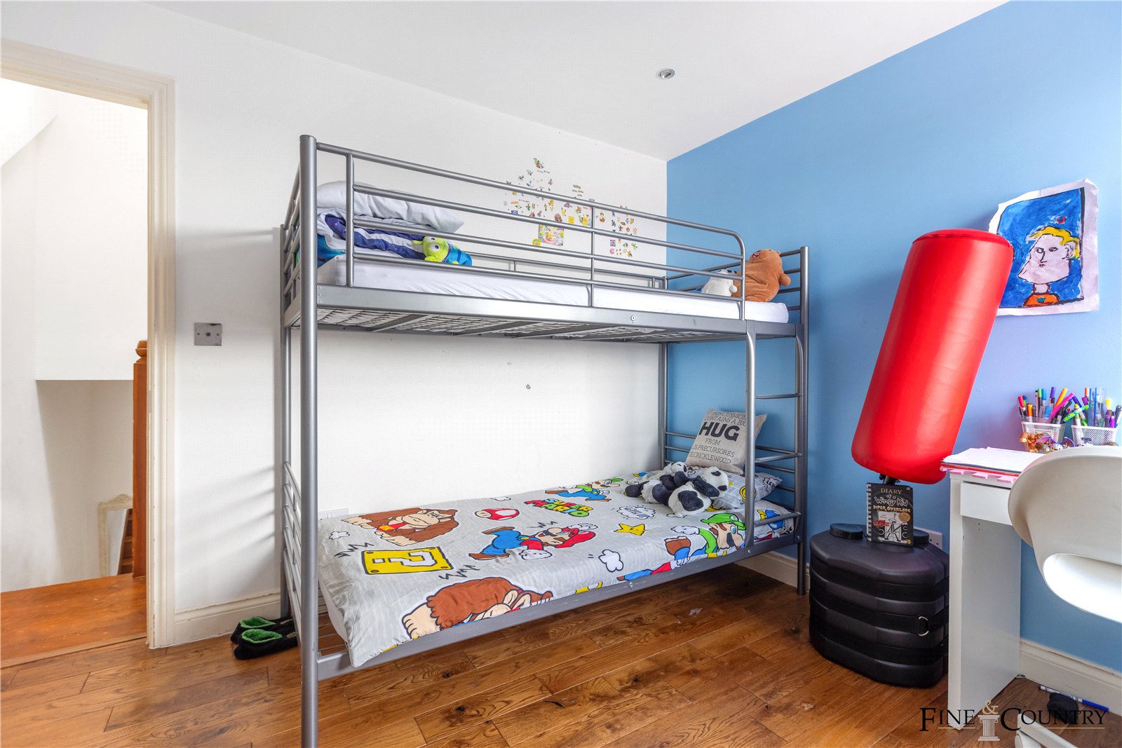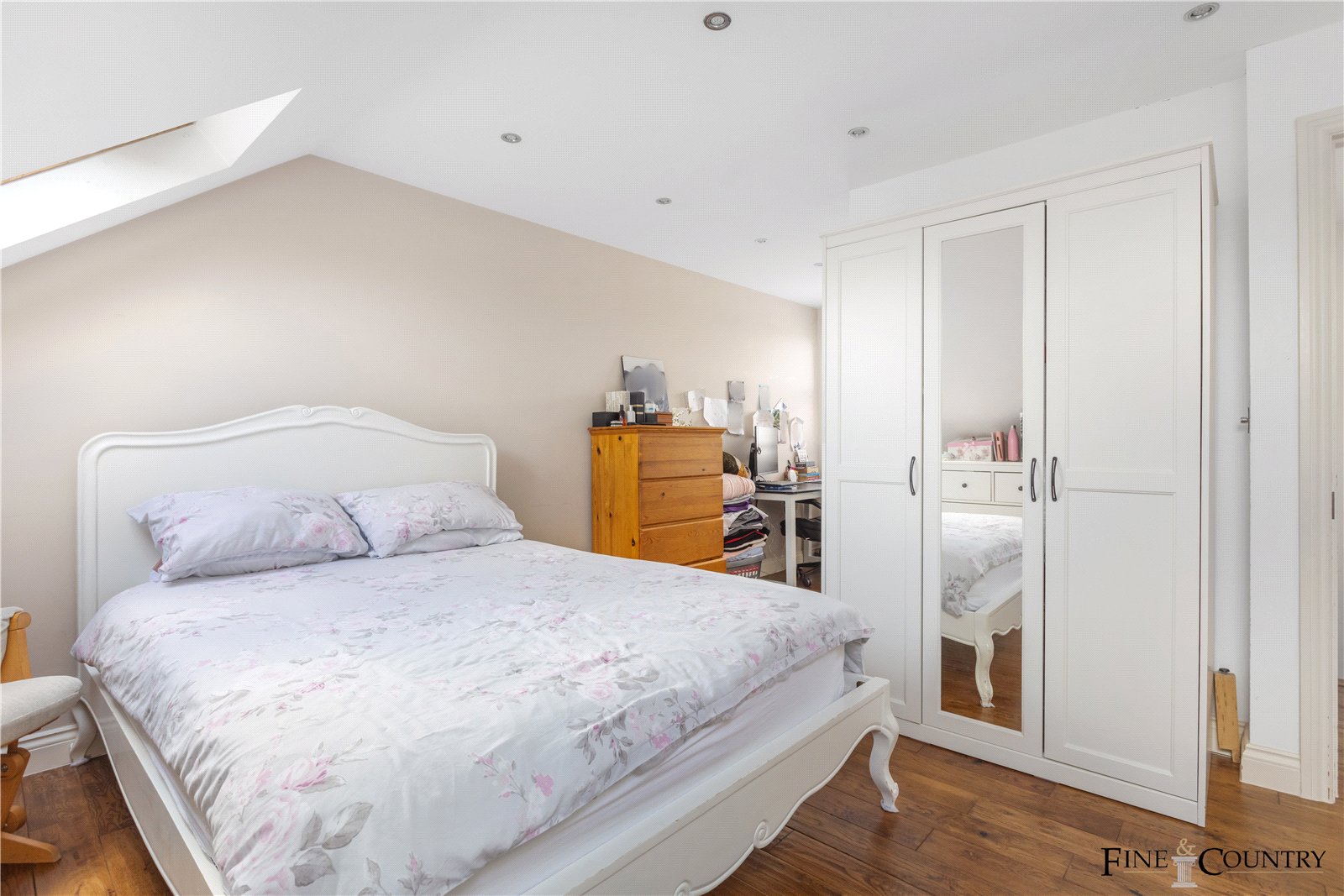 The top floor offers two further bedrooms set beneath sloped ceilings with Velux skylights. These rooms are thoughtfully designed to make the most of natural light and eaves storage, creating cosy and characterful spaces ideal for teens, studio work, or peaceful retreats. A third bathroom, tastefully tiled and naturally lit, completes the upper level.