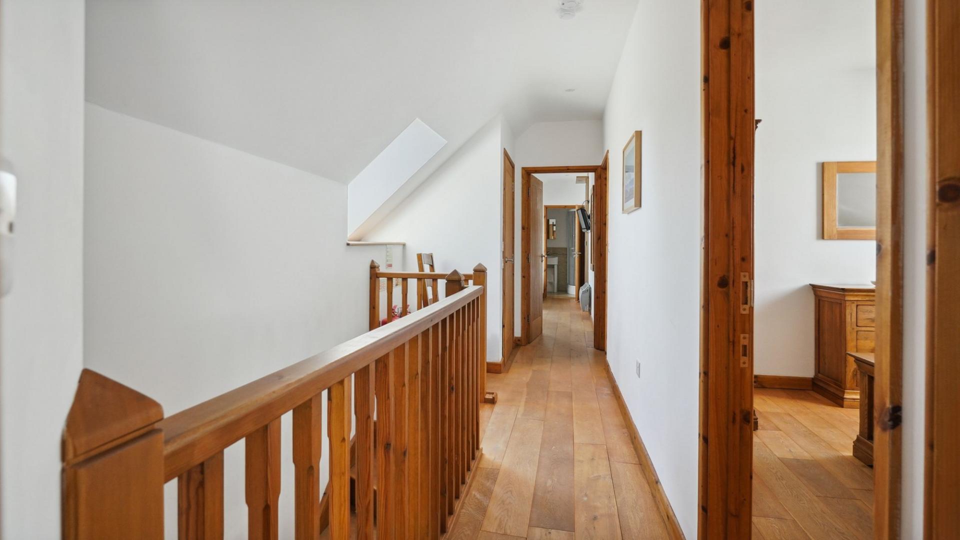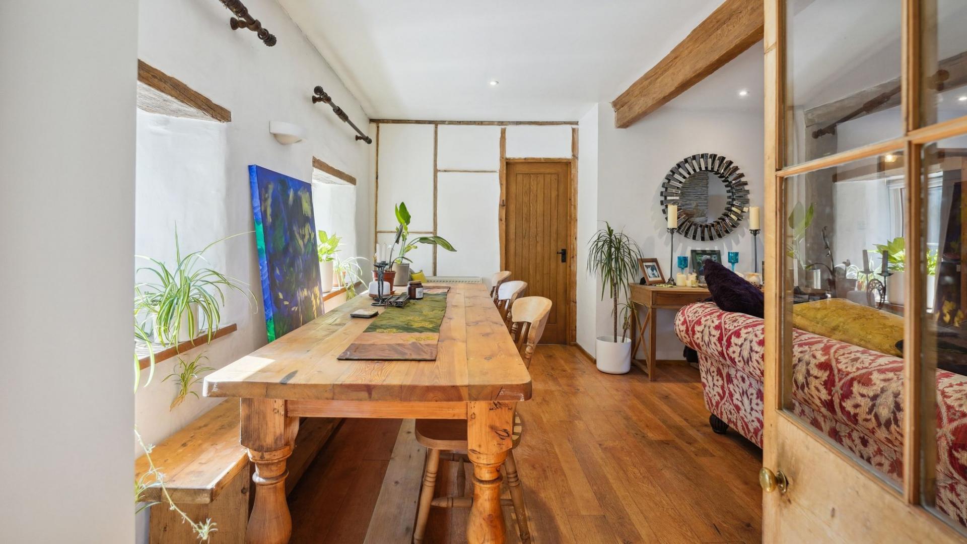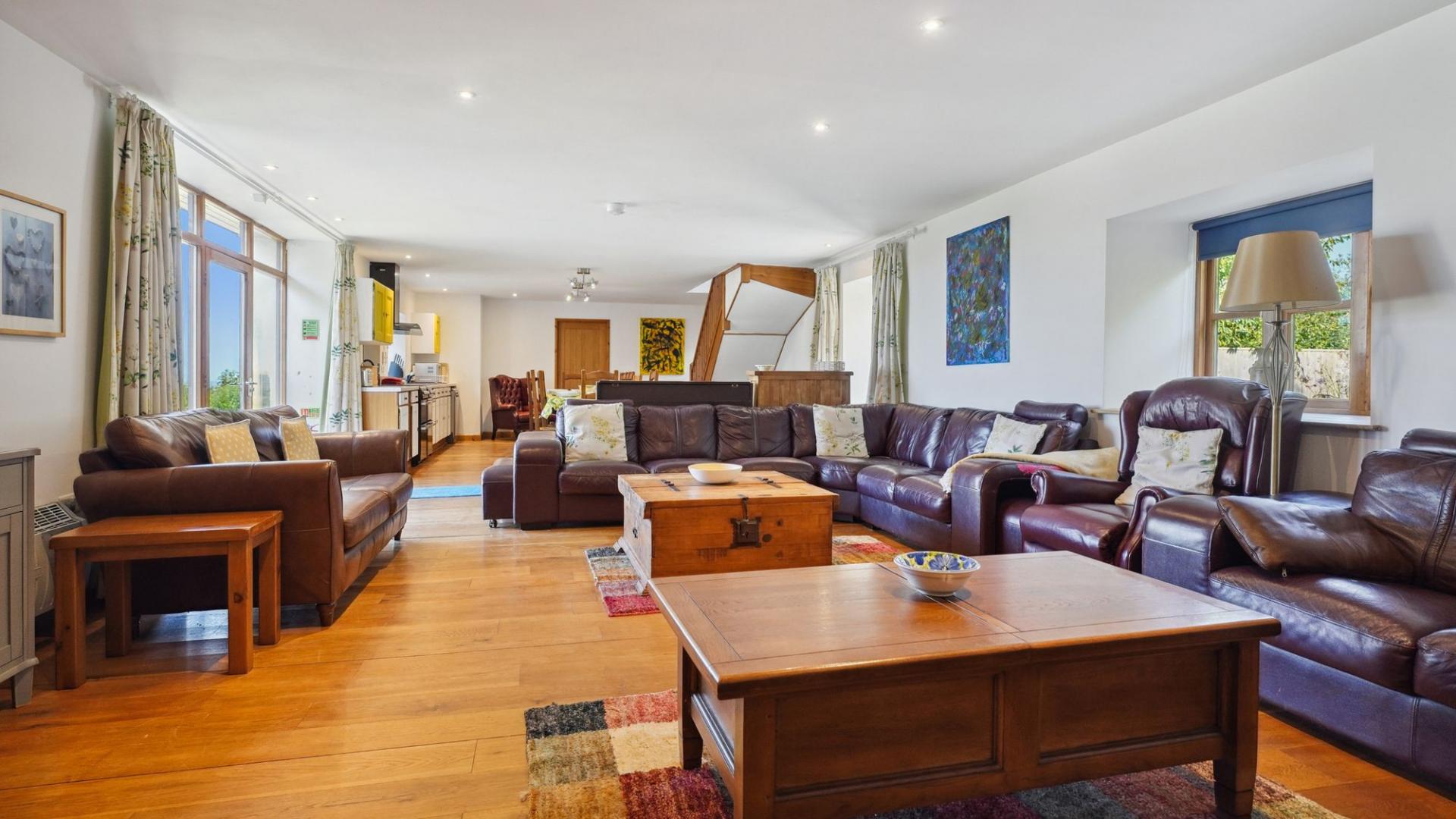 An impressive five-bedroom barn conversion with an expansive 44' x 16' open-plan living area featuring a wood-burning stove and five en-suite bedrooms. This residence embodies a perfect blend of rustic charm and modern comfort.