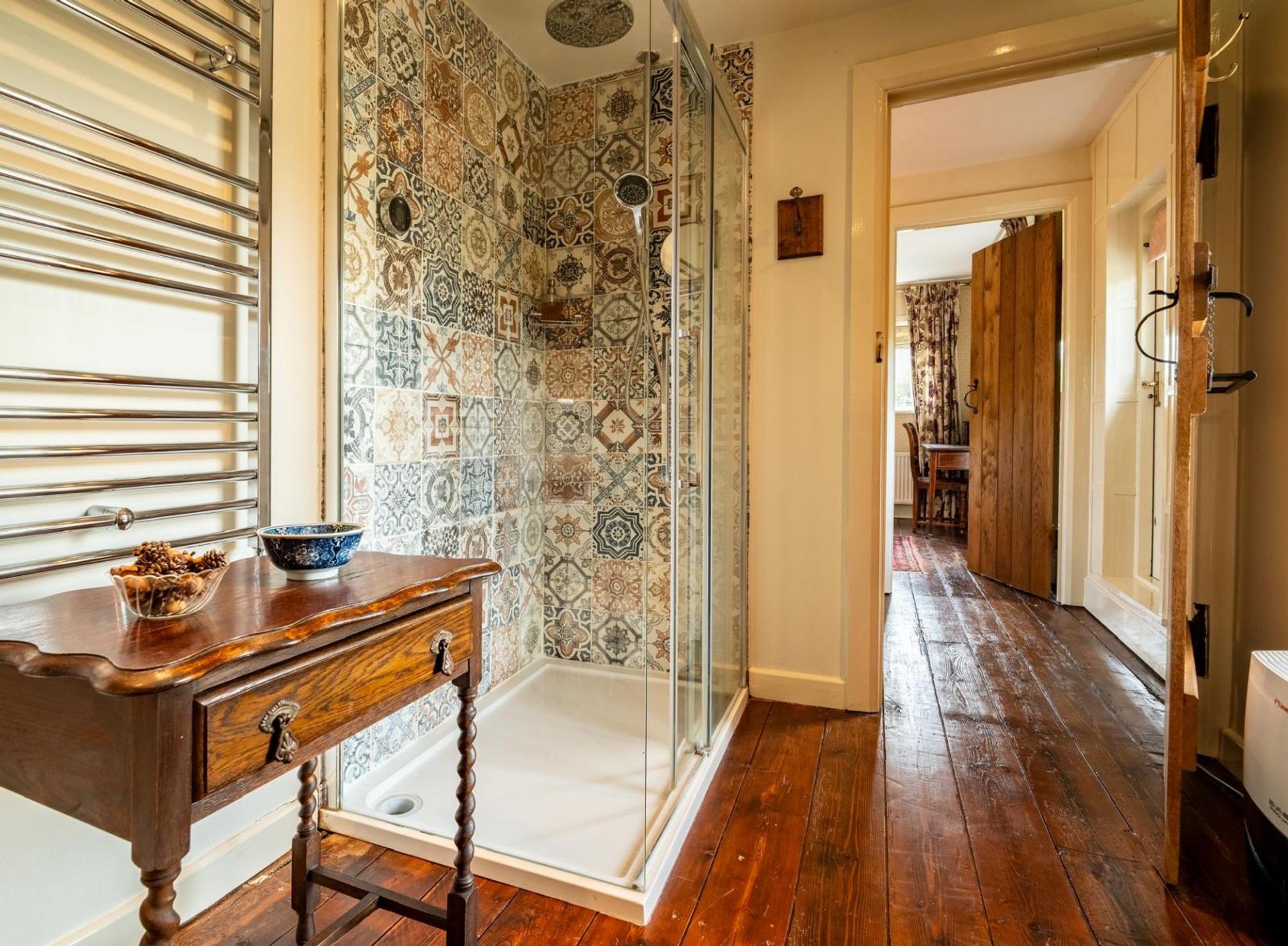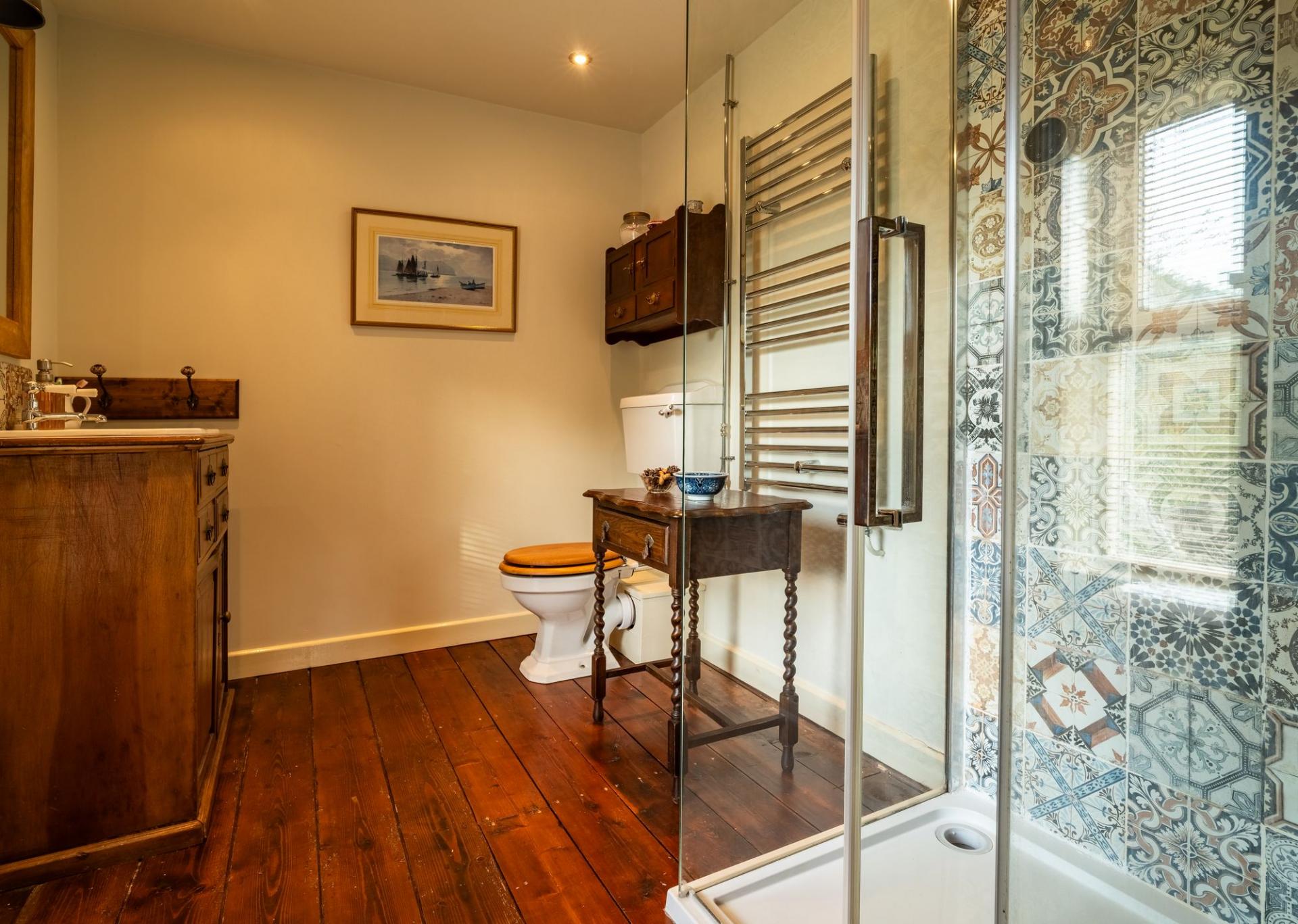 Fitted with a Mira shower, toilet, vanity unit, and wall-mounted radiator.