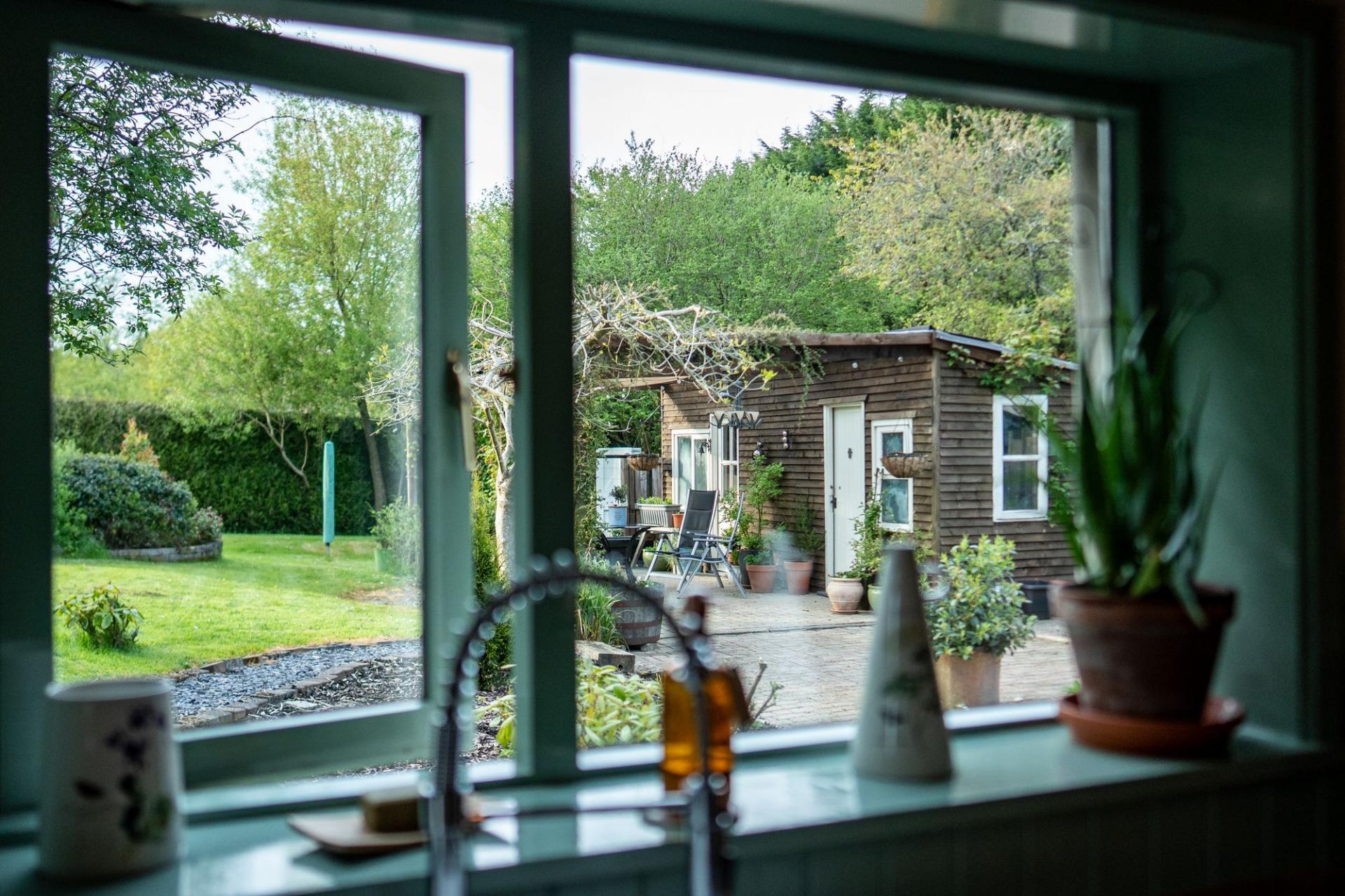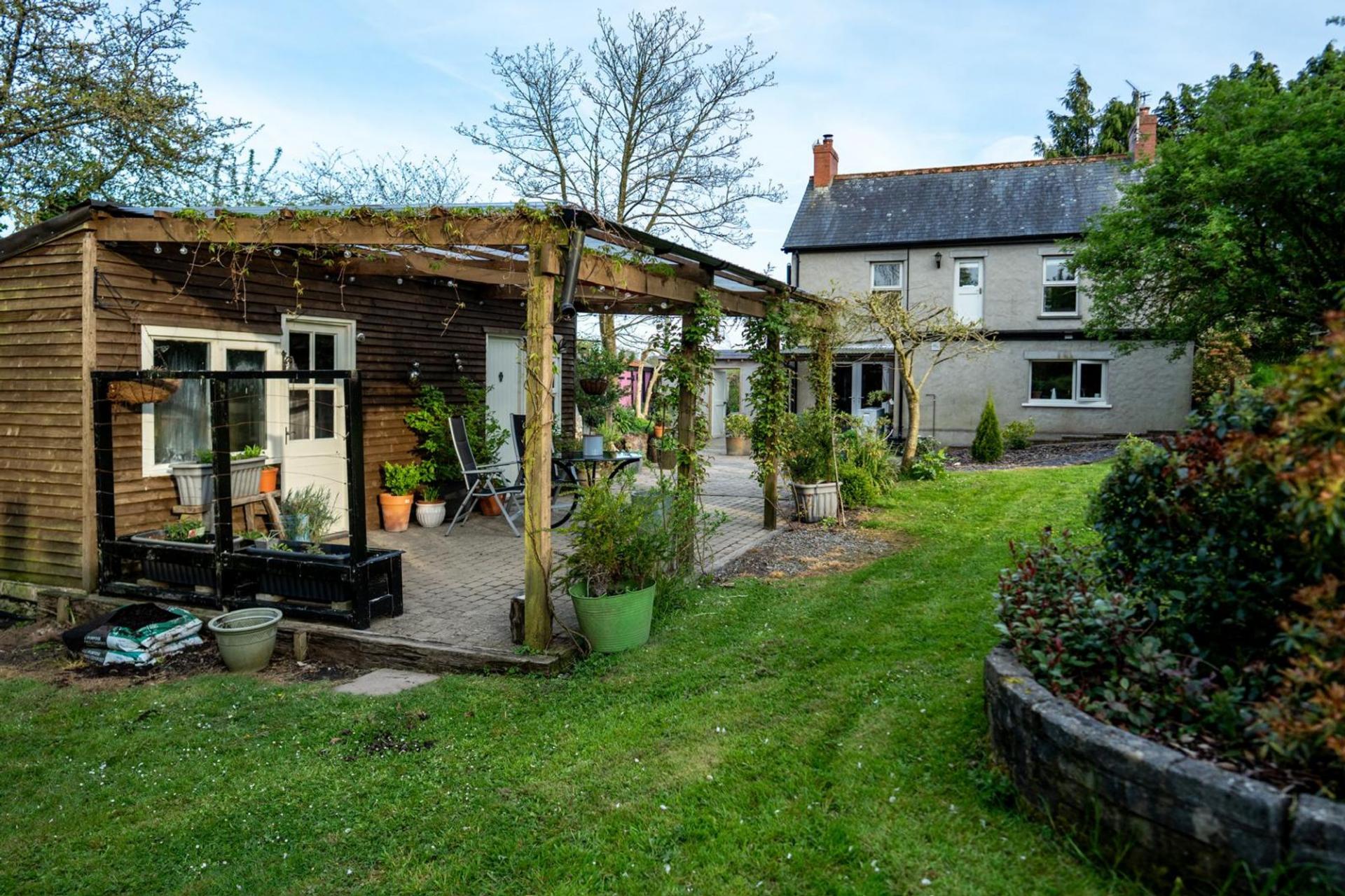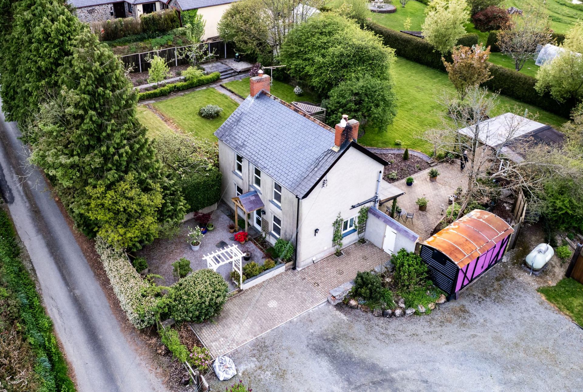 Sitting on just under an acre, the grounds have been lovingly landscaped and planted with mature fruit trees including apple, pear, plum, and cherry. Several bespoke outbuildings offer versatile space for hobbies, storage, or further development. A separate enclosed paddock houses a static caravan connected to mains water, electricity, and private drainage—perfect for guests, workspace, or a variety of alternative uses.