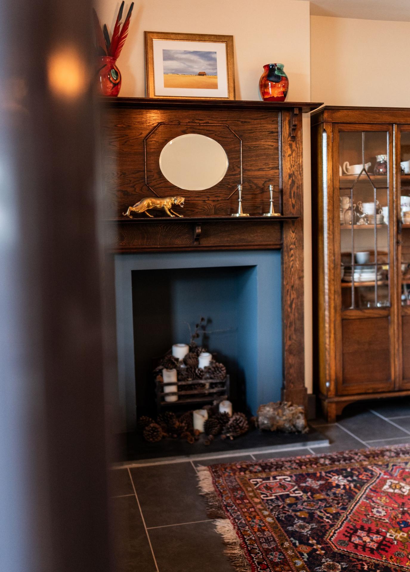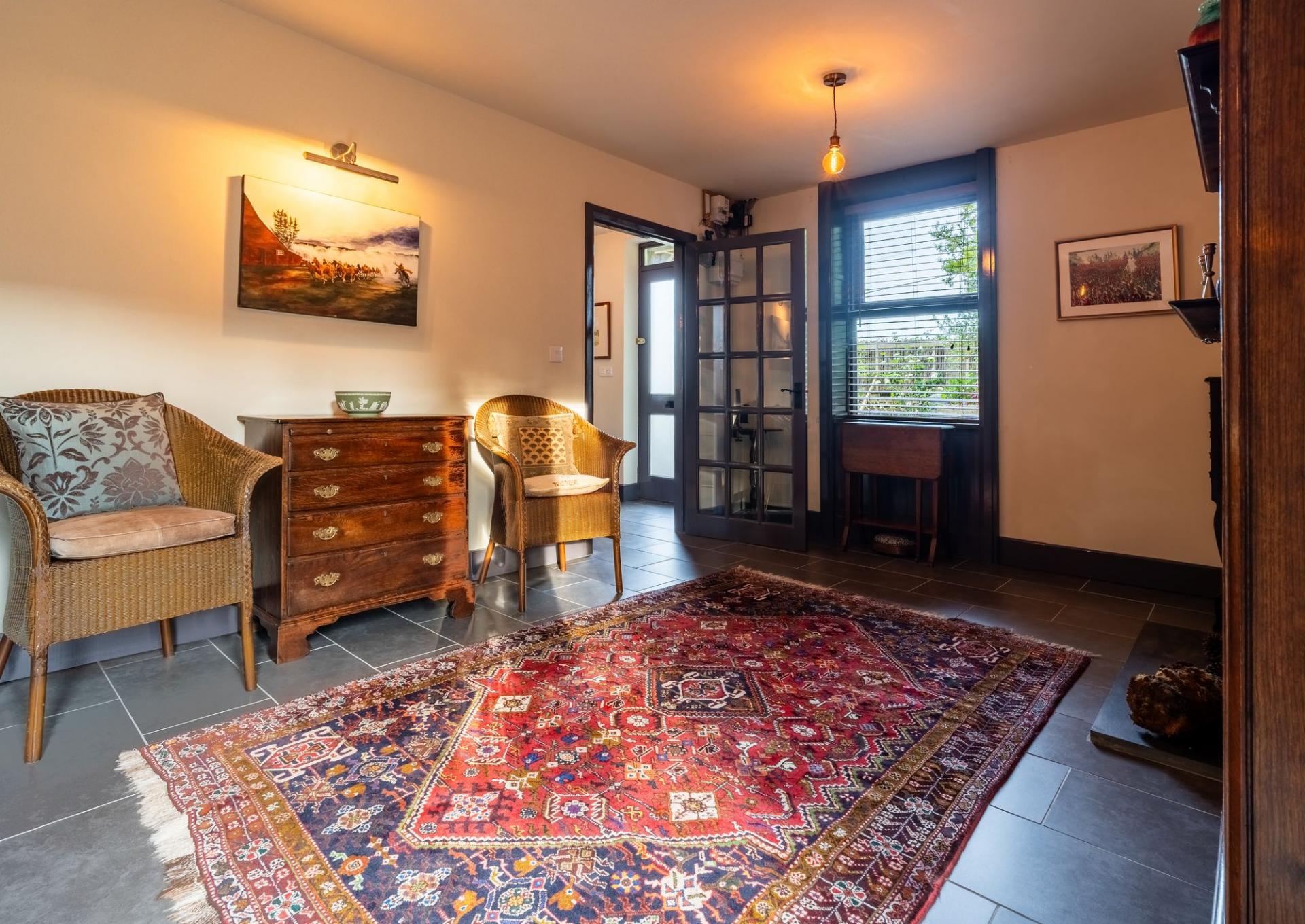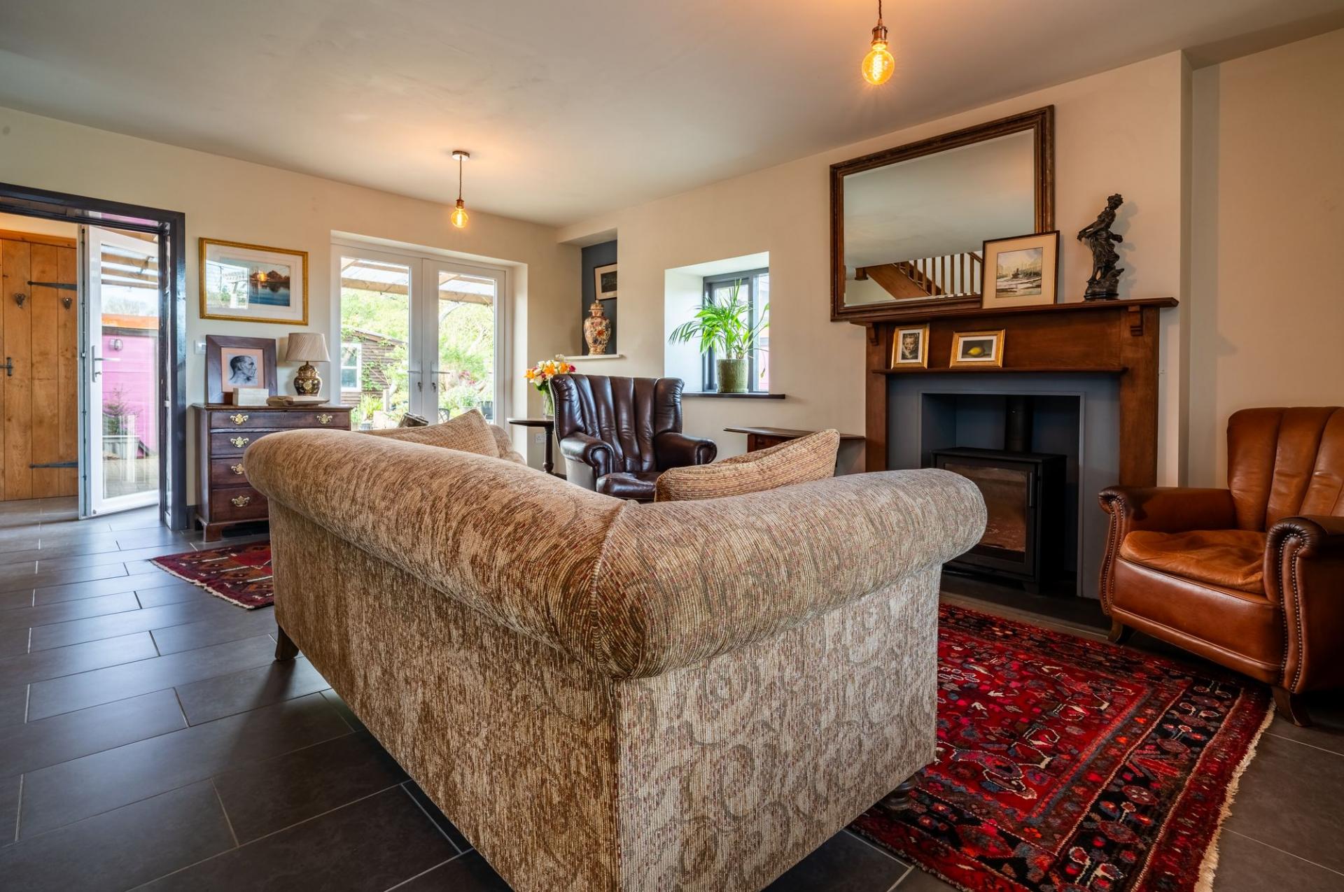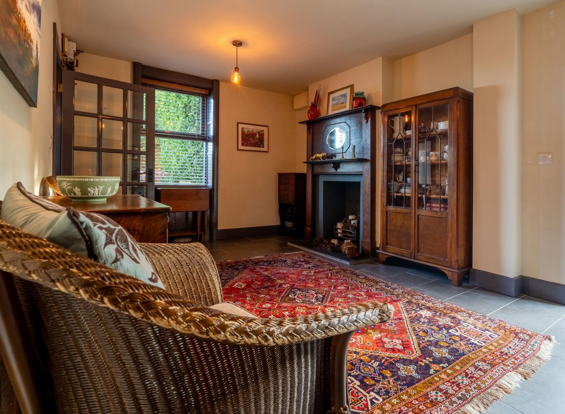 Front door opens directly into the living area. Features a working fireplace, underfloor heating, a front-facing window, and French doors opening to the rear. The staircase is located within this room.