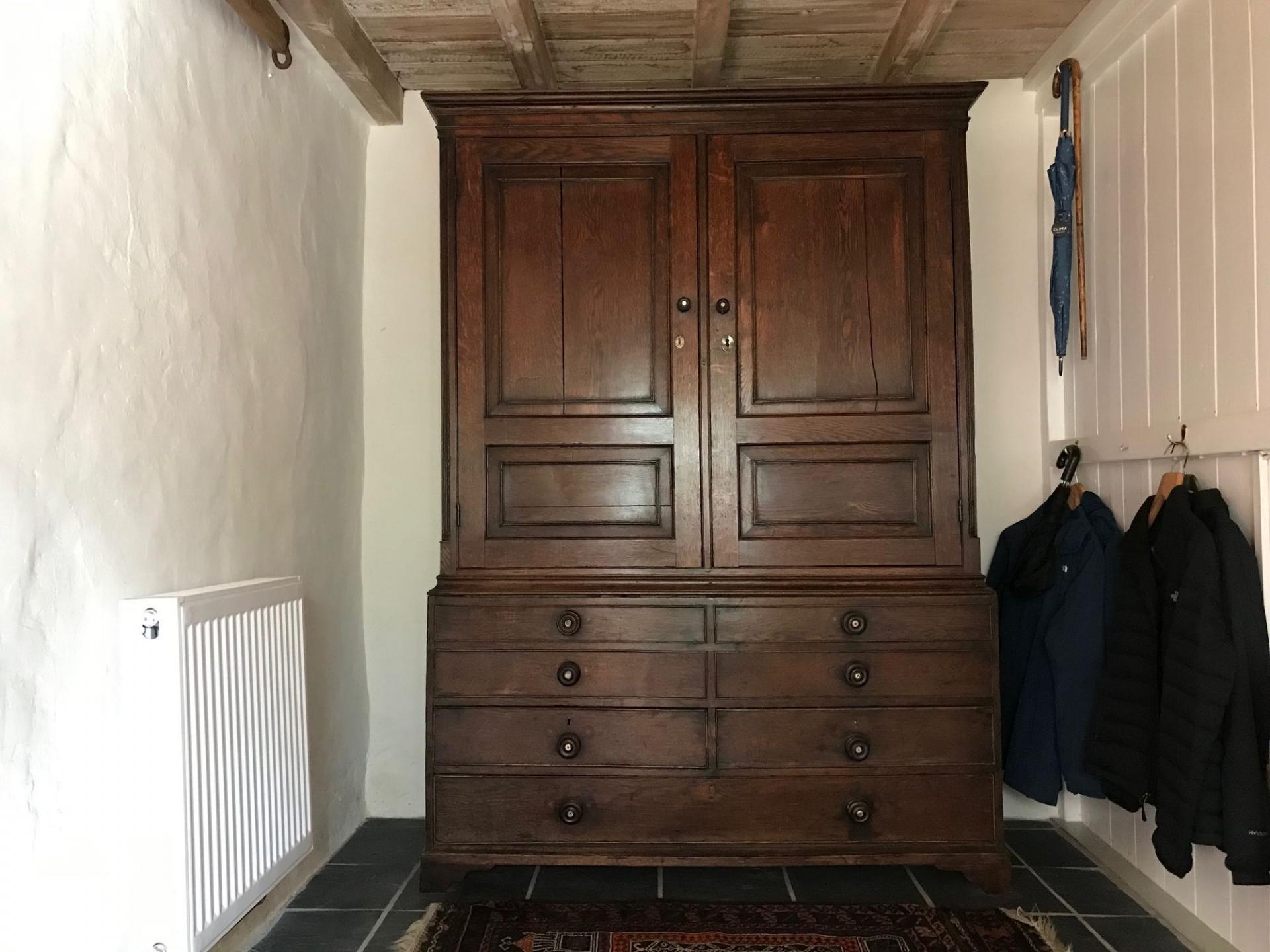 Front-aspect with slate tile floor, beam ceiling, night storage heater, and meter/fuse cupboard with a single-glazed window.