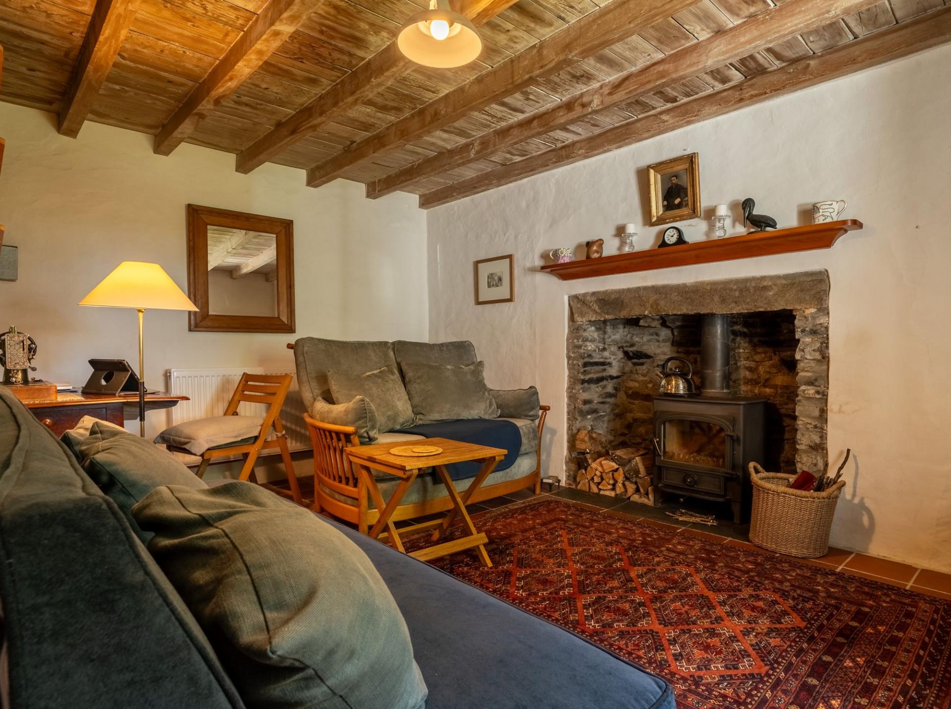 Front-facing room with replacement single-glazed window, a replica of the original made by Aberystwyth craftsman Iolo Wigley. Wood-burning stove, beamed ceiling, and original quartile flooring. Stairs to first floor and under-stairs cupboard.