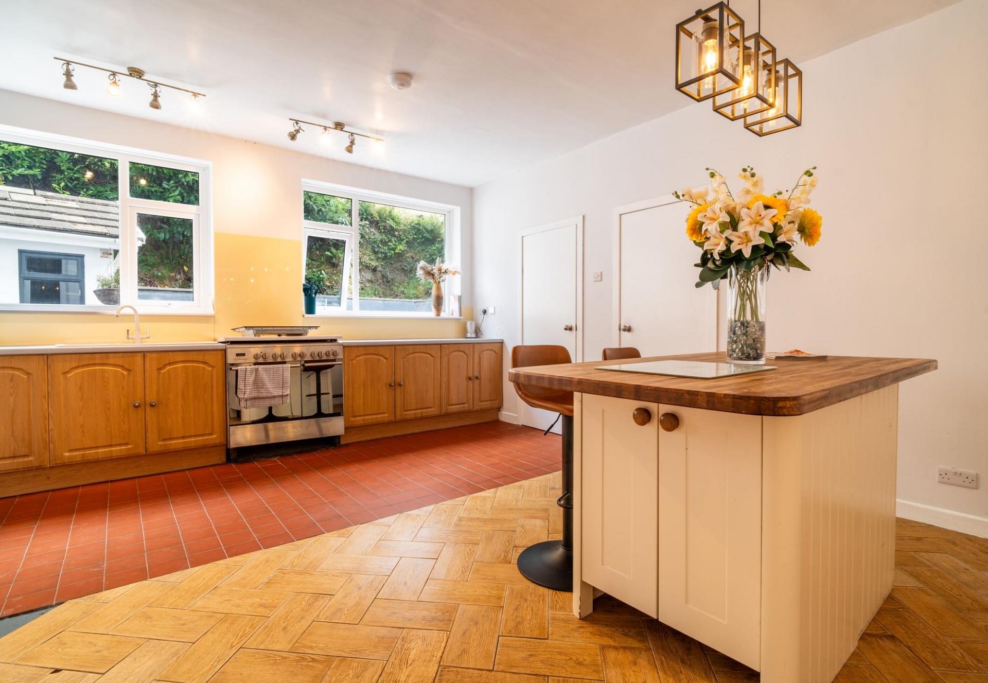Large family friendly kitchen with central island, range of fitted units with sink, Range cooker, tiled floor, radiators, and two incredibly useful pantries – one for utility / white goods and one walk in storage pantry