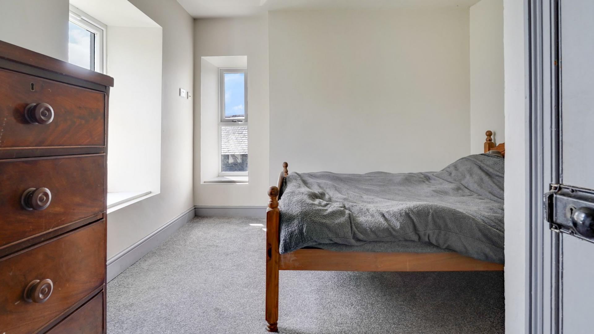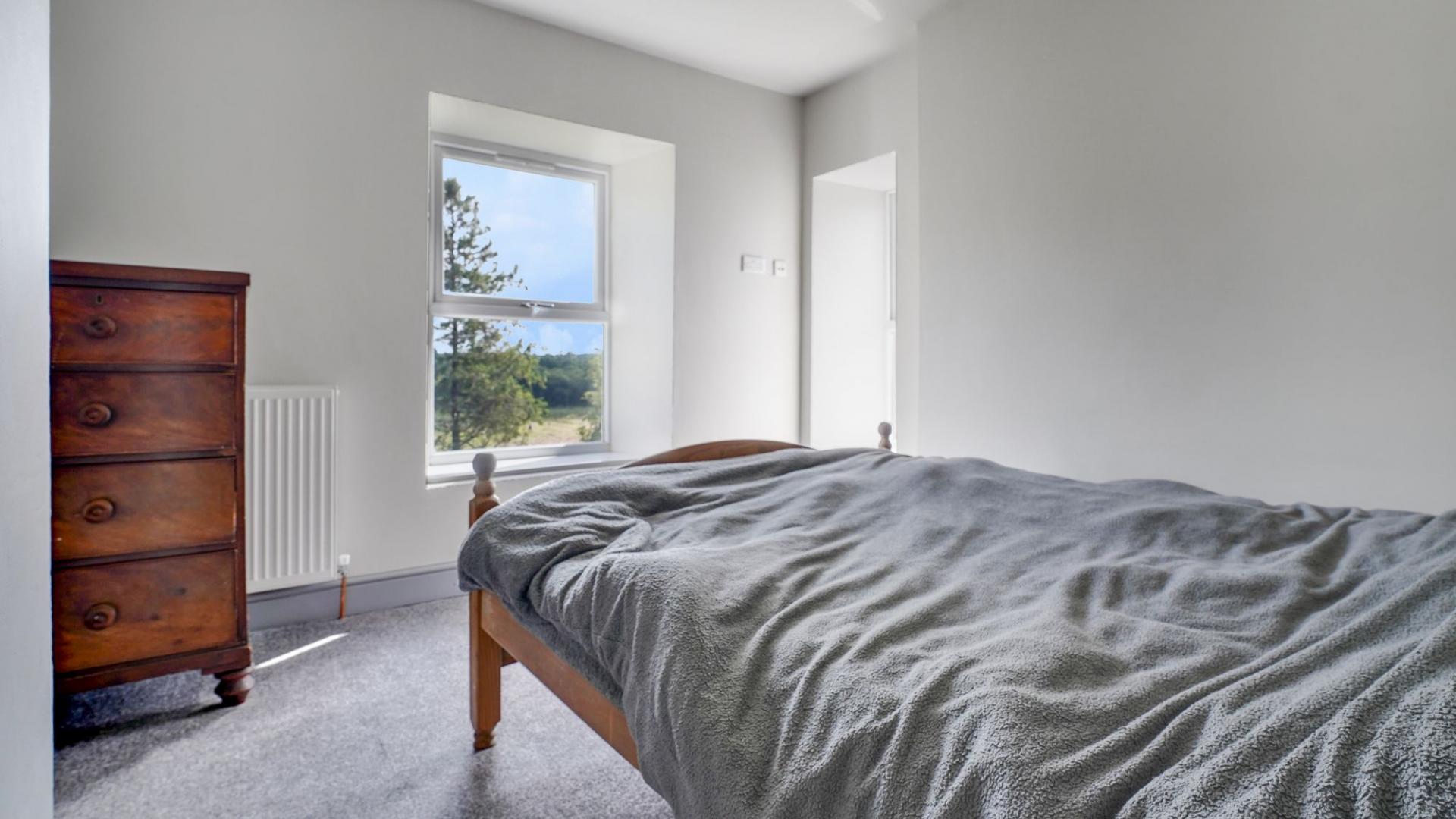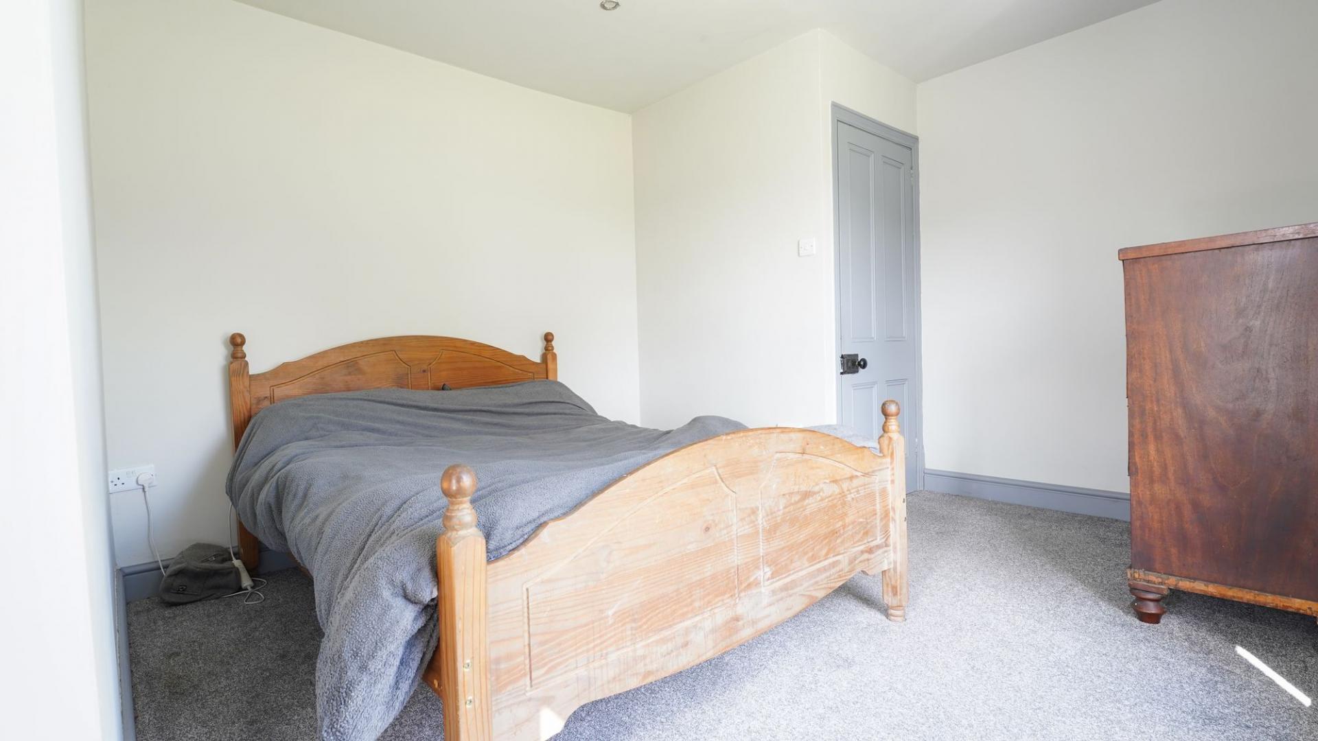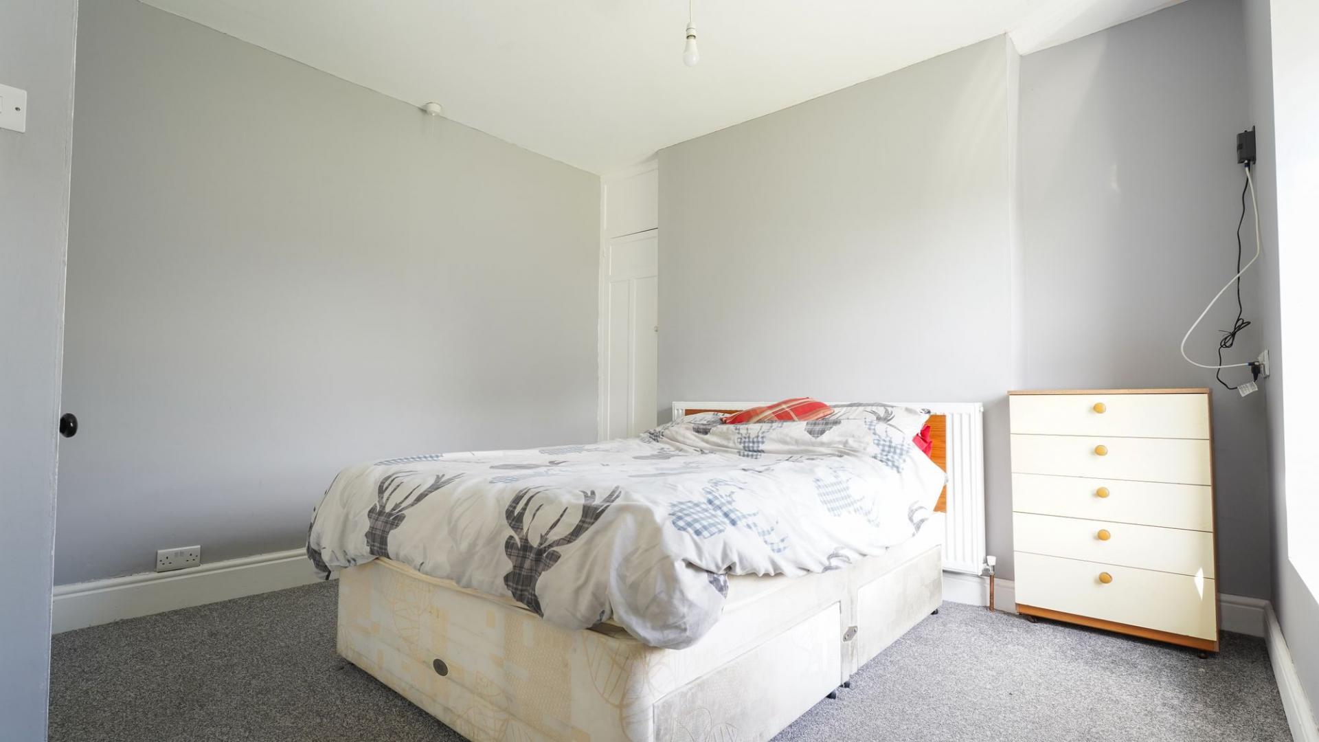 A spacious double bedroom with windows to the front and side. Includes two power points and a double panel radiator.