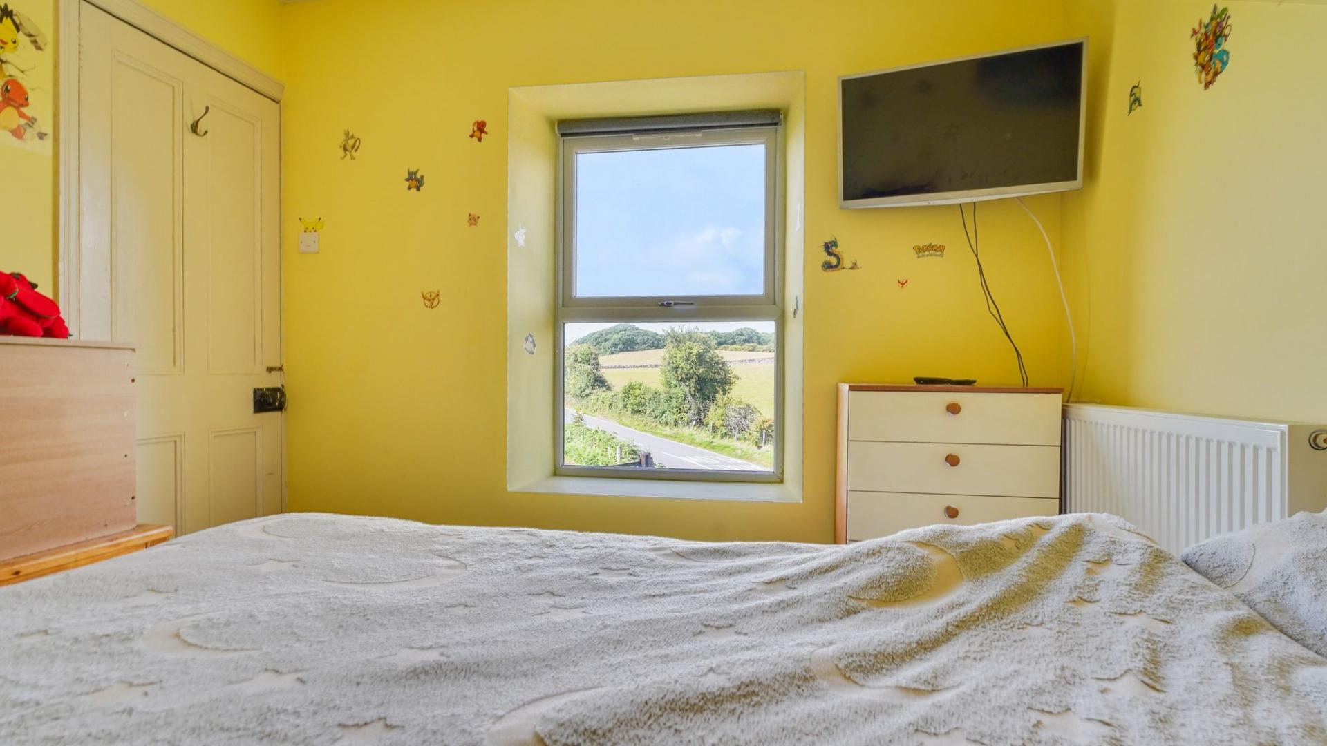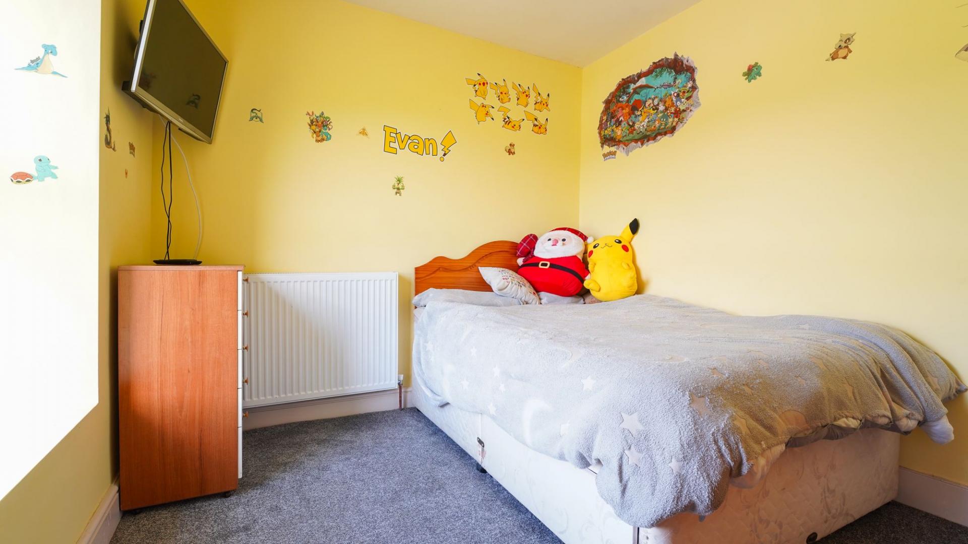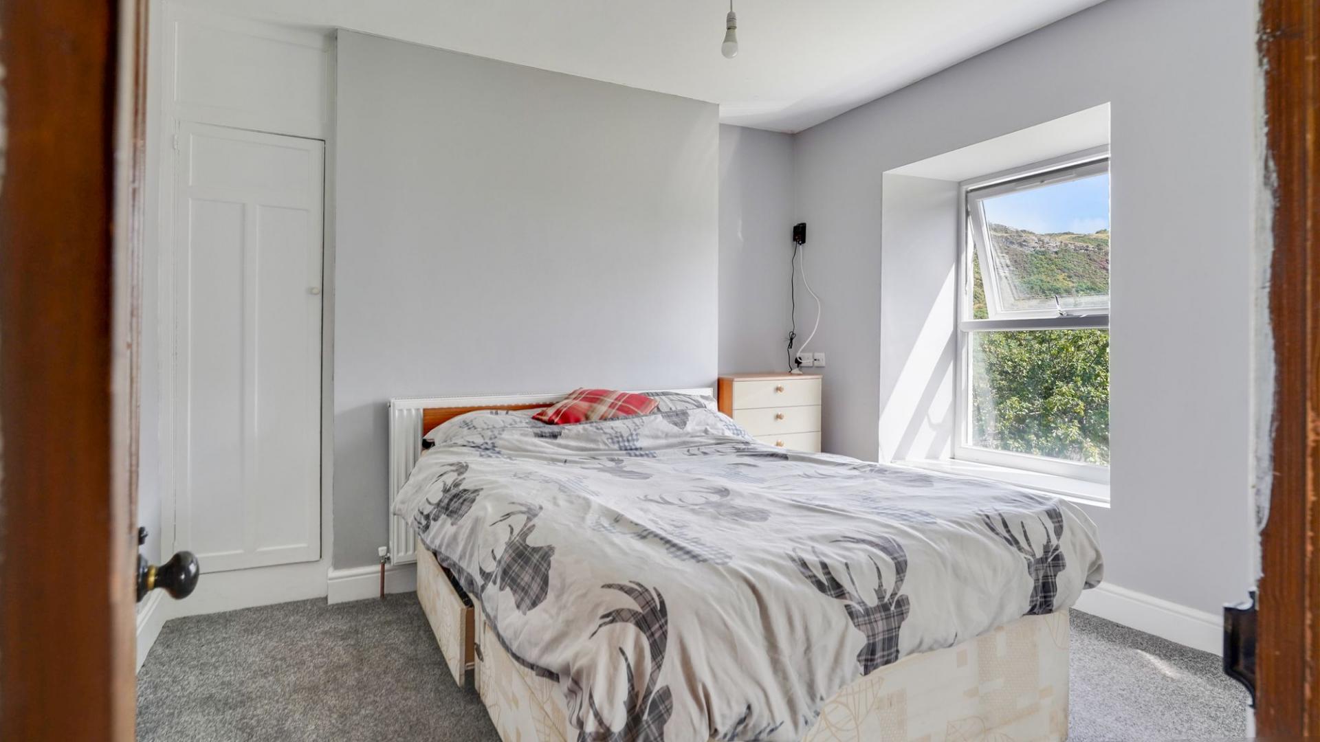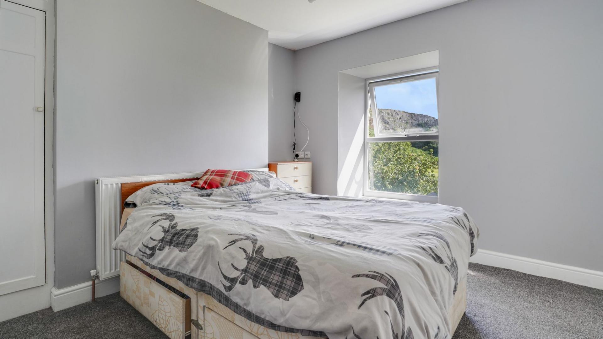 A spacious double bedroom with windows to the front and side. Includes two power points and a double panel radiator.