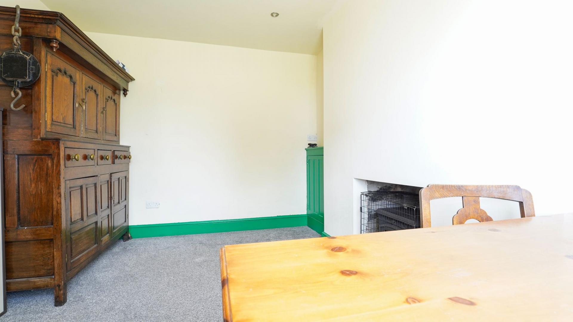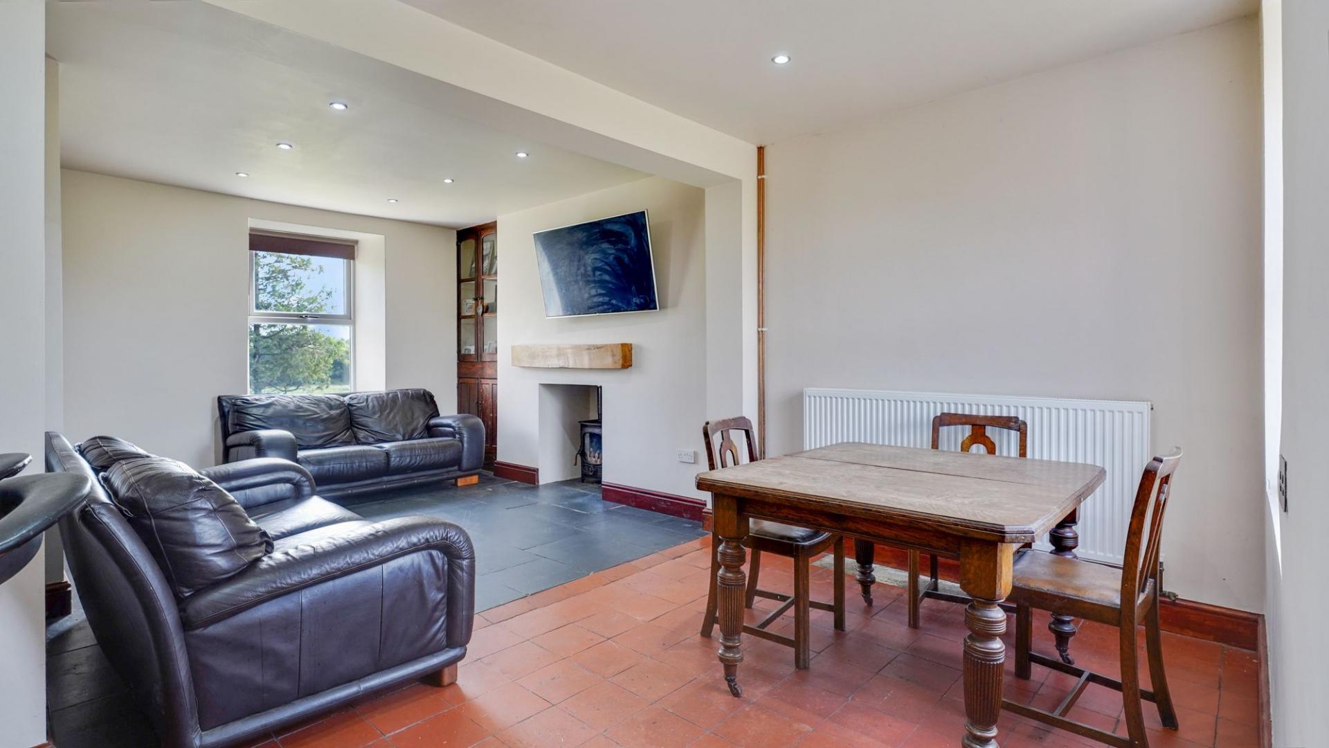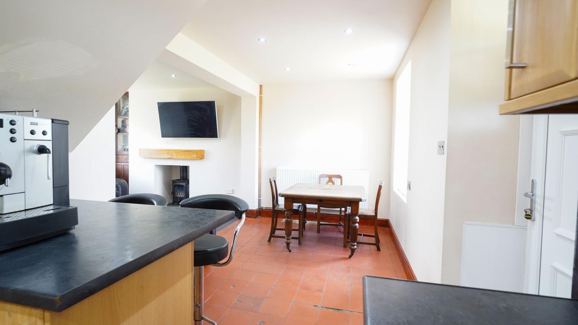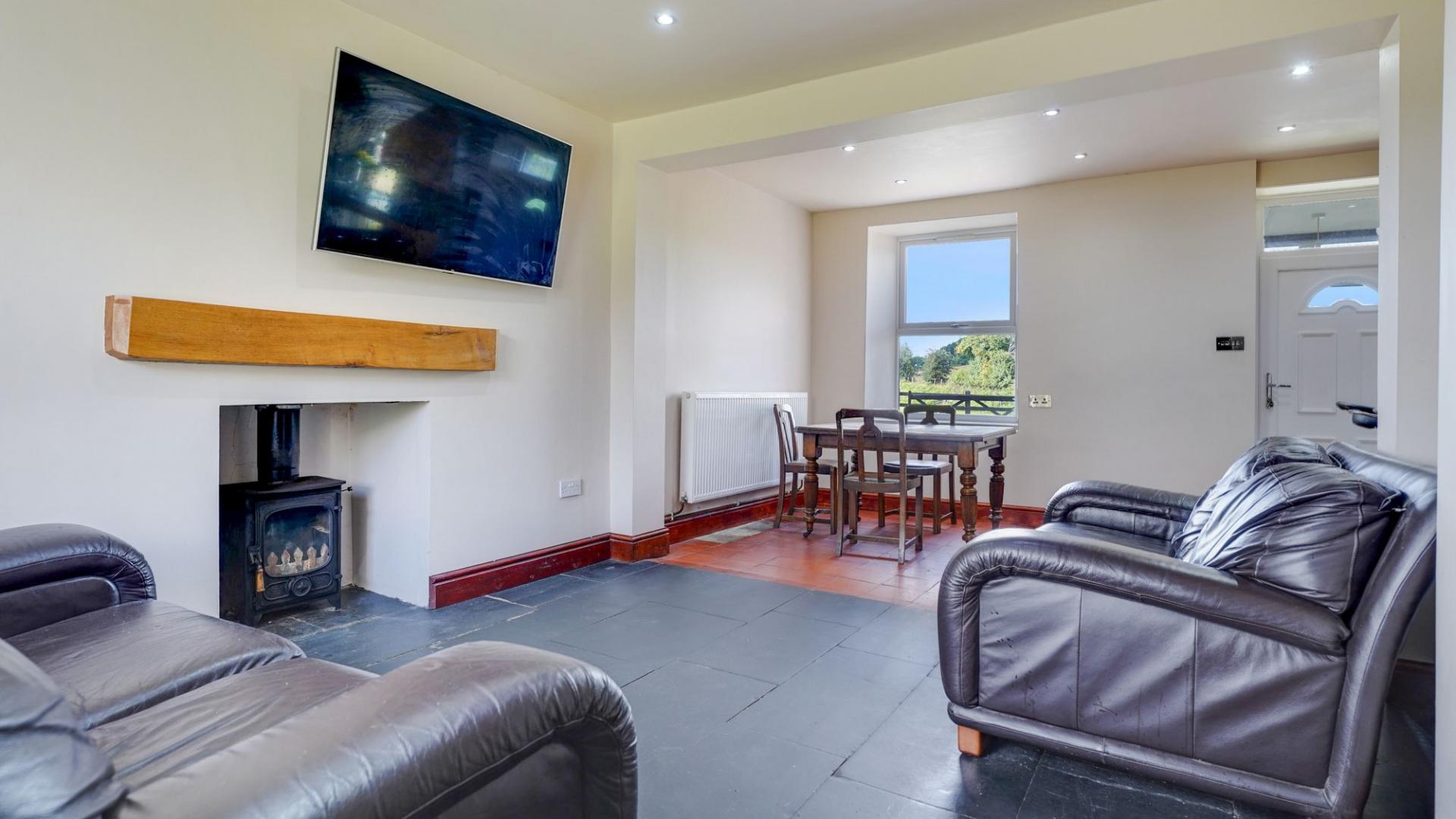 A spacious and light-filled room with windows to both the front and rear elevations. Includes two double panel radiators, a feature log-burning stove, multiple power points, and a built-in alcove cupboard. The dining area flows seamlessly into the kitchen and has access to the rear porch.