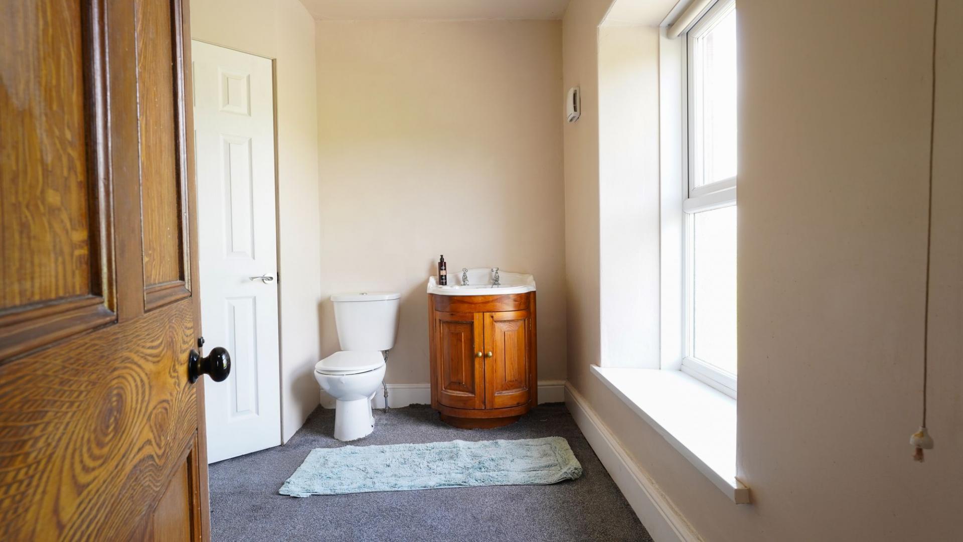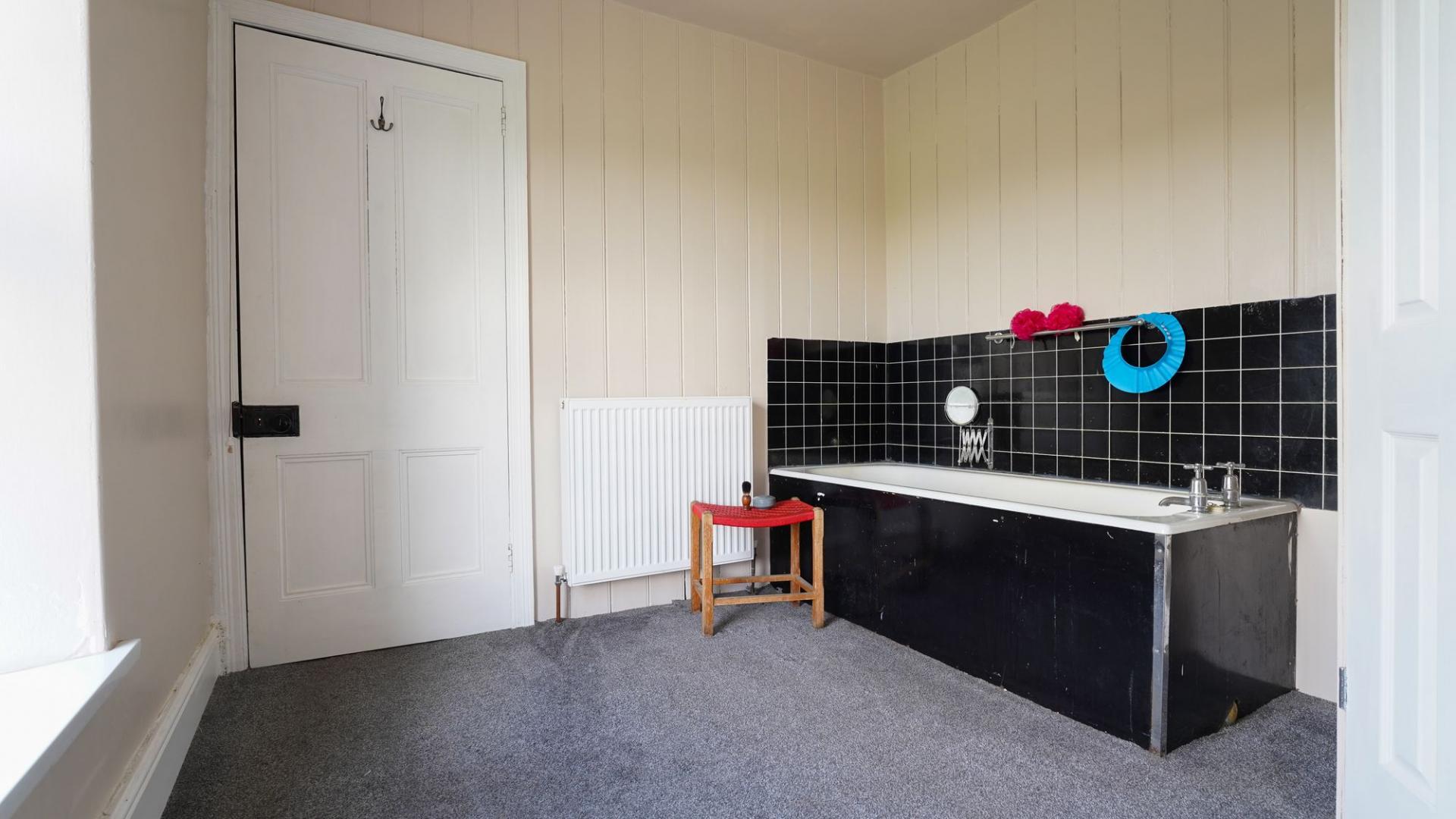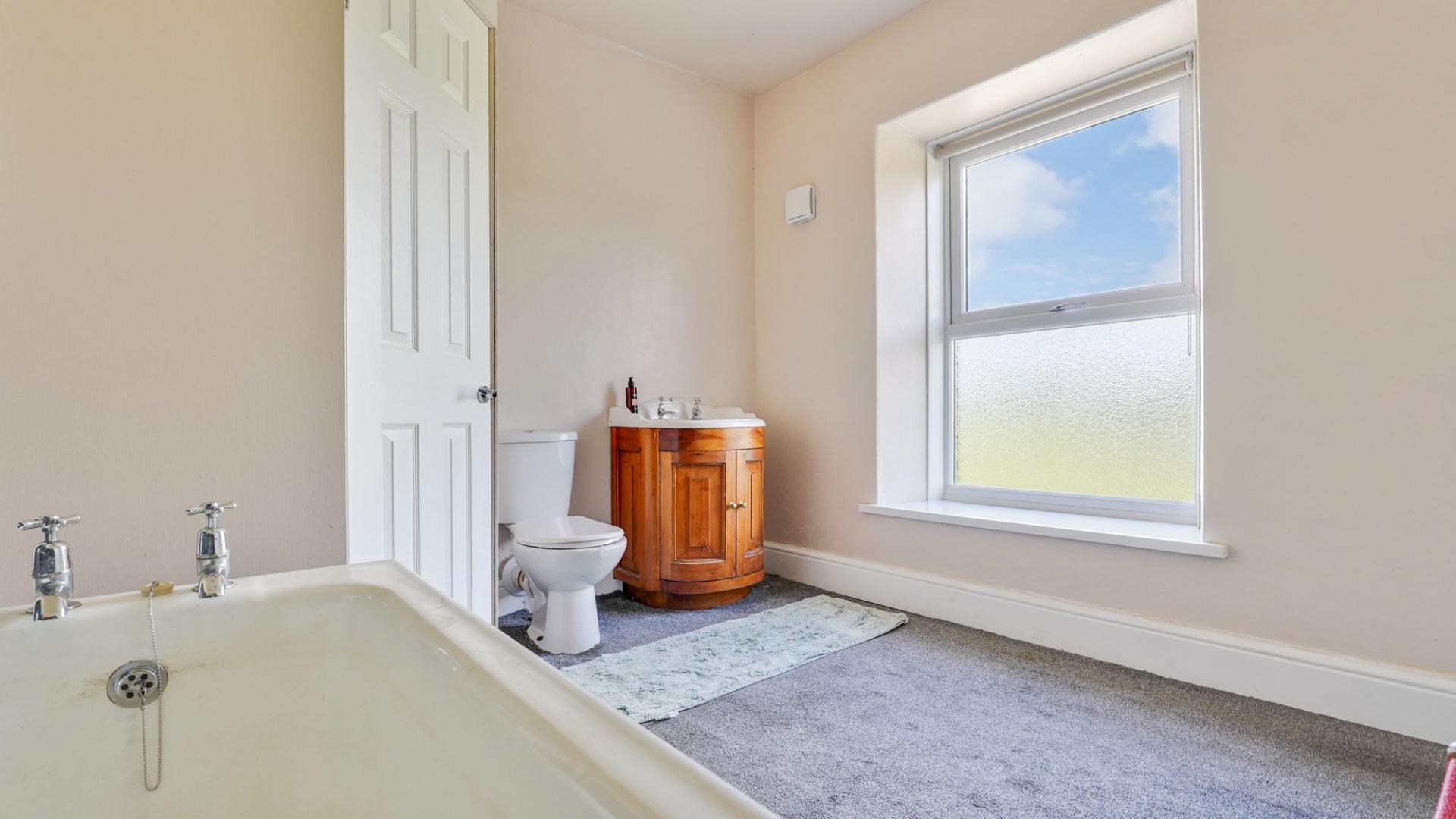 Fitted with a panelled bath, low-flush WC, and vanity-style wash hand basin. Window to the rear and a double panel radiator.