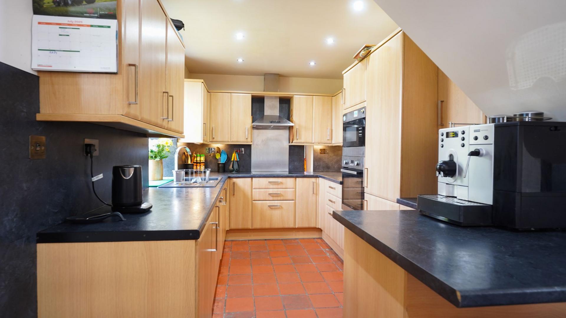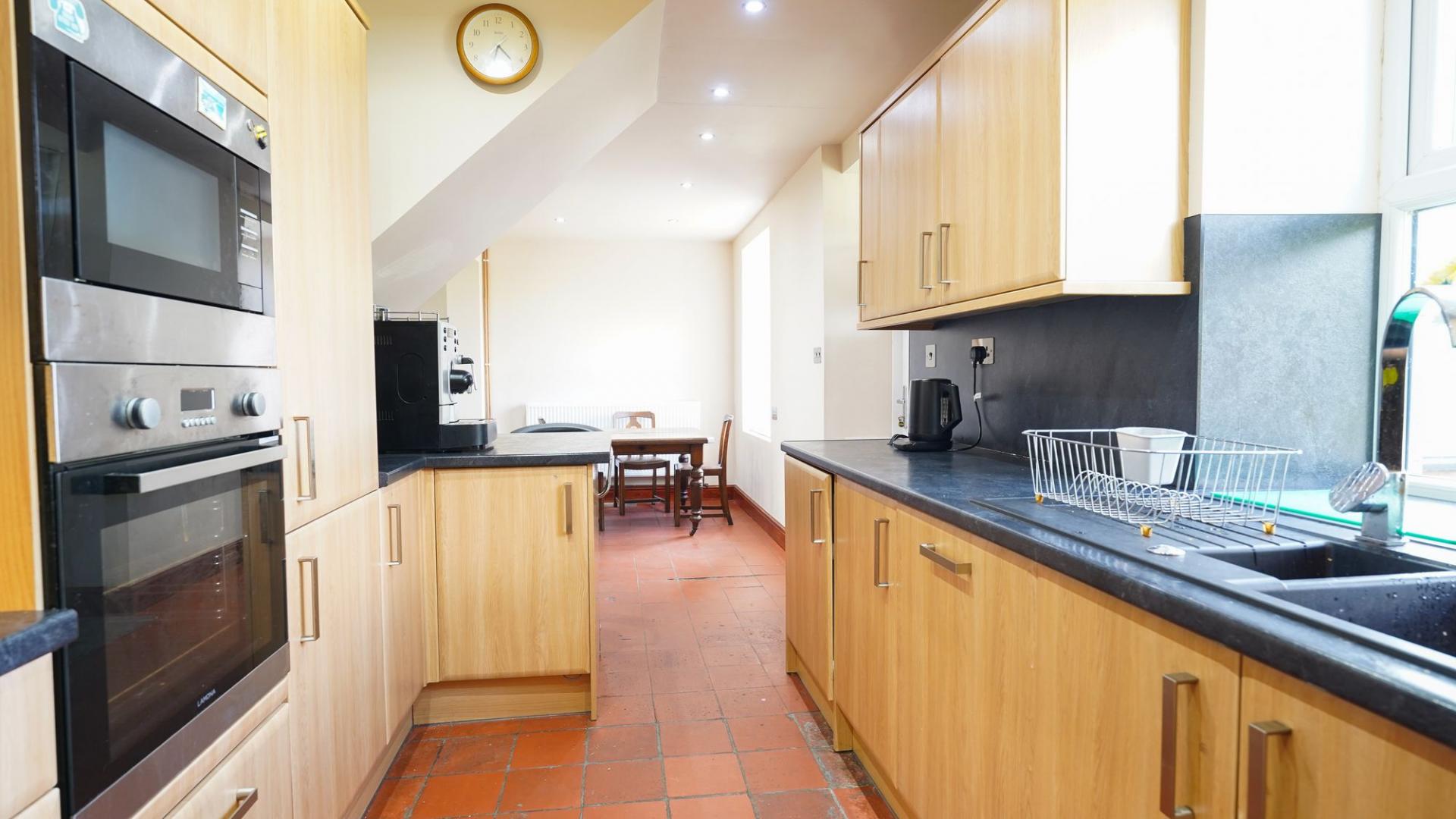 Fitted with a modern range of wall and base units, incorporating an integrated fridge/freezer, dishwasher, and washing machine. Includes a four-ring ceramic hob, single drainer sink, ample worktop space, and multiple power points. Well-designed for practicality and efficiency.