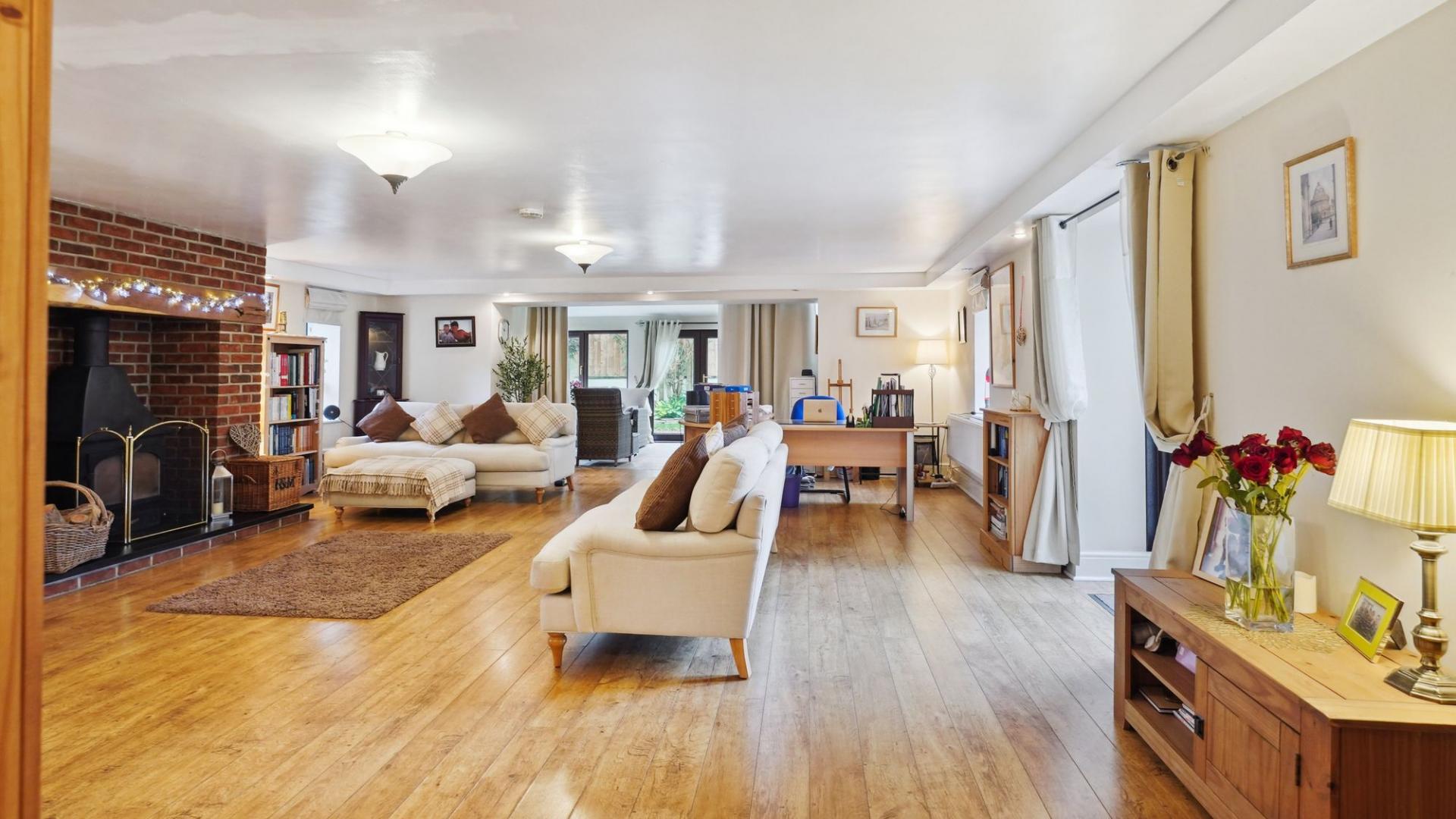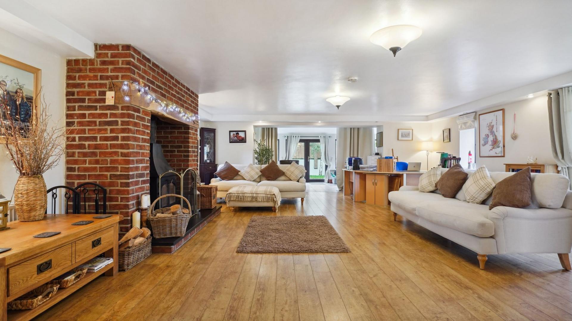 Triple aspect lounge. Attractive brick-built fireplace and surround incorporating oak beam over, multi-fuel stove, black slate hearth, two large radiators. A most generously proportioned family space ideal for entertaining, or simply relaxing. Oak flooring & spotlighting offsets this well-appointed inviting space. French glazed doors to rear patio garden, access through to: