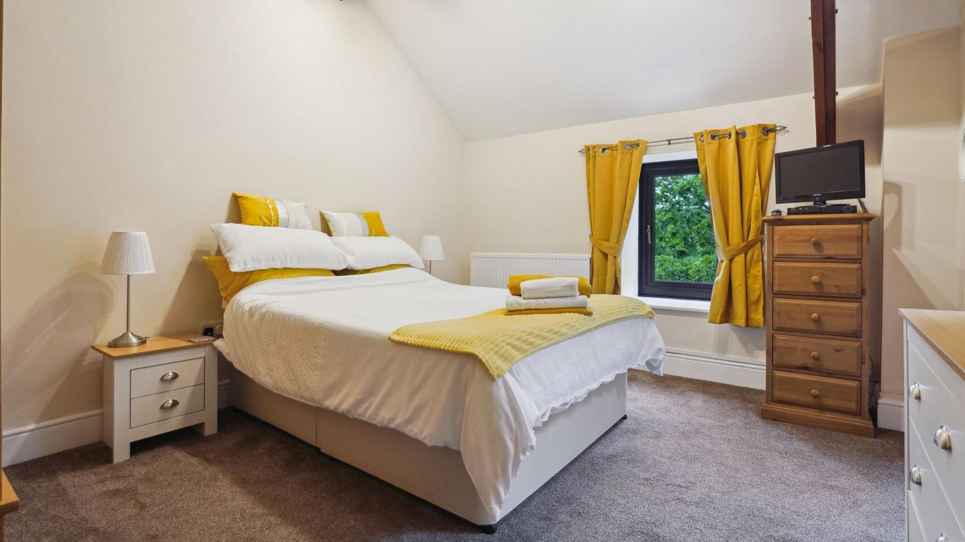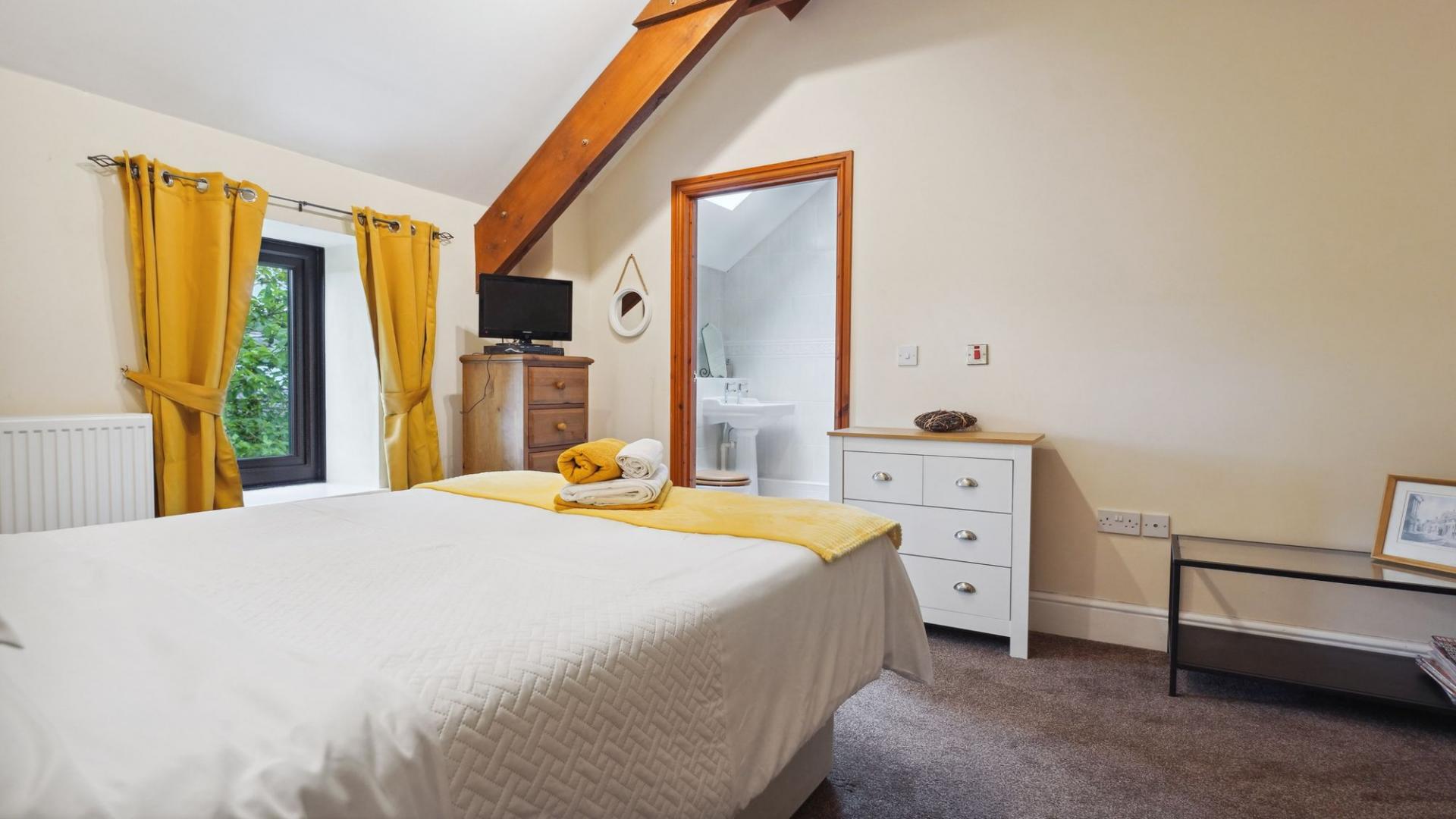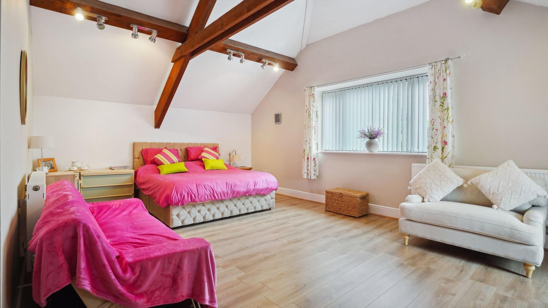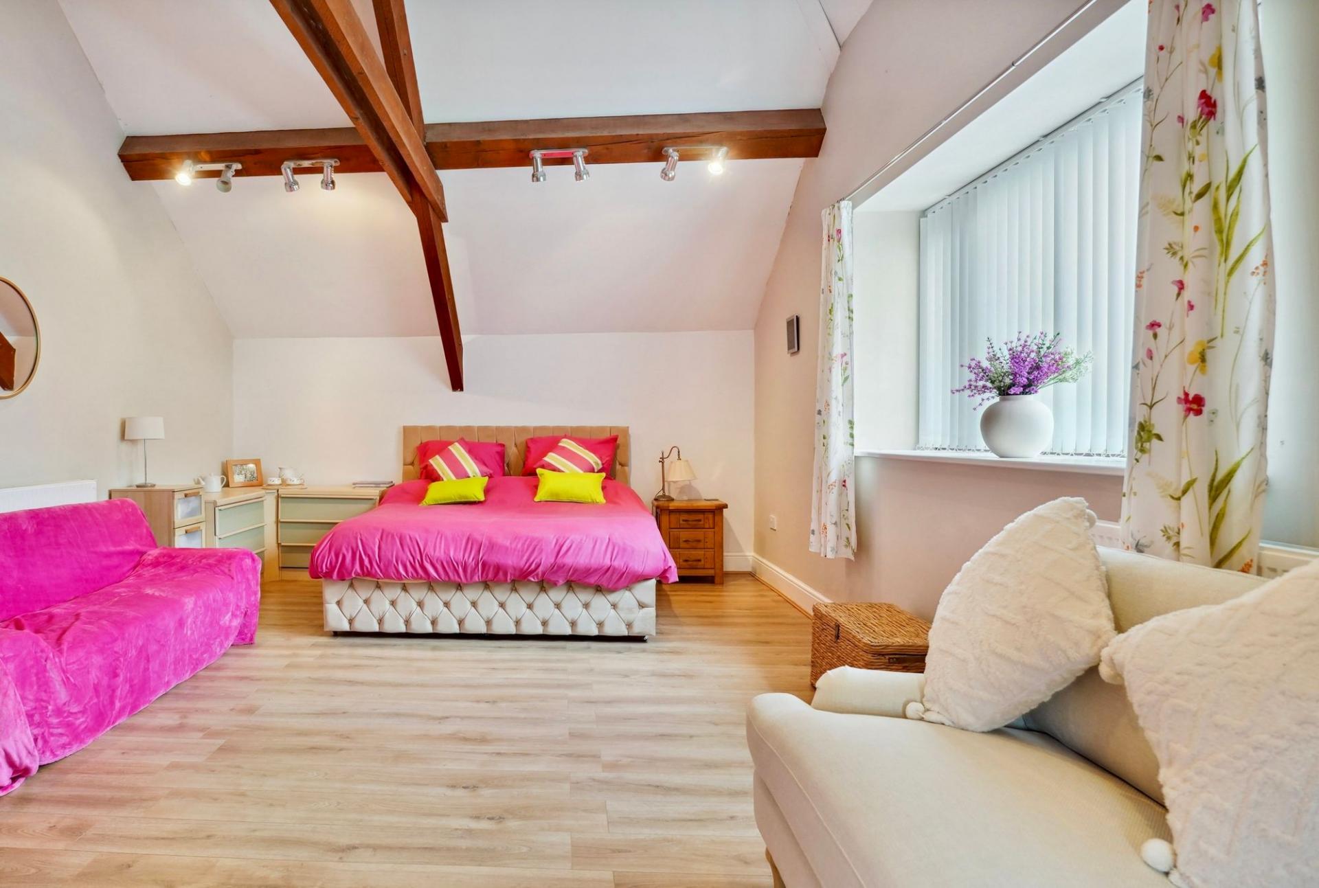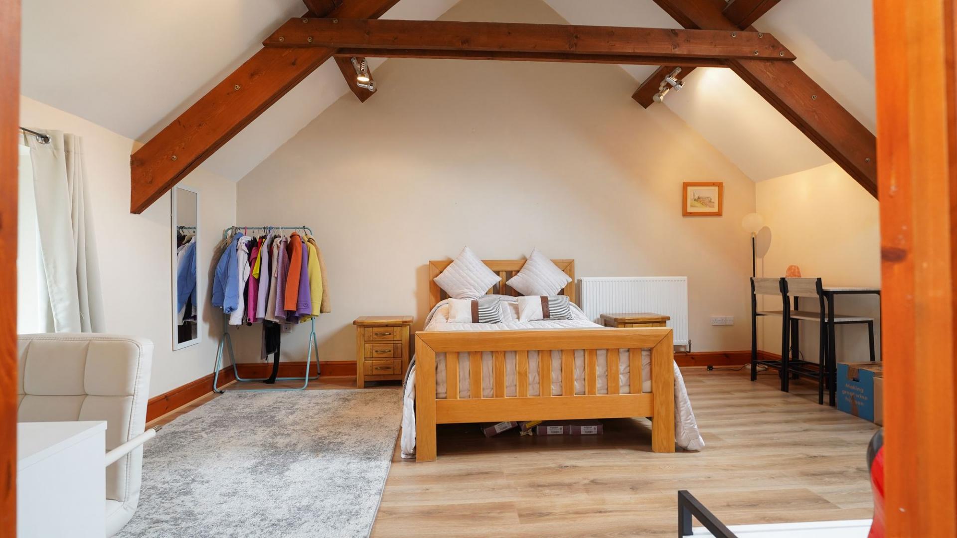 Dual aspect generously proportioned space with attractive exposed A-frame beams, spotlights, spacious built in wardrobes, radiator & door to;