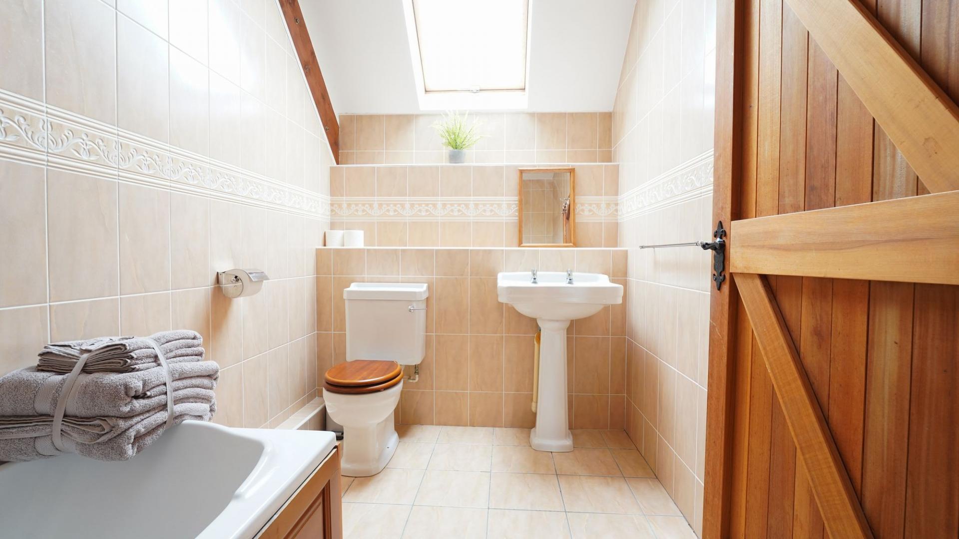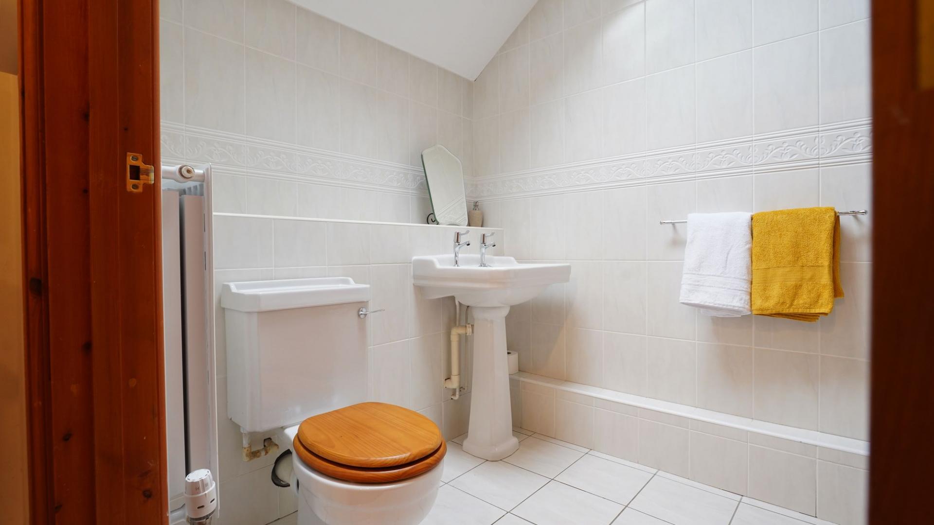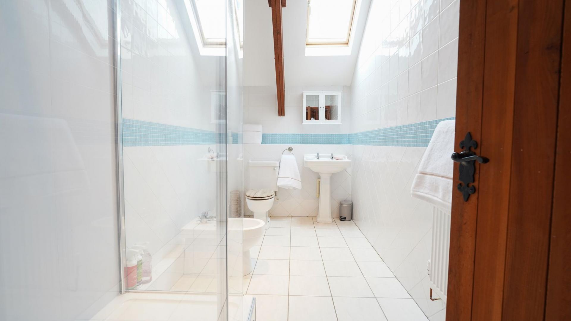 Fully tiled, large restroom area with double shower cubicle, extractor, pedestal wash hand basin, low level flush WC, bidet, exposed beams, Velux window, access to insulated loft space, radiator and tiled flooring.