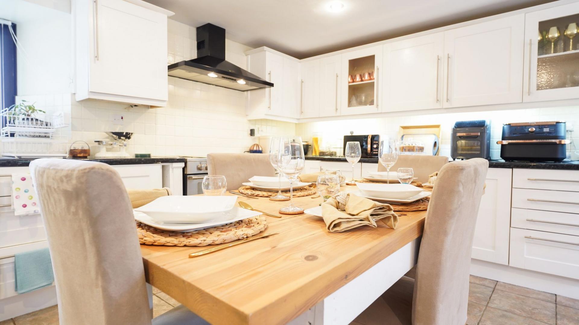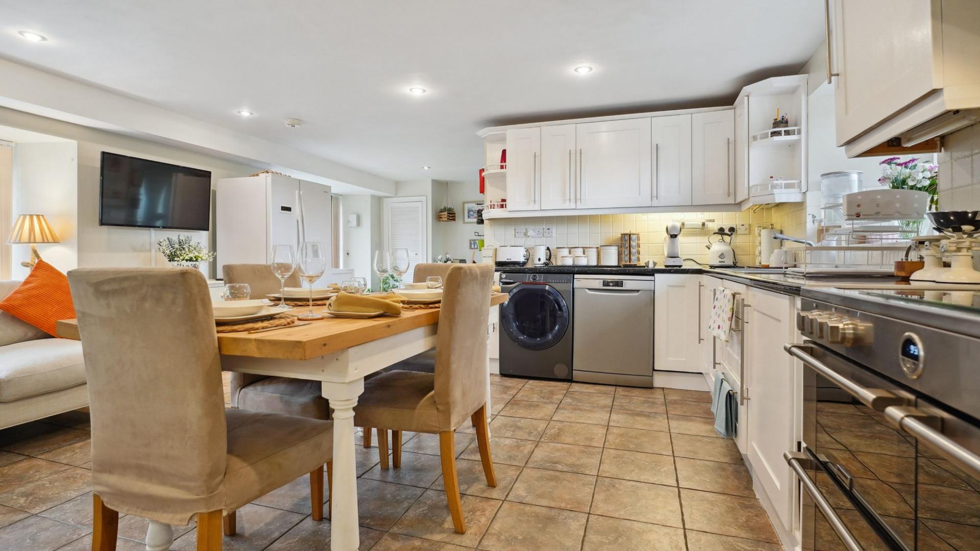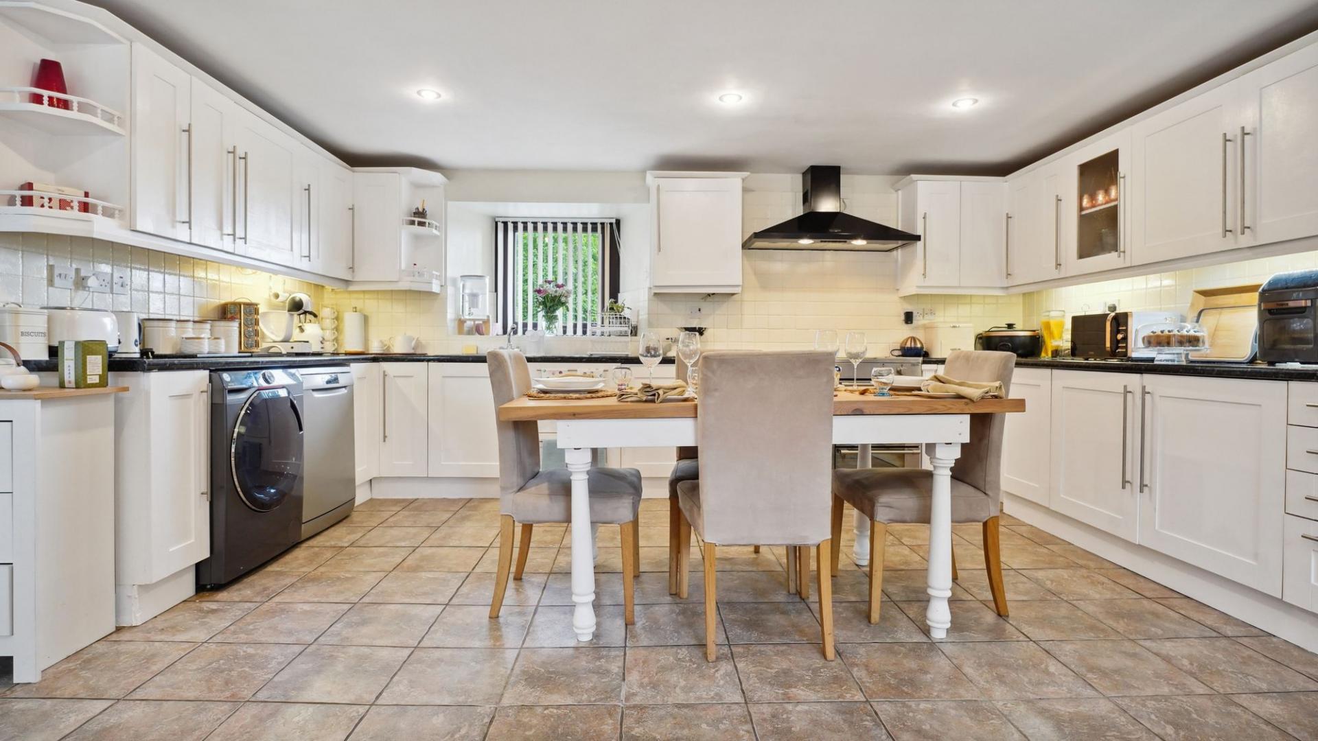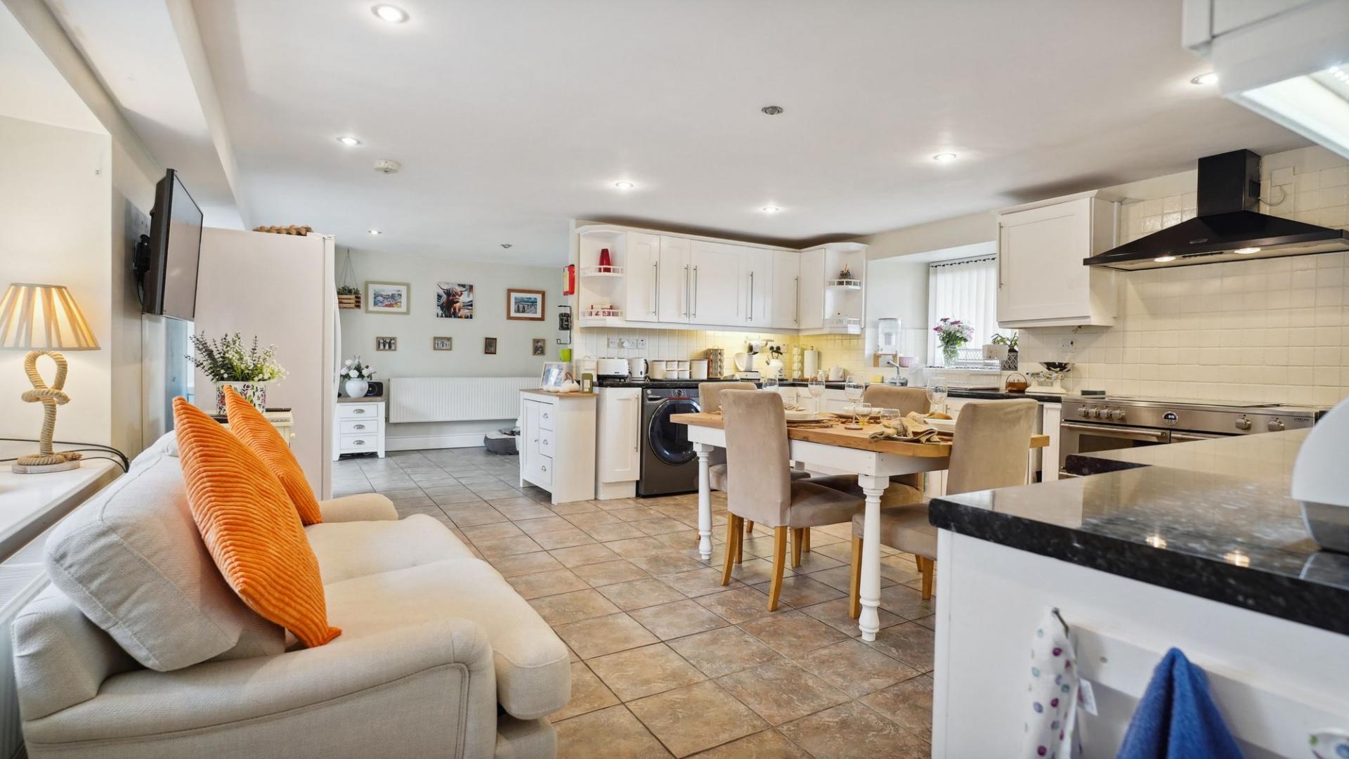 Dual aspect family and dining area offering base and eye-level cupboards with granite effect worktop surfaces. One and a haf bowl single drainer stainless steel sink unit with mixer tap, built-in fridge, freezer and tumble dryer, dishwasher and washing machine. Ceramic tile flooring. Door to: