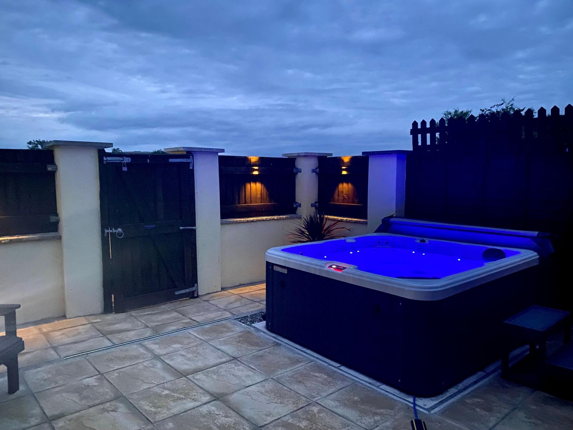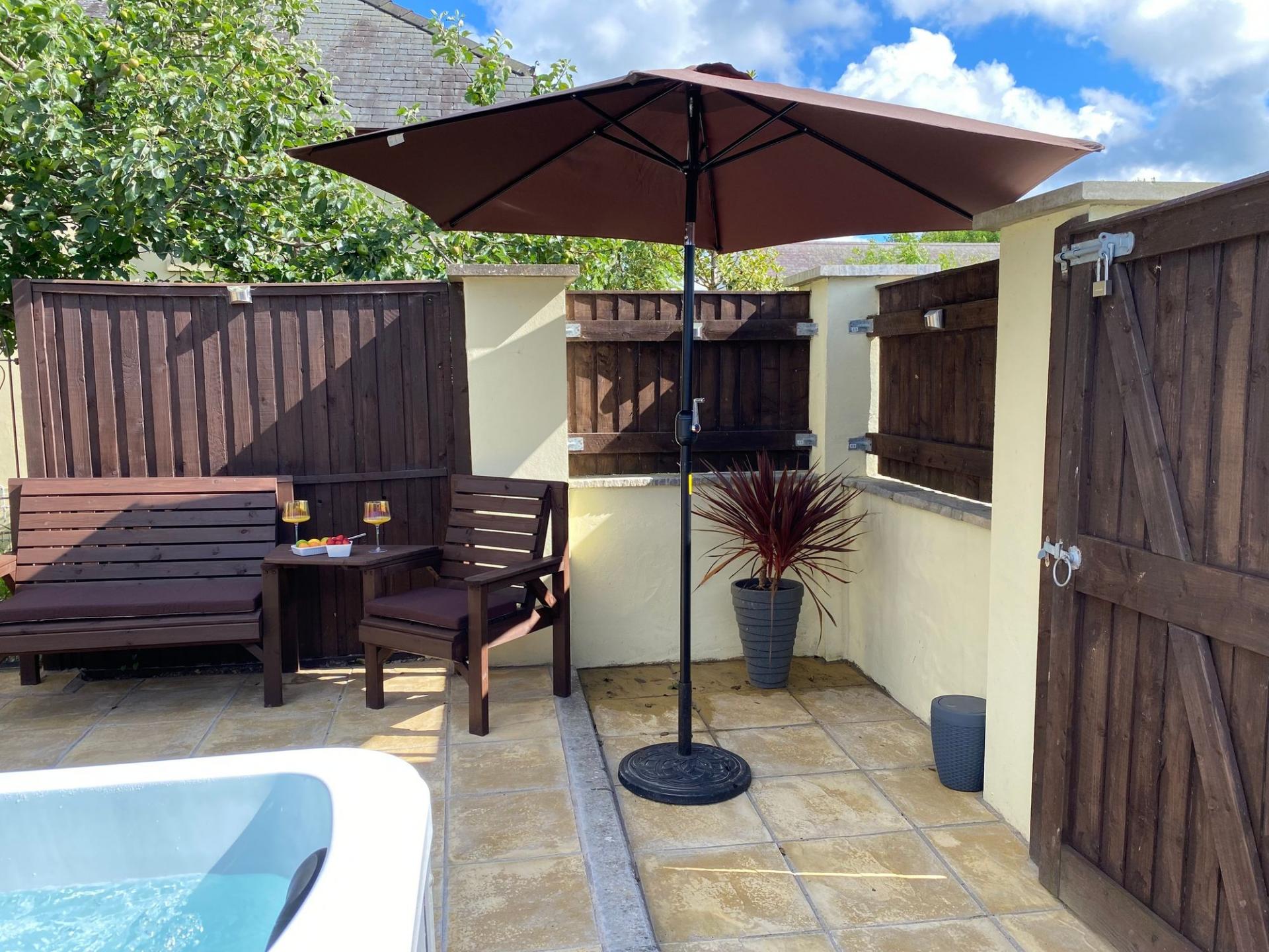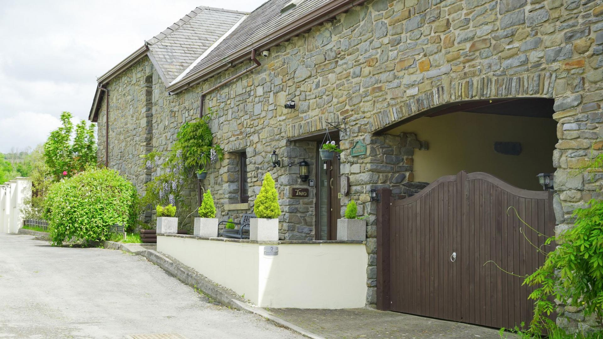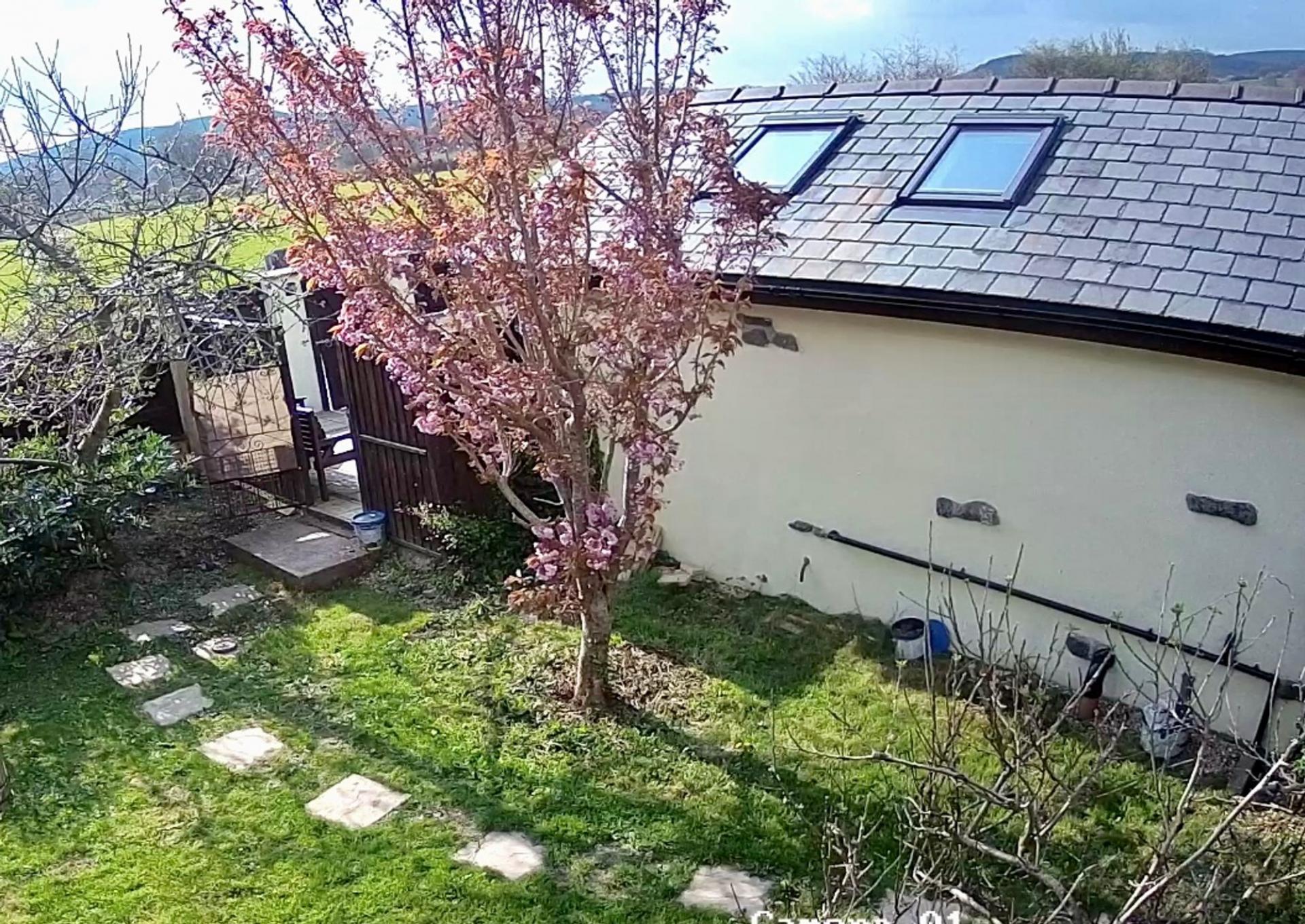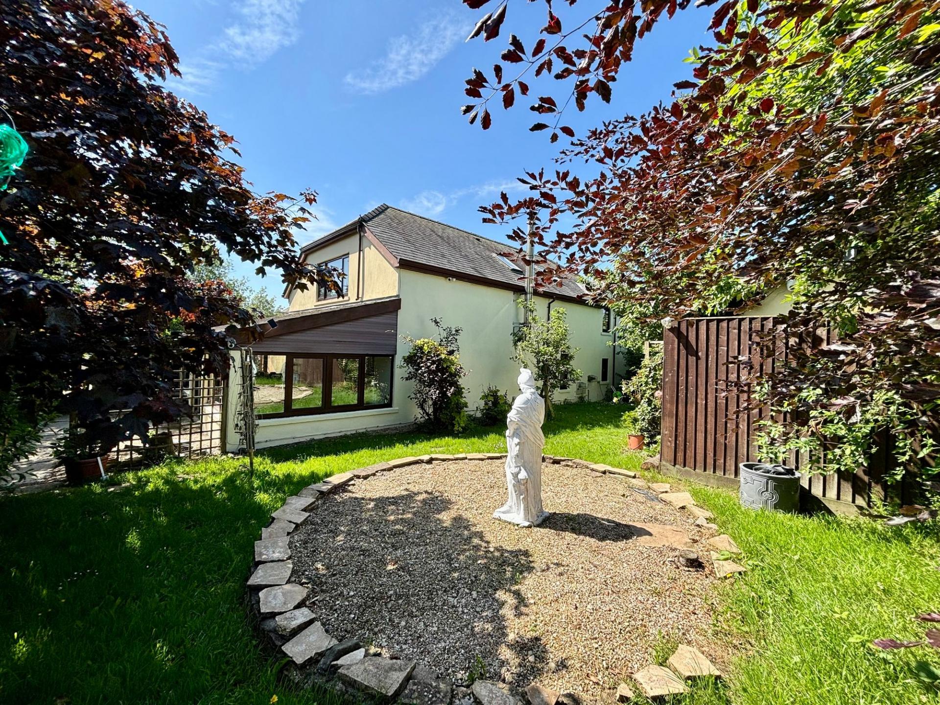 Block construction beneath pitched slate roof with attractive glazed entrance. Power and light connections. Attractive turfed garden to side with outside tap and wrought iron garden gate. Fenced. Decorative stone circle with grey metal double door shed. Oil tank. Flowering cherry and apple trees with numerous assorted plants and shrubs.