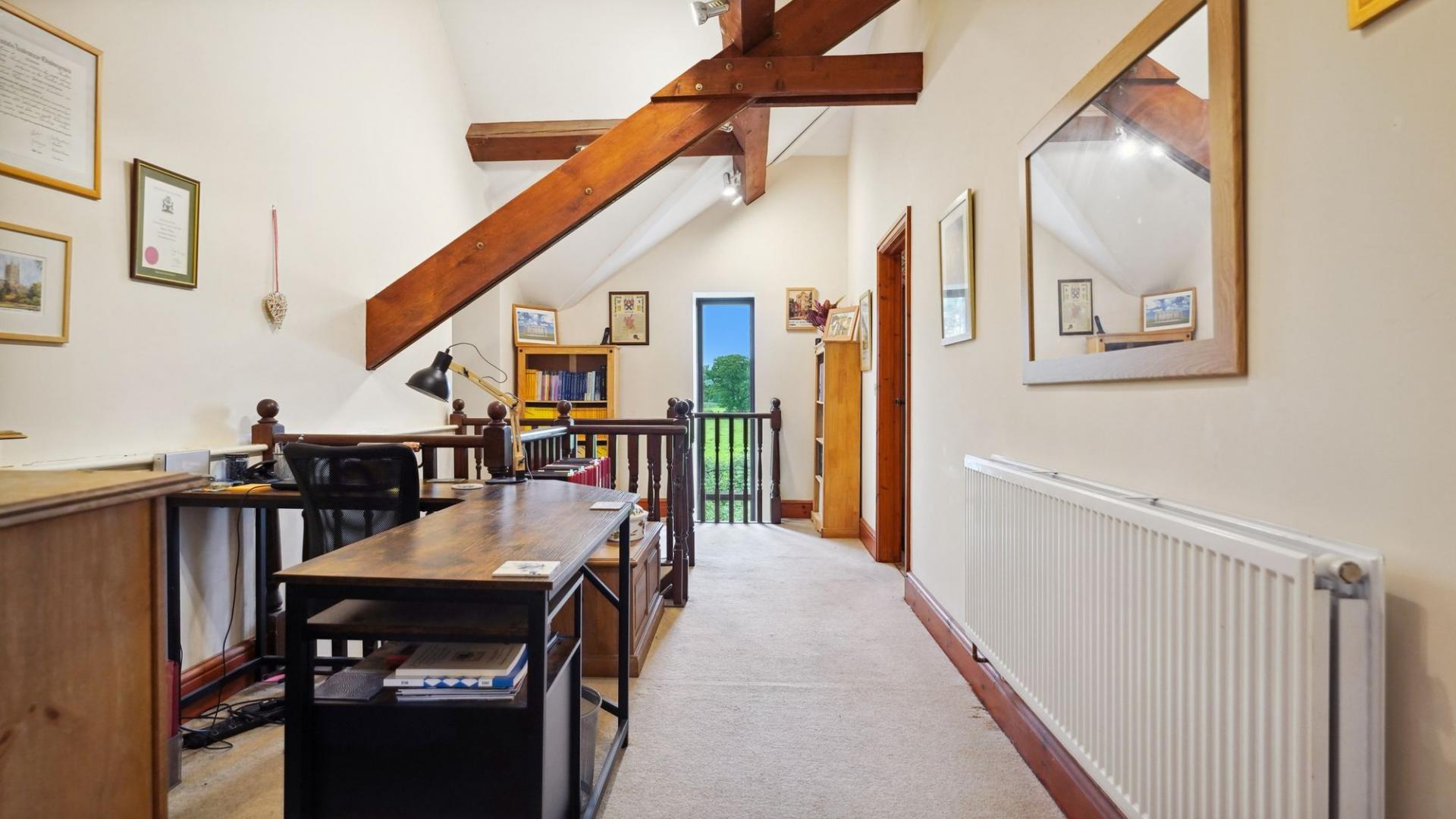 Accessed by a dog-leg, carpeted, staircase with wooden balustrades. This sizeable and spacious impressive galleried landing area with attractive picture gallery window, exposed beamed ceiling, spotlights, radiators leads to;