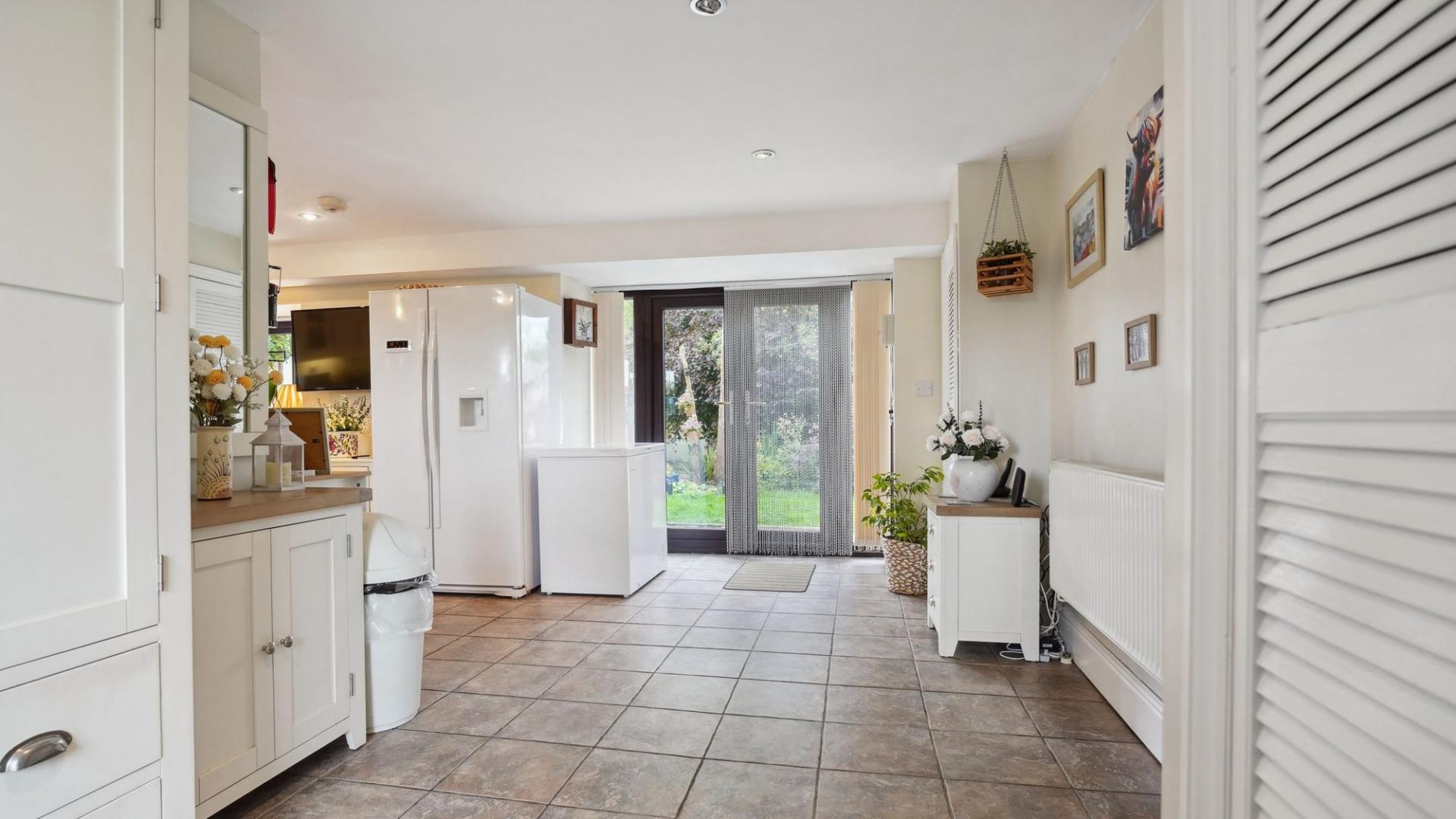 Ceramic tile flooring, built-in cloak and broom cupboards with louvre doors, radiator and French doors to rear garden and patio area.