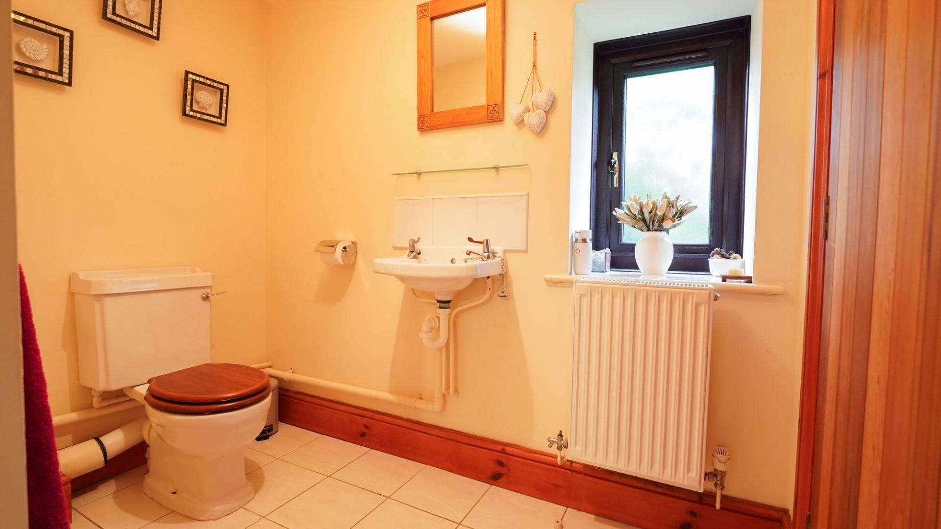 Modern white ceramic suite comprising WC, wash hand basin, glazed window, radiator, tiled floor, built-in cupboard housing oil fired central heating boiler and airing facility.