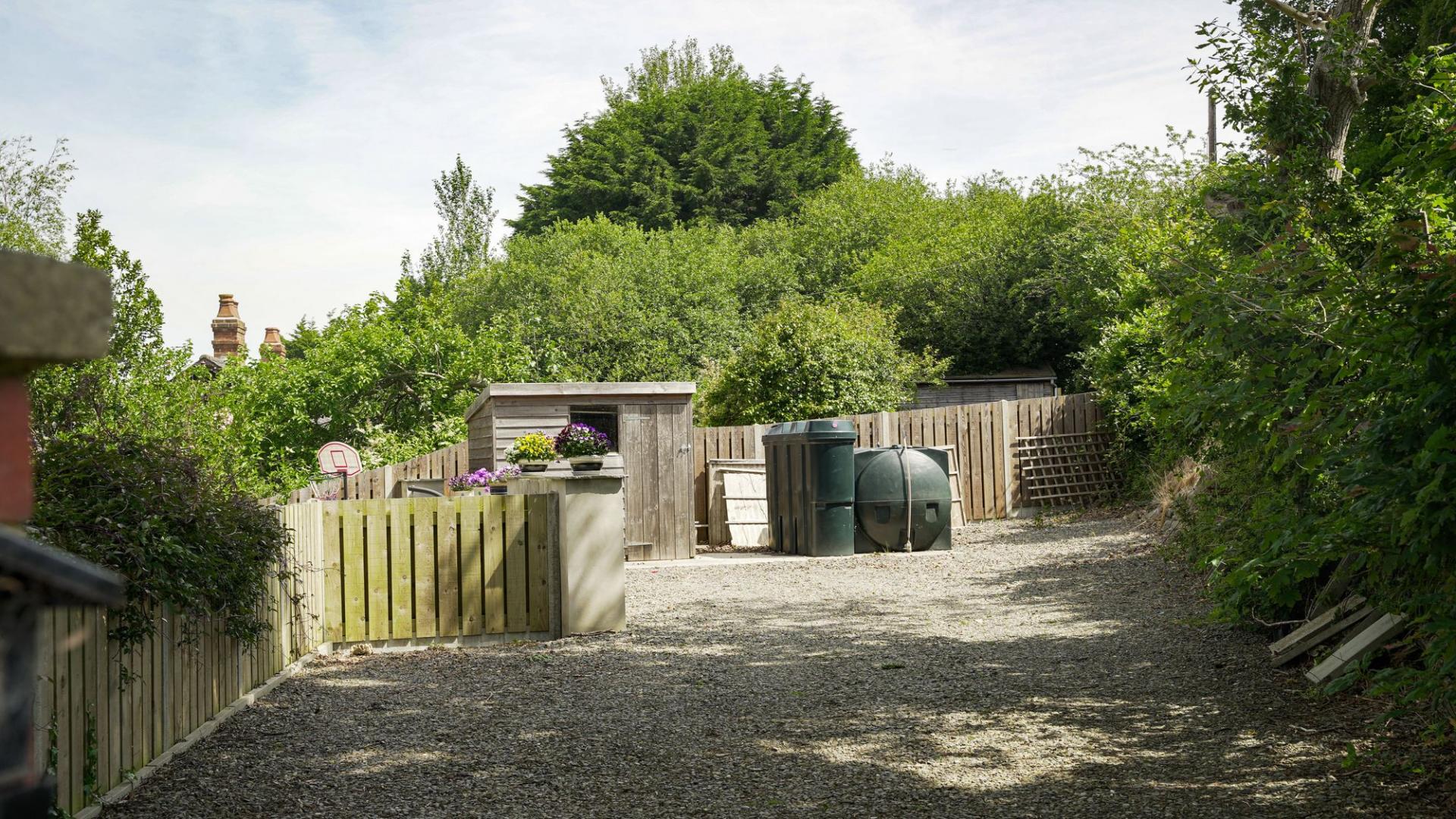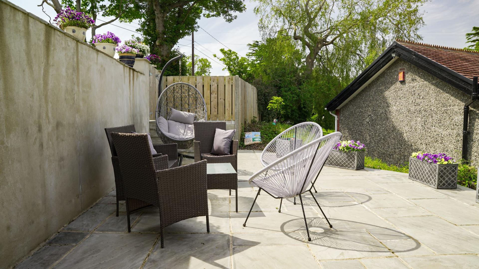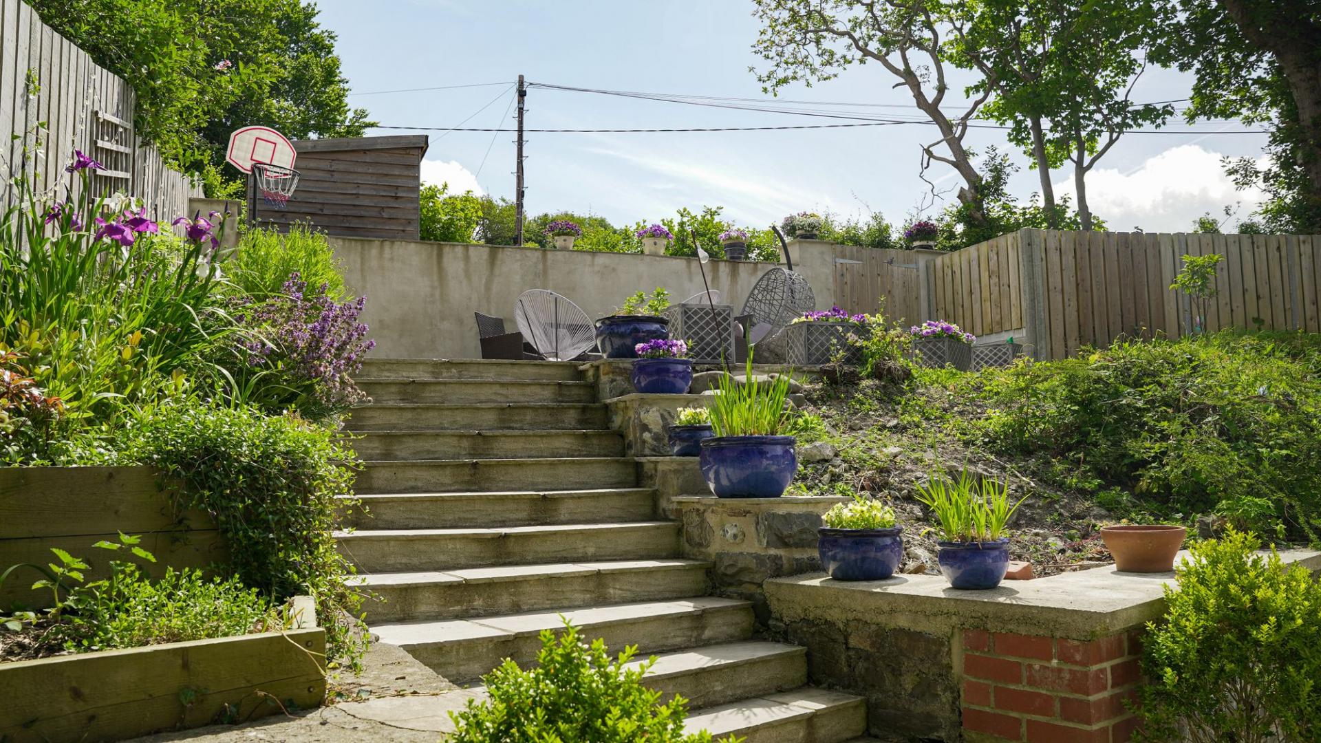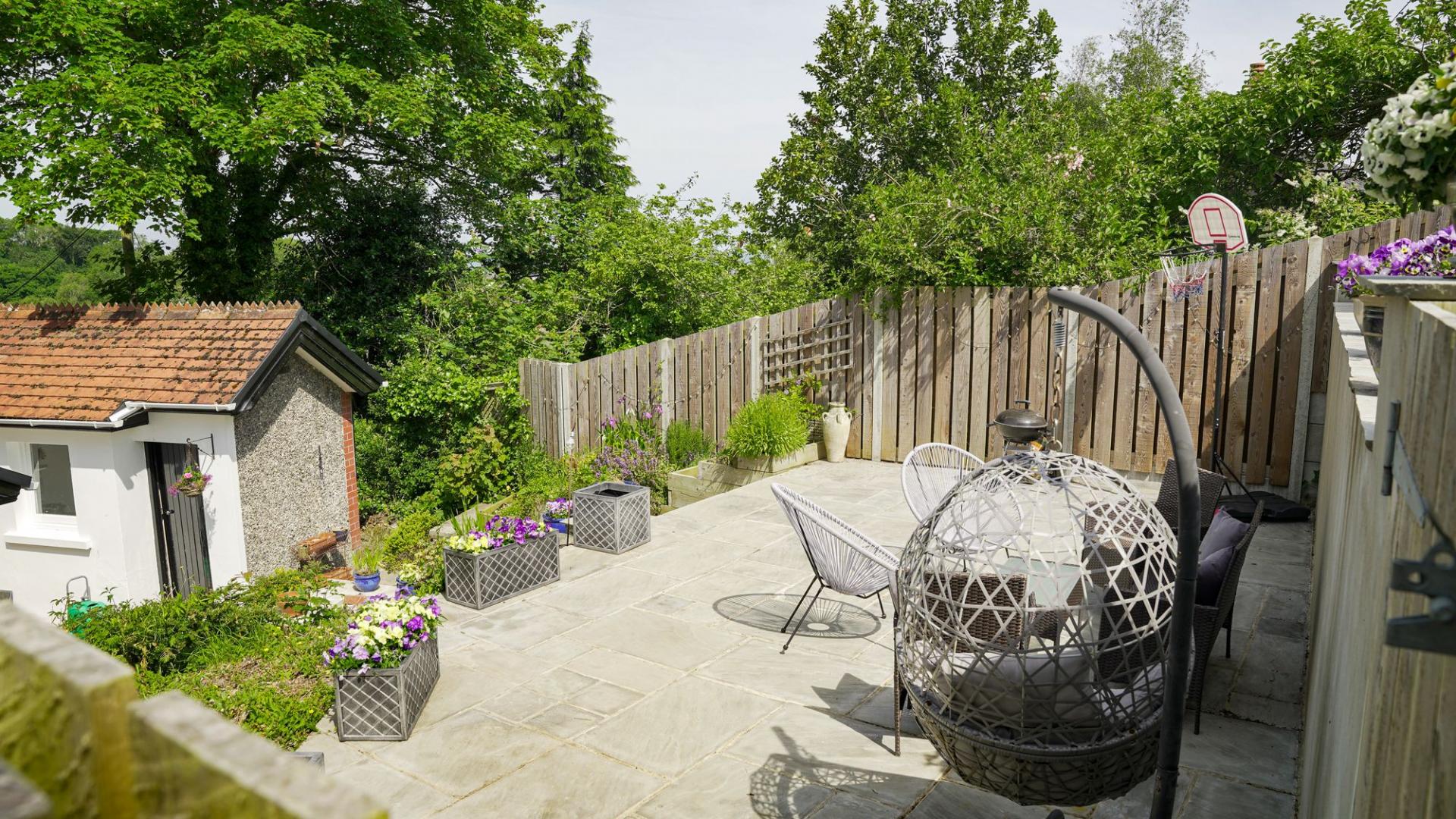 The property’s outdoor spaces are equally appealing, with multiple sunny patio areas, perfect for relaxation or entertaining, and beautifully landscaped gardens. Extensive parking at the rear provides ample space for multiple vehicles, while steps lead gracefully down into the garden.