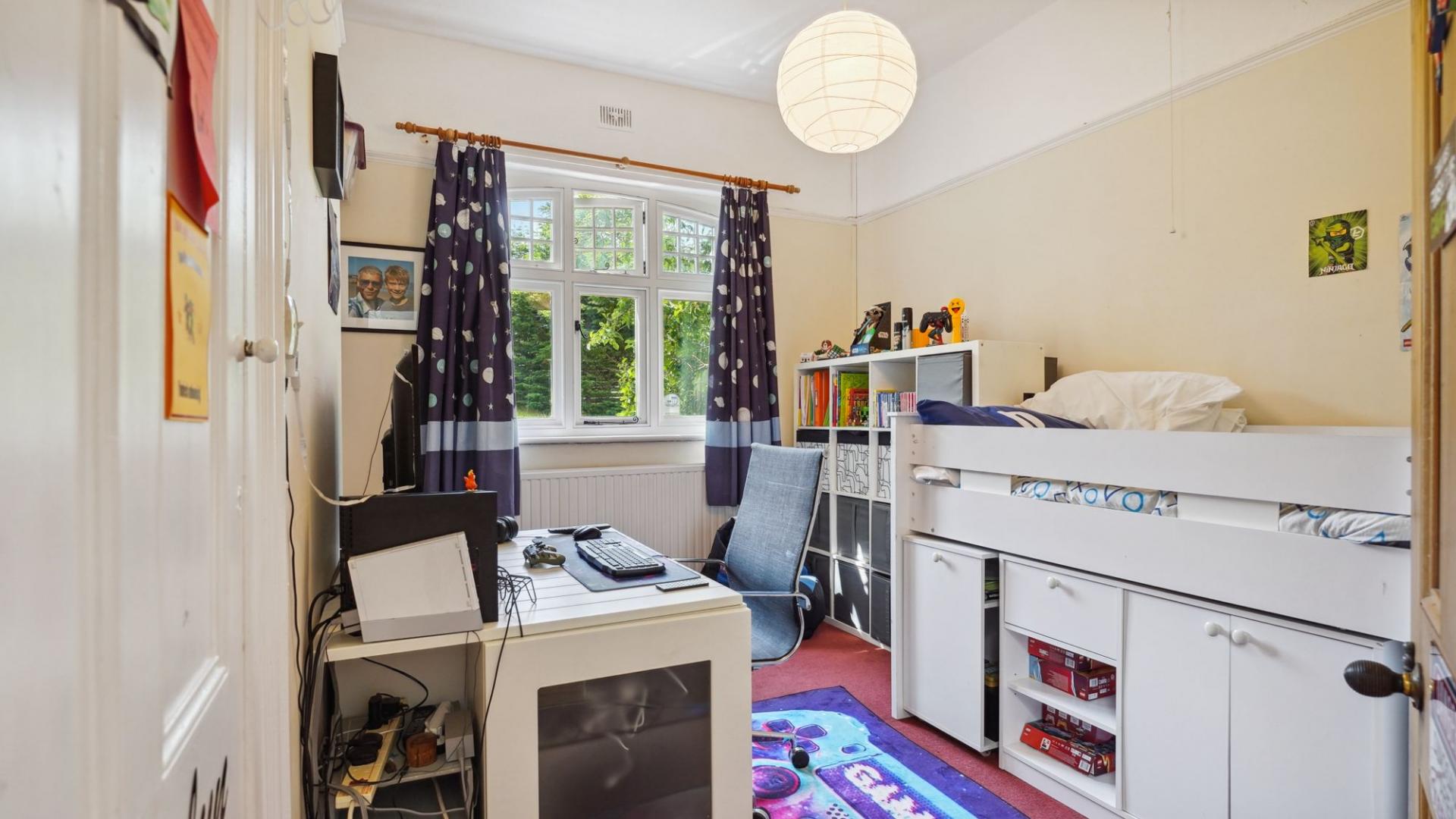 With wooden double-glazed window, radiator, built in wardrobe cupboard and picture railing.