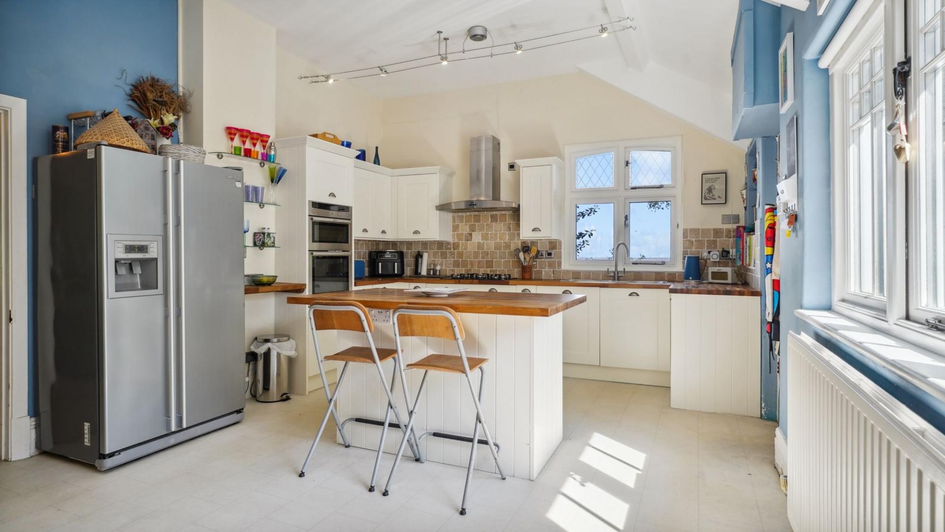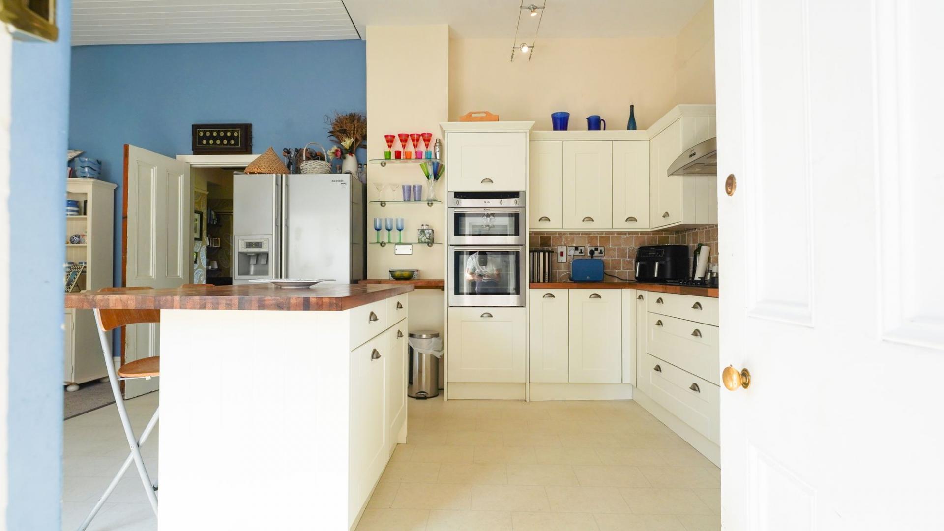 Dual aspect with sea views, range of eye and base level units, one and a half drainer sink unit with mixer tap, part tiled walls, integrated Neff double oven, integrated dishwasher, LGP hob and extractor hood. There's an island unit with original character storage cupboards and high ceilings. Open into the dining room/breakfast room area.