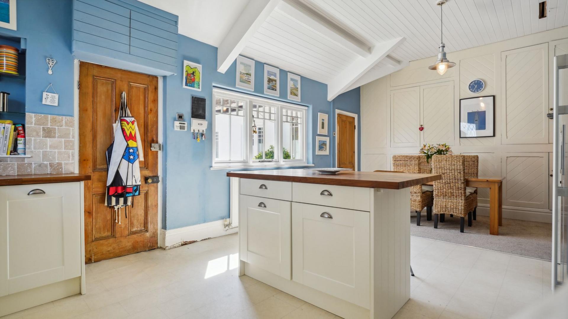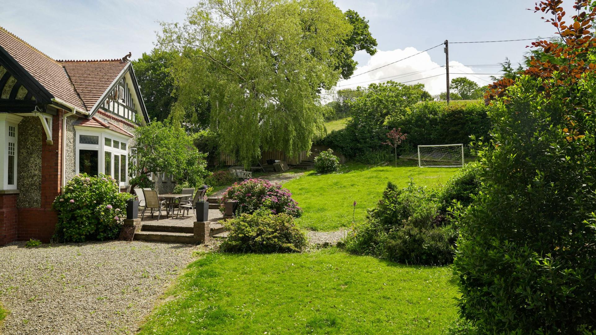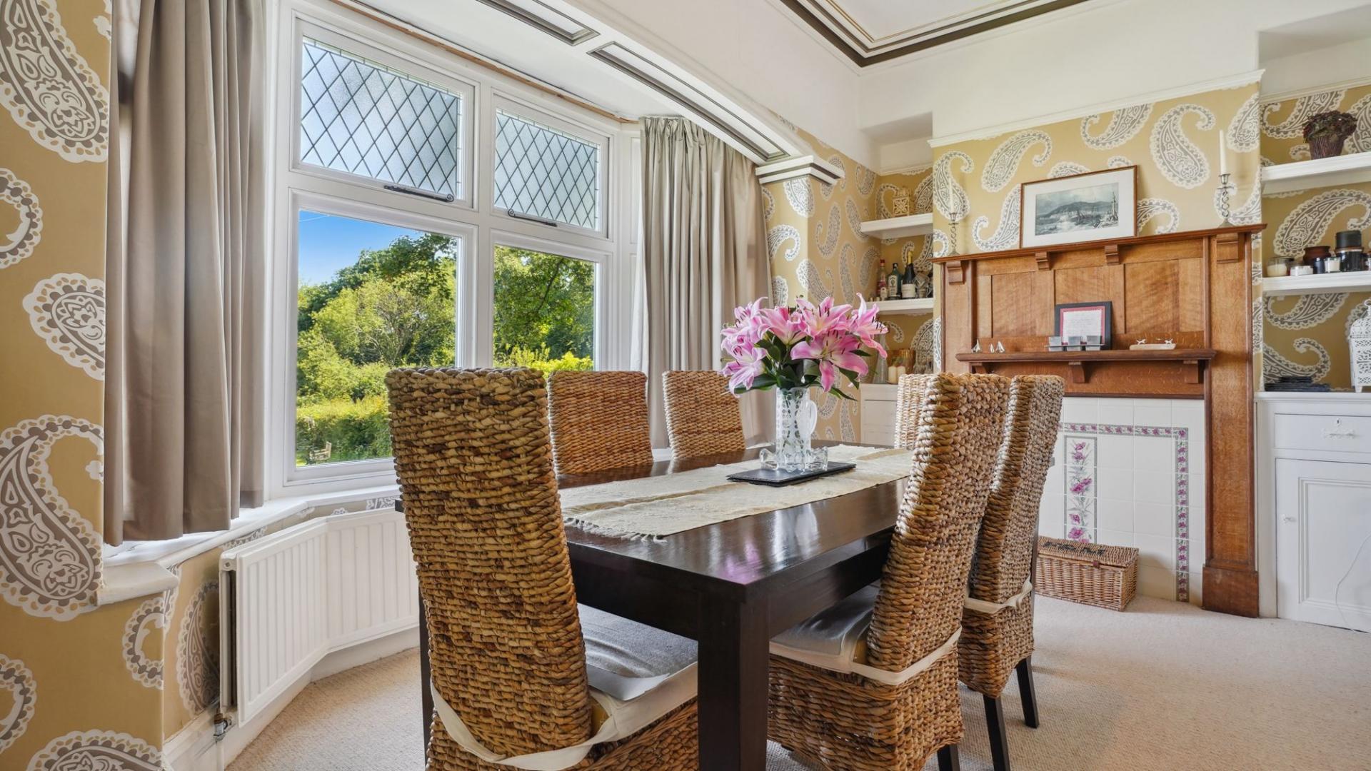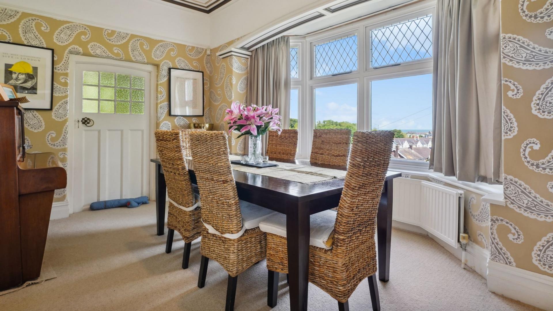 The four-bedroom detached bungalow boasts unique architectural features, including an arts-and-crafts-style sitting room with a walk-in inglenook fireplace, and two generously sized reception rooms, one of which is a dining room with sea views. The spacious kitchen/breakfast room also offers coastal vistas, alongside four bedrooms and a modern bathroom suite.