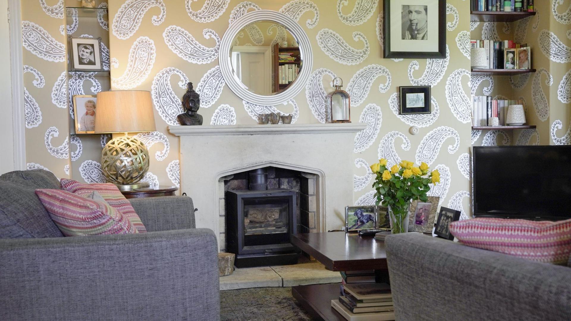 With an attractive stone-built fireplace with a multi-fuel burning stove, a walk-in bay window with wooden double-glazed windows, radiator, spectacular original coving and cornicing to ceiling and picture railing, ceiling rose with a chandelier light fitting and sliding wooden original doors leading to the dining room.