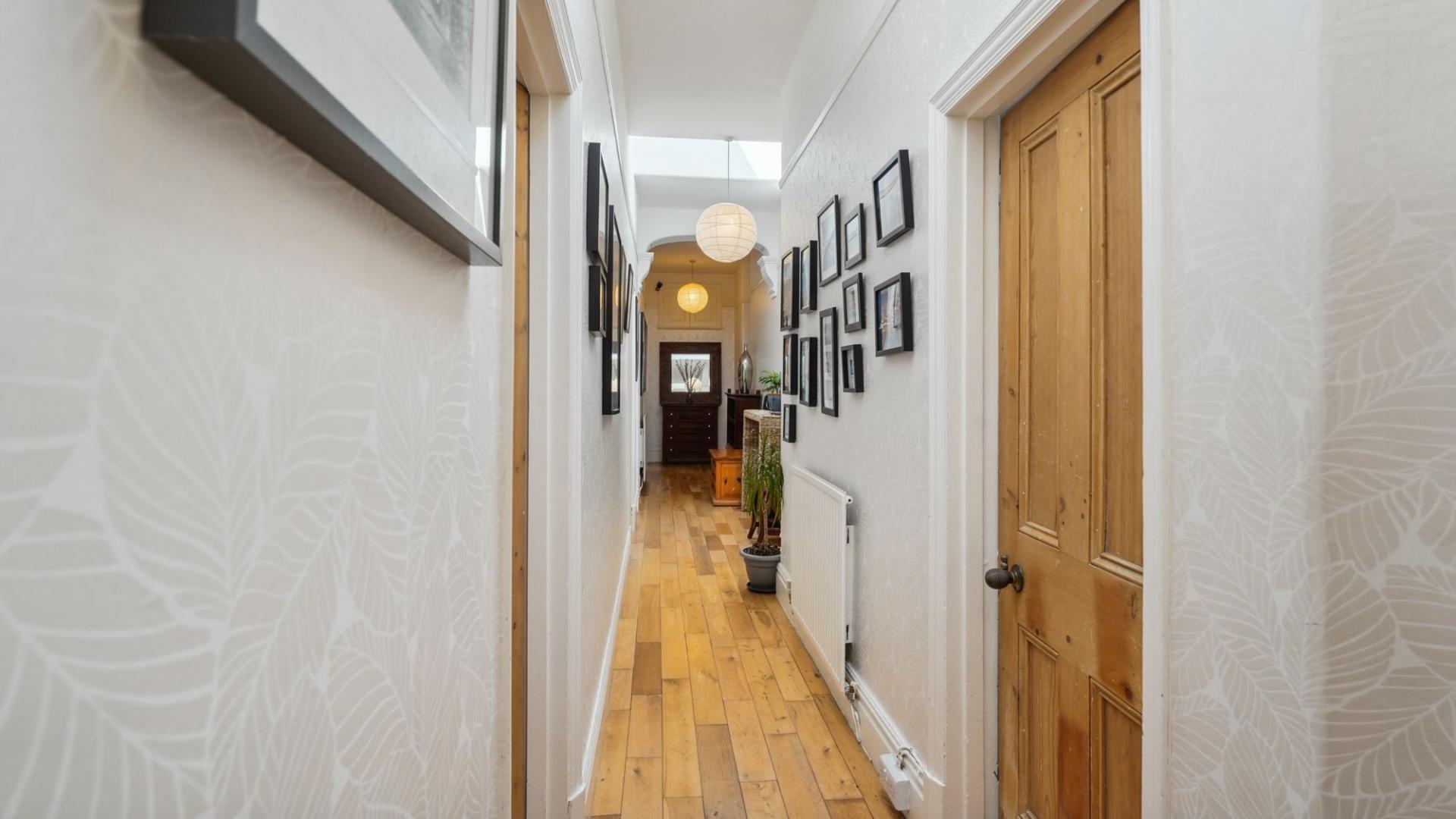 Leading to the bedroom suites, this hallway is well lit by two large Velux windows and has attractive timber flooring and picture railing.