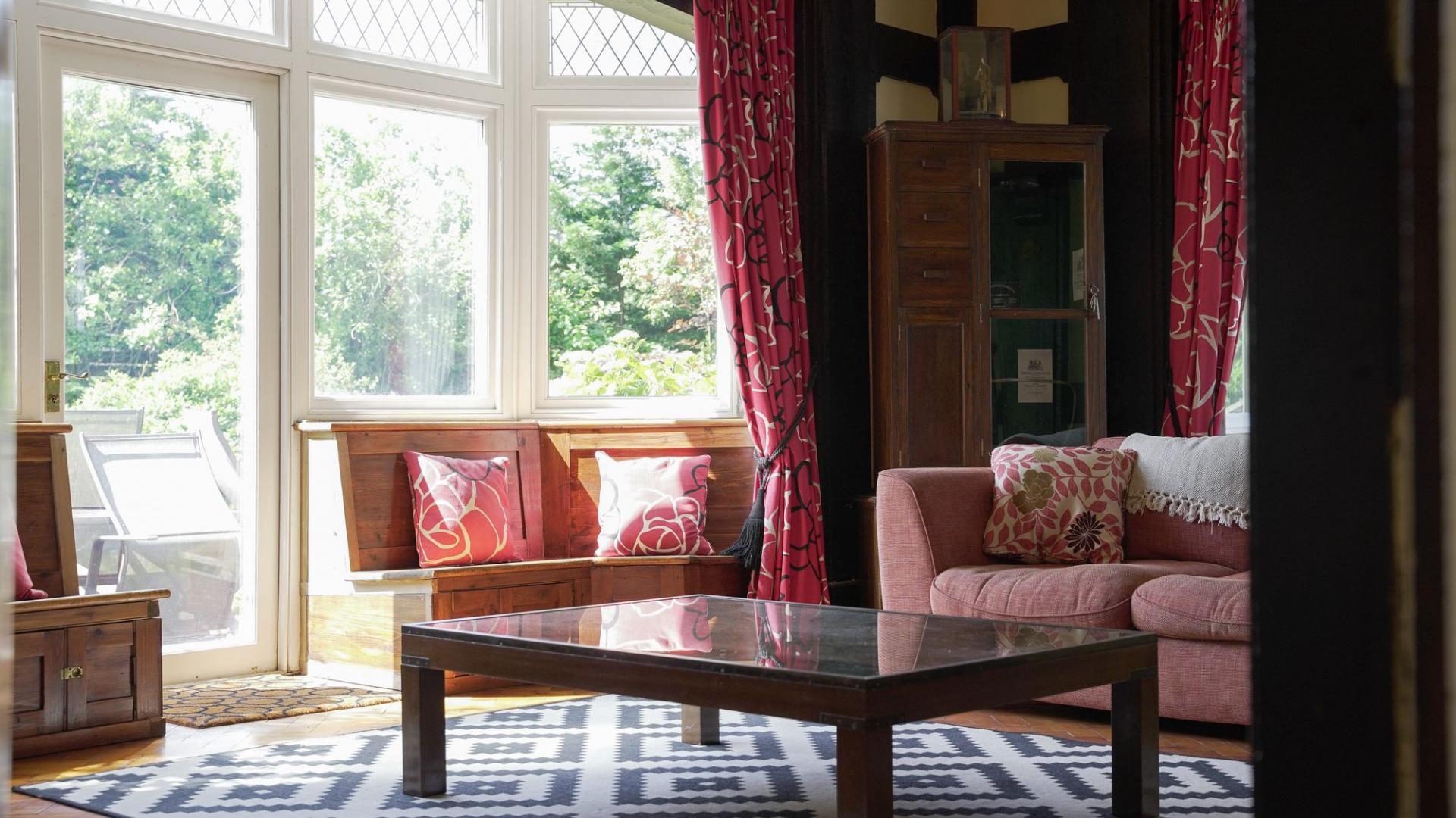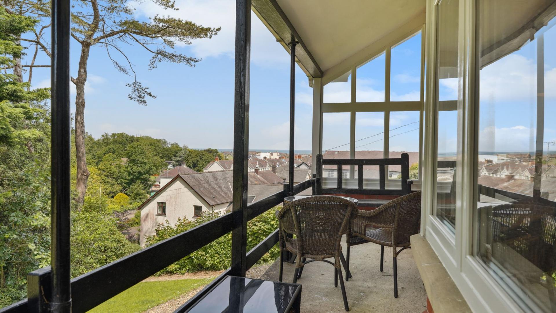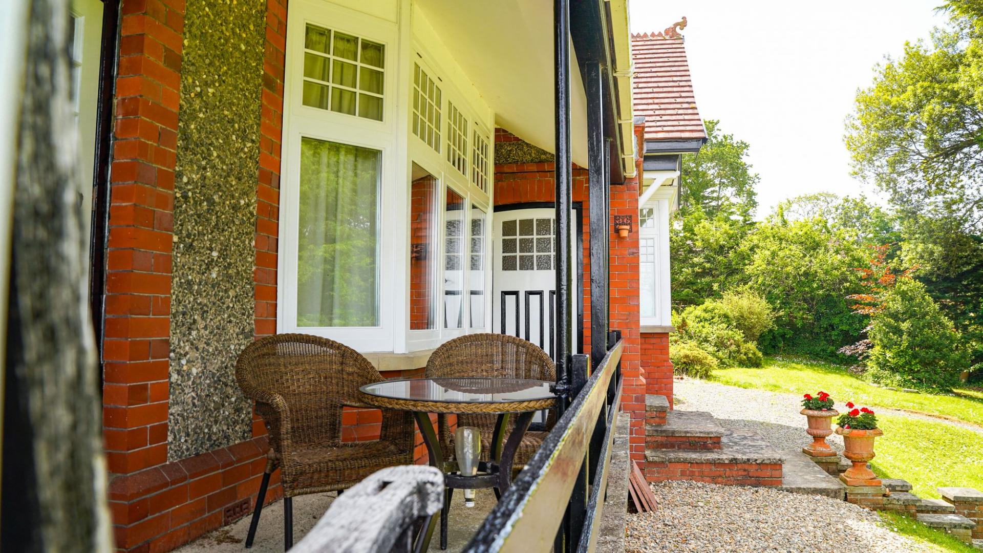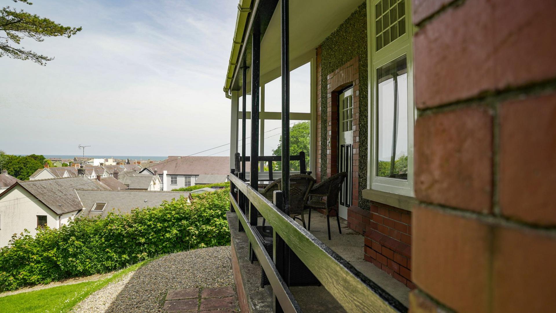Side aspect with a double-glazed built-in bay window with sea views, original coving and cornicing details to ceiling and a beautiful reveal around the bay window, part glazed original door leading out onto the verandah and sea views, fireplace surround and original cupboards.