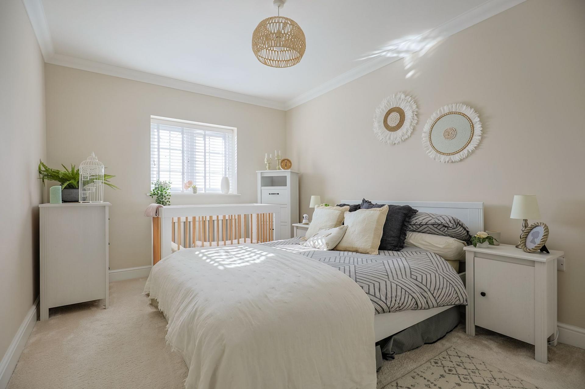 Located to the rear, this double bedroom benefits from a side window allowing for natural light. It enjoys carpeted flooring, coving, and fitted Hammond wardrobes with hanging rails and shelving.