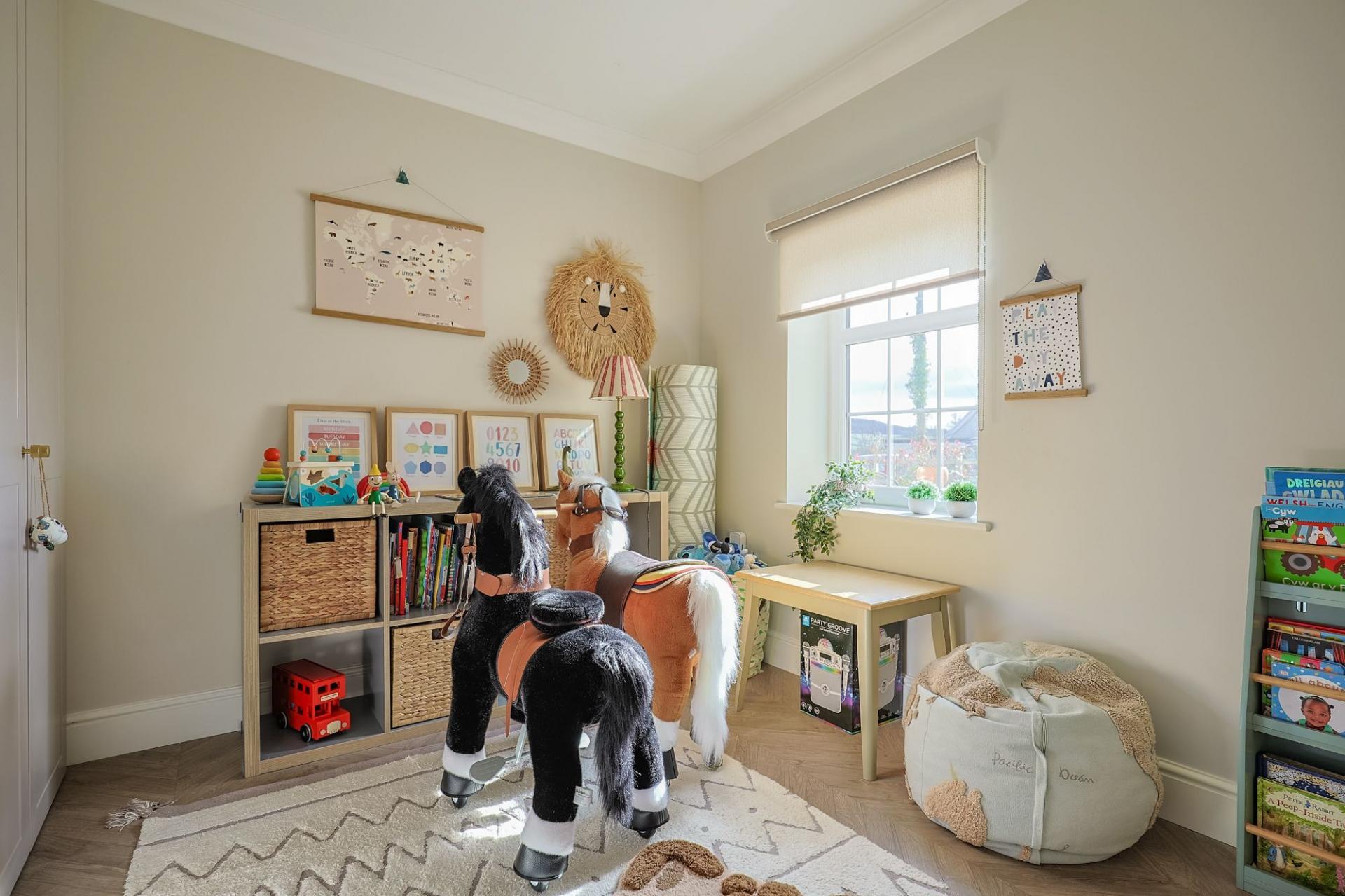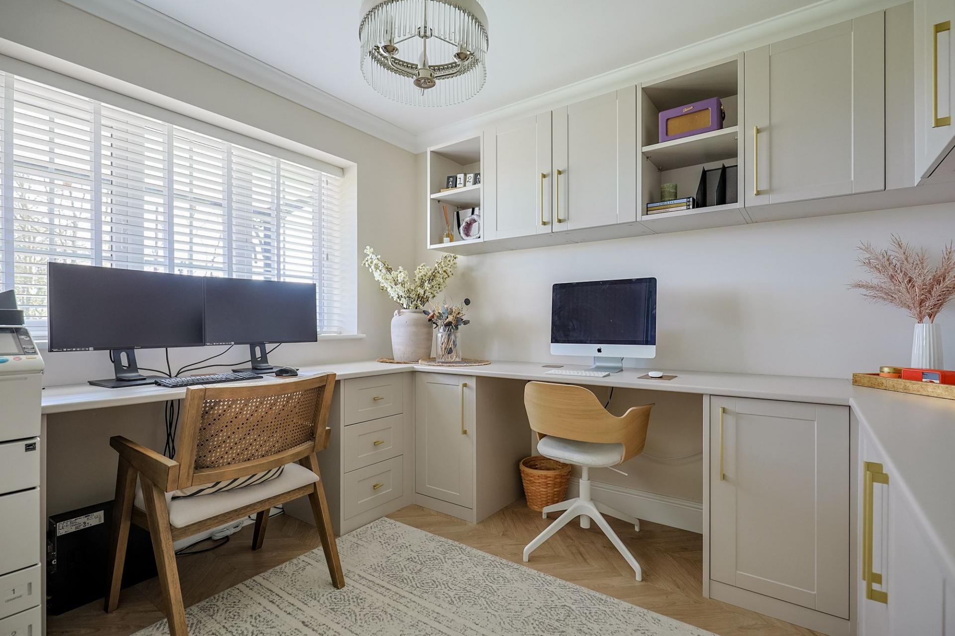 Situated off the dining area, this bright and versatile space is currently utilised as a playroom. A window to the side provides natural light, while the herringbone LVT flooring and an array of bespoke fitted storage cupboards with shelving complete the room.