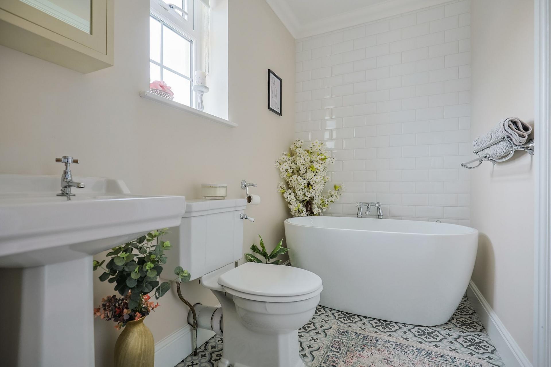 A stylish and functional space, furnished with a WC with storage on either side and a quartz worktop, a wash basin with storage underneath, a beautiful feature bath, and a double walk-in shower. Additional features include a heated towel rail, porcelain tiled flooring, part porcelain tiled walls, spotlighting, an extractor fan, coving, and a window to the side.