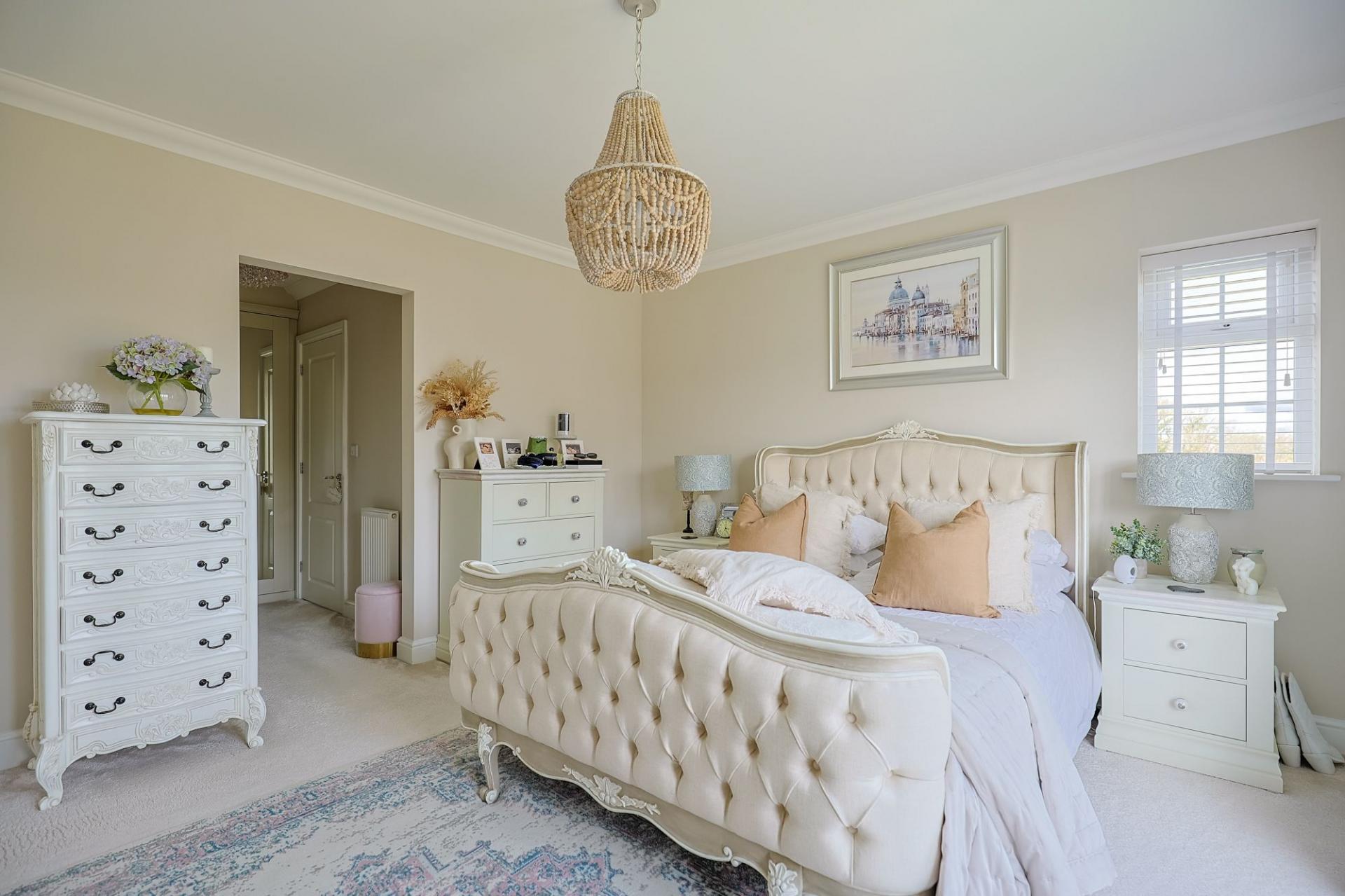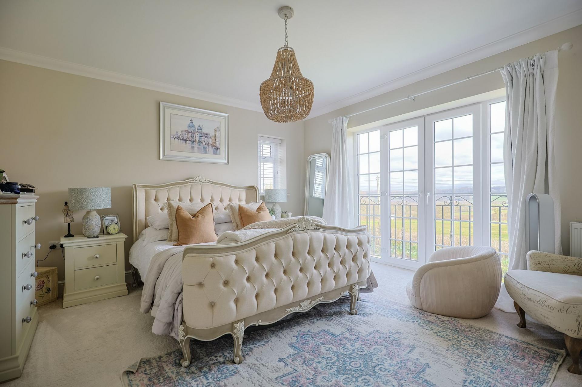 A spectacular and spacious room featuring a window to the side and a Juliet balcony with flanking windows to the front, allowing for stunning rural views and an abundance of natural light. This suite enjoys carpeting, coving, and a dedicated dressing area with an array of fitted Hammond wardrobes, hanging rails, shelving, and drawers. The private en-suite houses a WC, Waverley wash basin, feature bath, heated towel rail, mirrored TV, tiled flooring, coving, and a frosted window to the side.