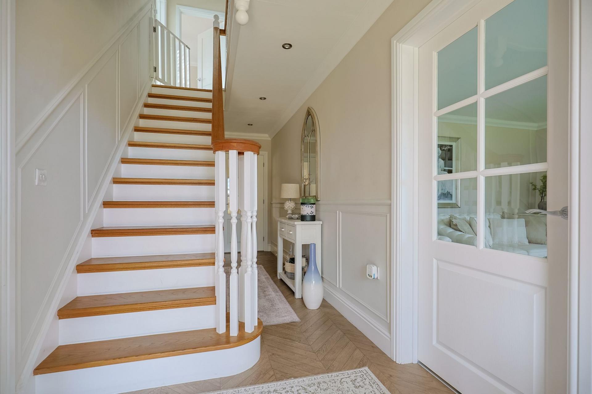 Instantly, what a welcoming home! The entrance is laid with elegant herringbone LVT flooring and is wonderfully light, thanks to the glass panel window next to the frontdoor. The space is further enhanced by beautiful, panelled walls, spotlighting, and coving. From here, you have access to the open-plan kitchen/dining/living room, study, lounge, stairway to the first floor, and useful under-stairs storage. Located here is also the alarm system control panel.