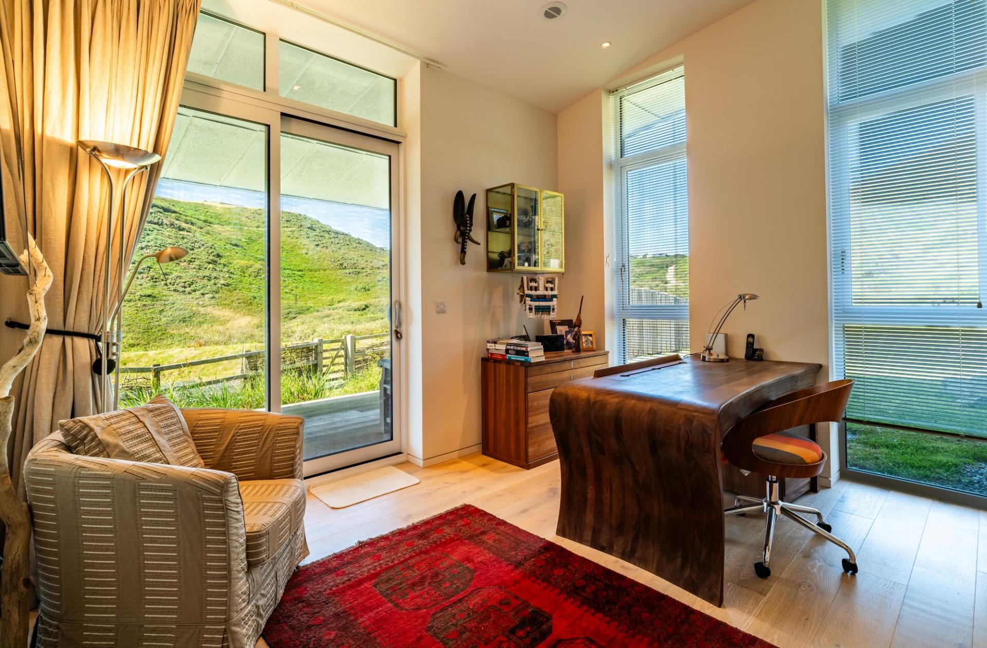 Currently arranged as a flexible space—either a comfortable double bedroom or a home study—it enjoys a peaceful aspect across open meadowland. Ideal for guests, hobbies, or remote working. Features access to a terrace / deck area