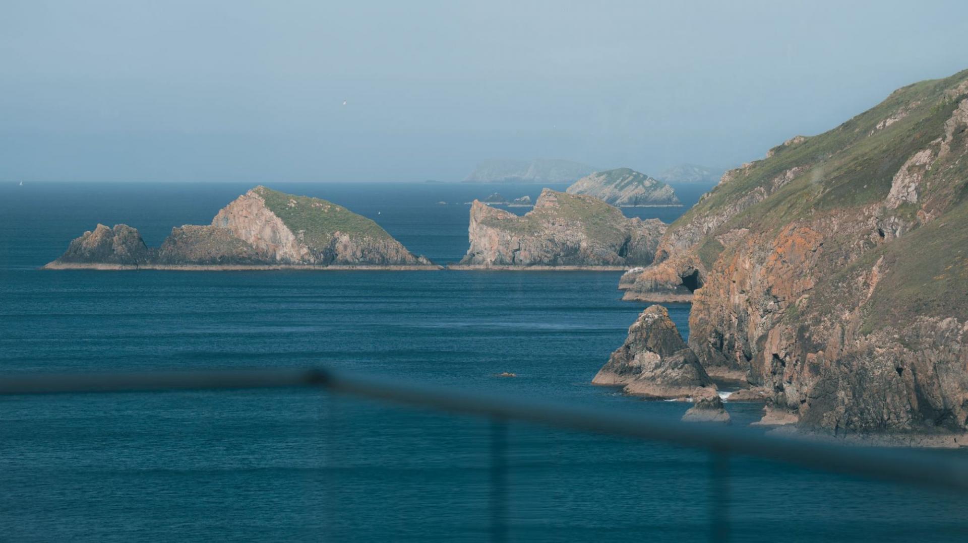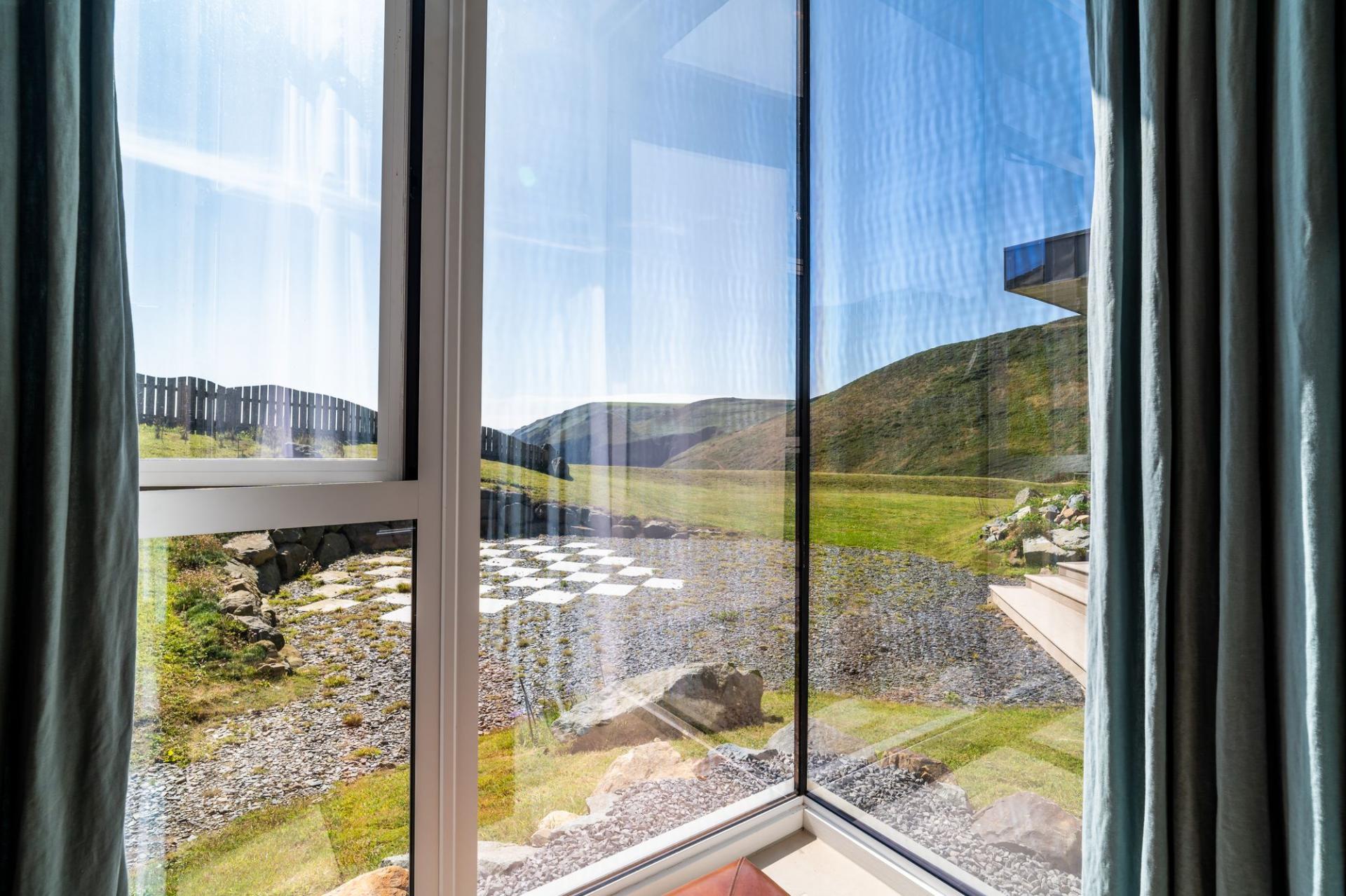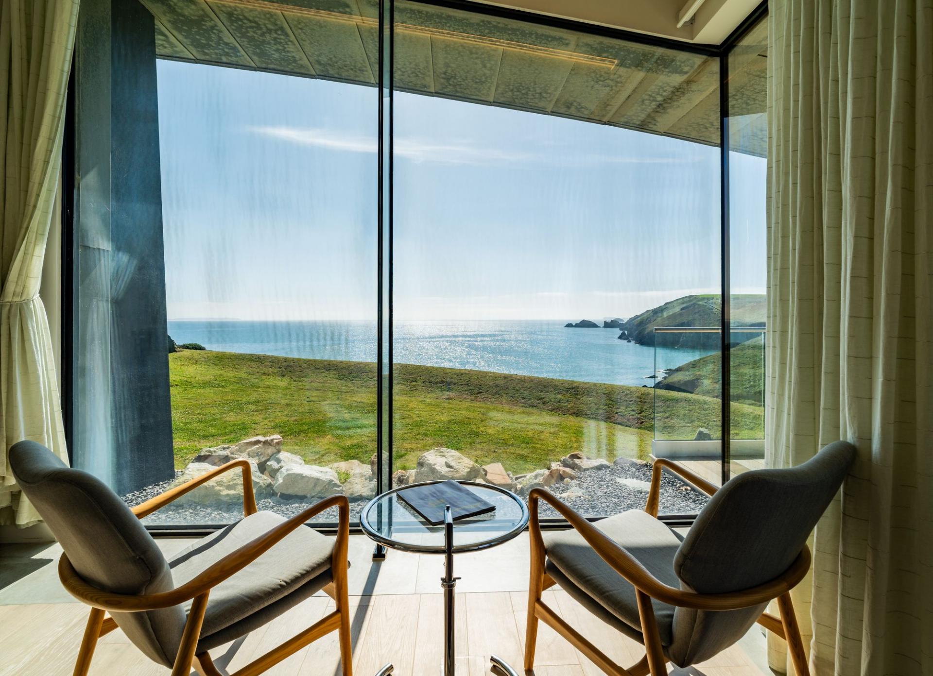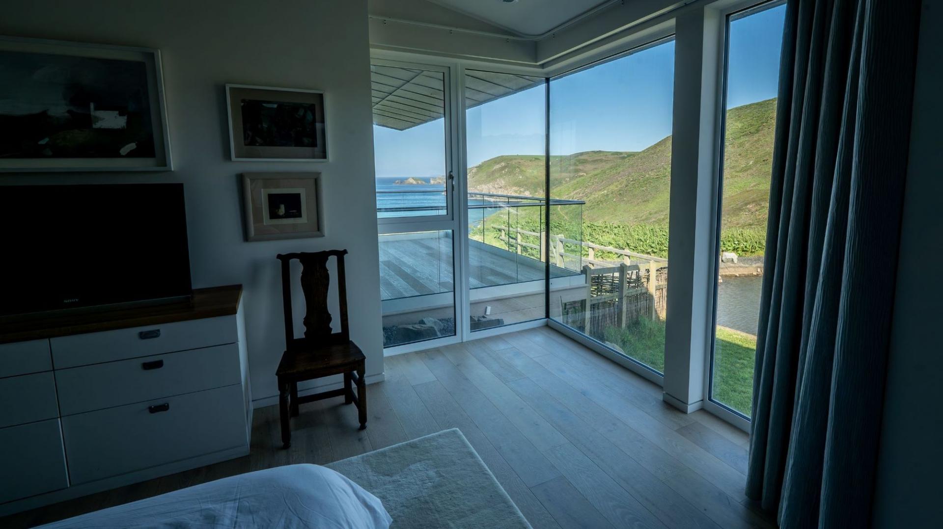 Bright and inviting double bedroom with full-height glazing framing far-reaching coastal and countryside views. The room features subtle textured wallpaper, warm wood flooring, and space for both sleeping and a small seating area. Natural light floods in, creating a calm and restful atmosphere, with the large window providing a striking outlook over the surrounding landscape.