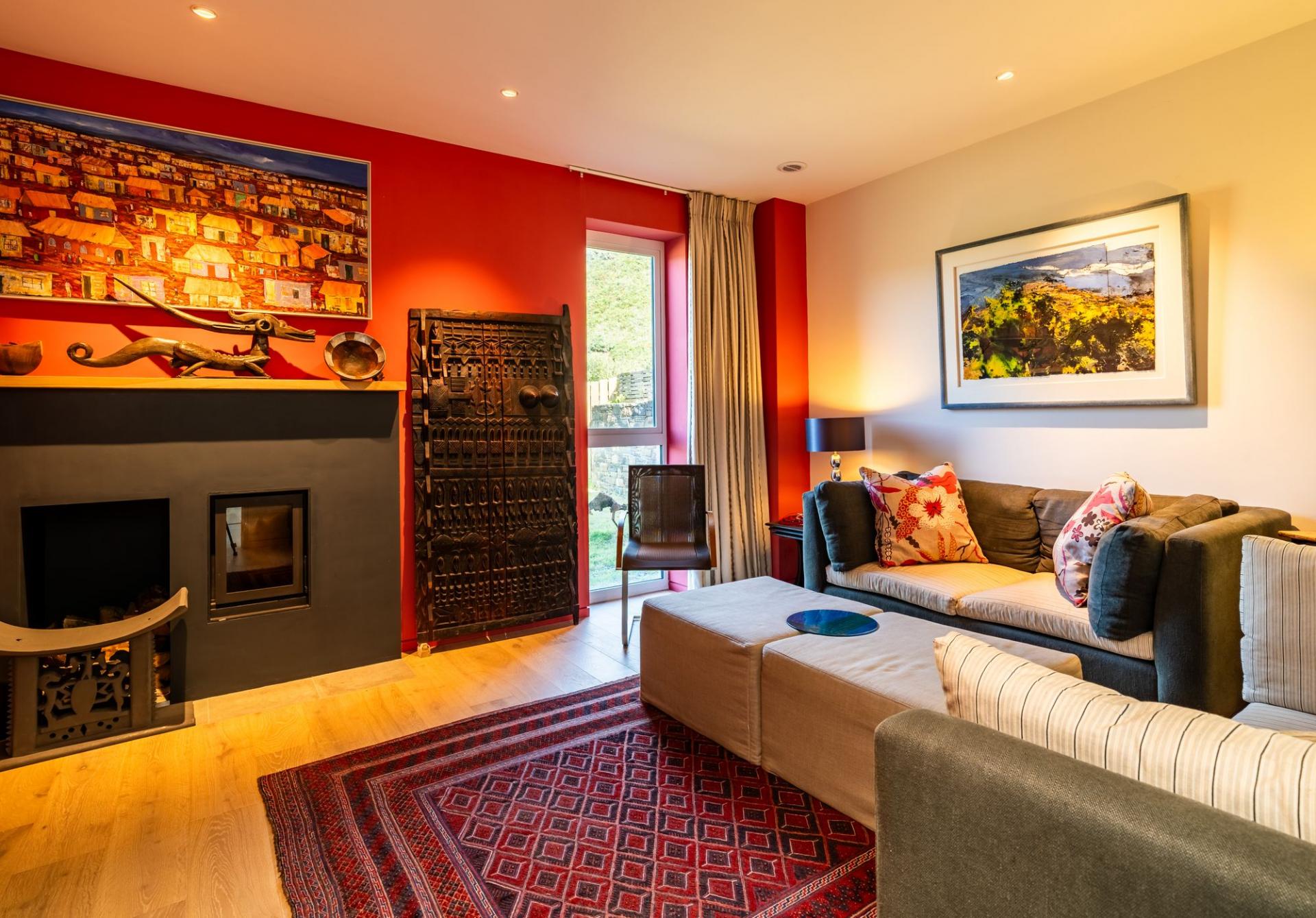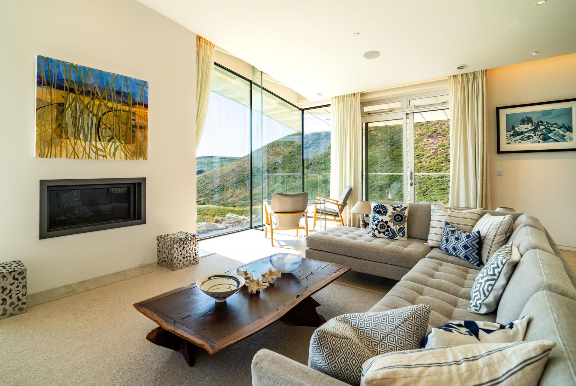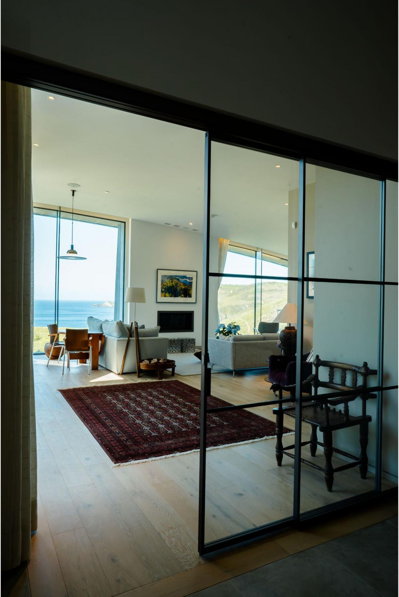 The sitting room offers wonderful panoramic views over St Brides Bay and the surrounding Pembrokeshire Coast National Park. High ceilings and underfloor heating create a bright, comfortable space that can be enjoyed all year round. A cleverly concealed bar adds a touch of convenience, while wide doors open onto a sea-facing deck with an adjoining outdoor dining and seating area. The living area is anchored by a central fireplace or feature wall, complemented by built-in bookshelves and gallery lighting for art.