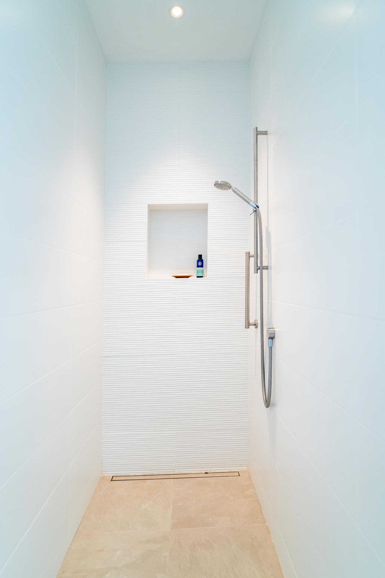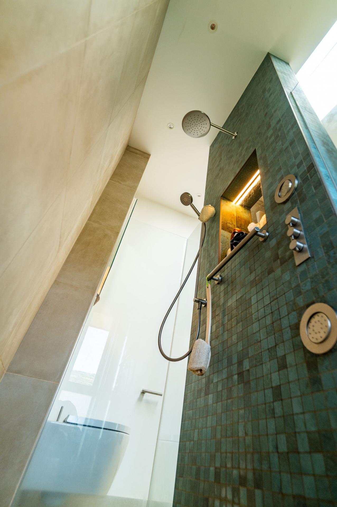 Contemporary en-suite featuring a spacious walk-in shower with frameless glass screen, handheld shower heads, and a built-in recessed shelf. A skylight above floods the space with natural light, while a heated towel rail adds both warmth and practicality.