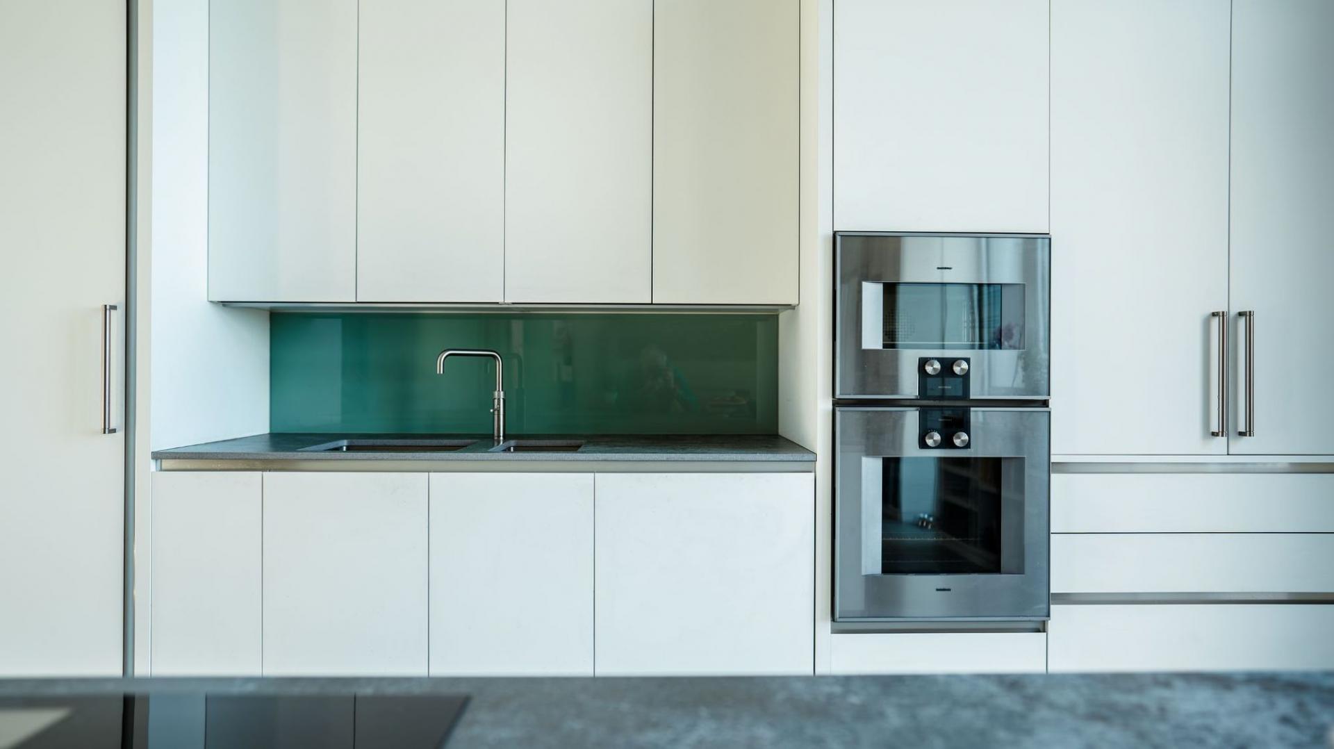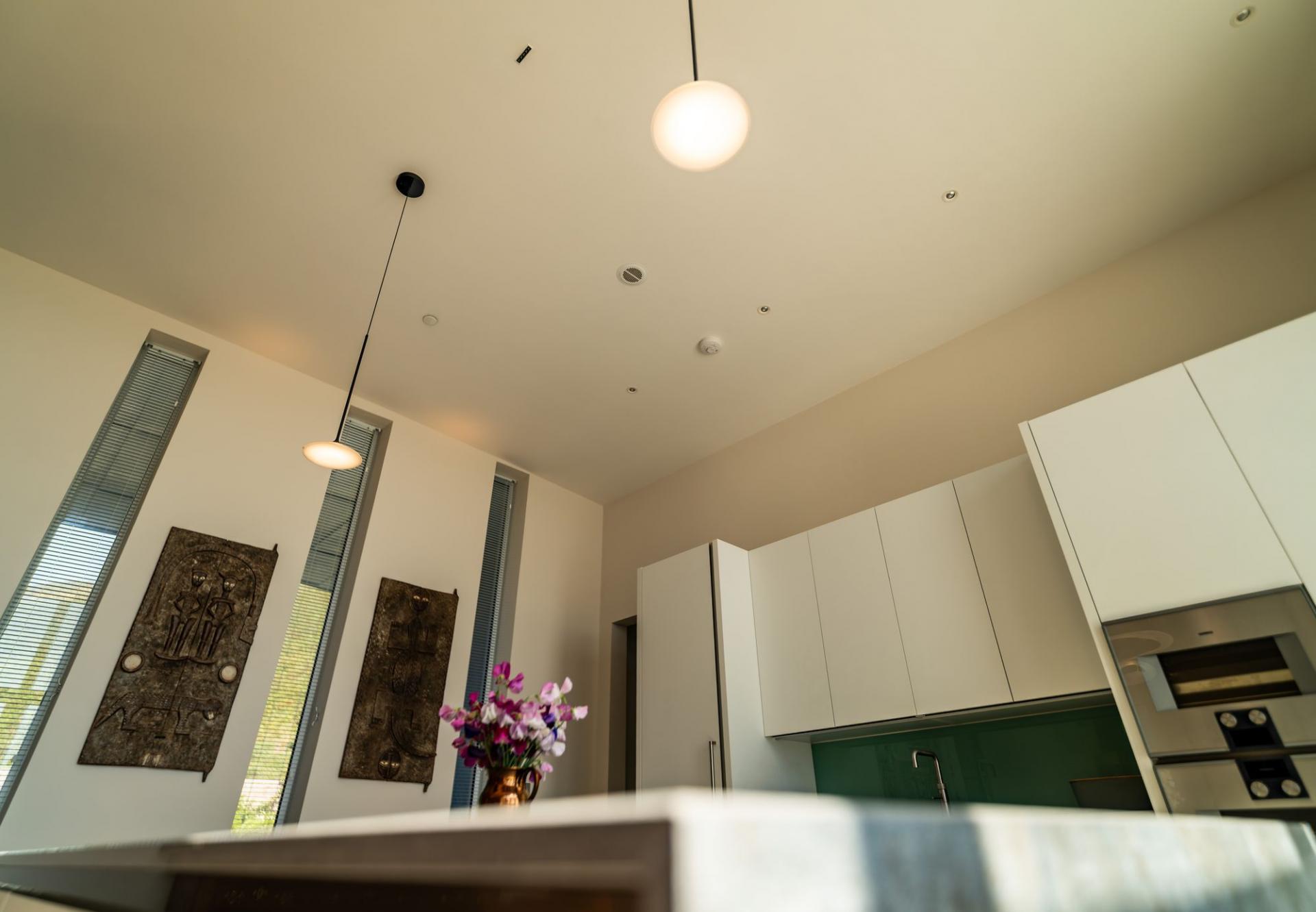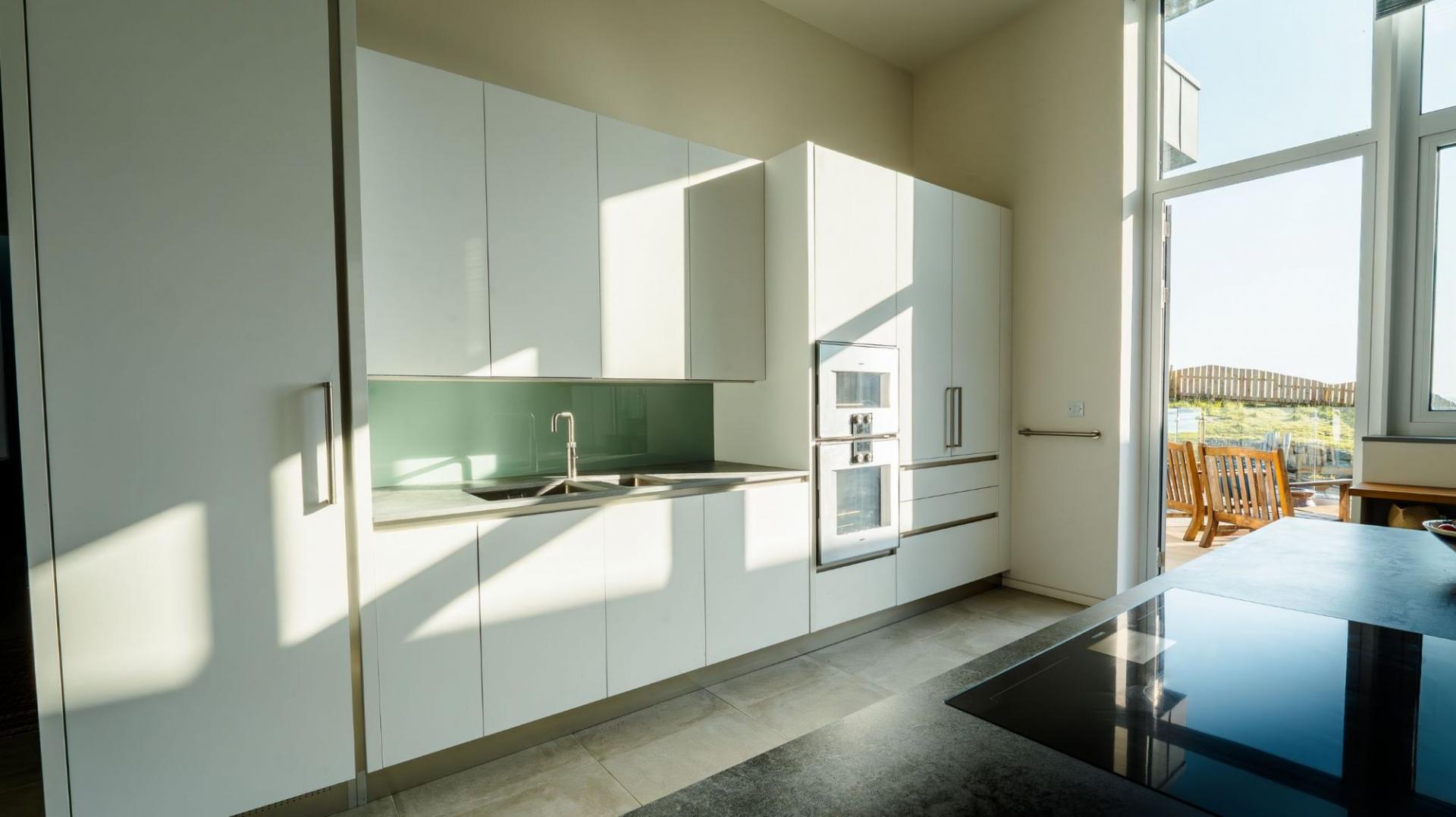 The kitchen is a minimalist, high-spec showpiece with sleek cabinetry, integrated appliances, and a generous island ideal for entertaining.