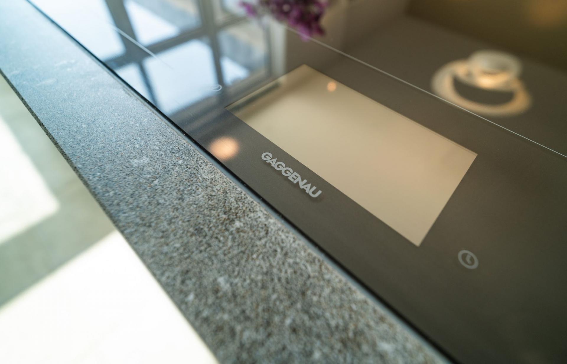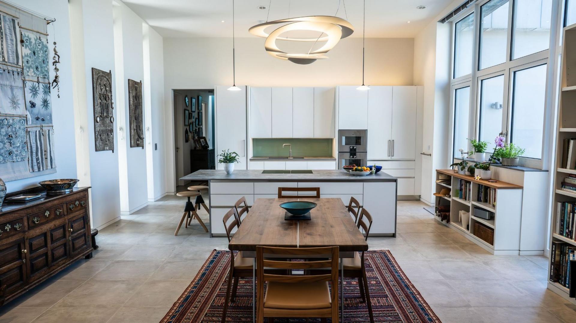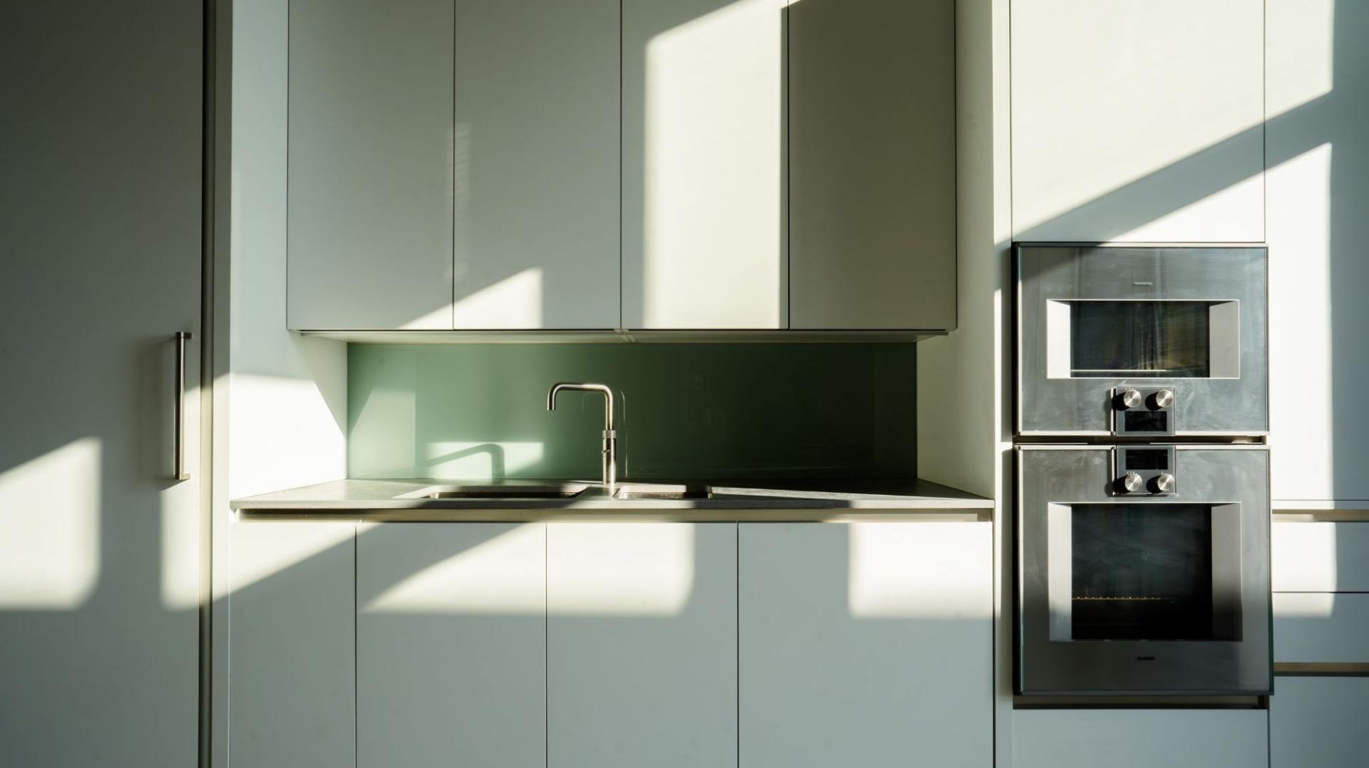 The kitchen is a minimalist, high-spec showpiece with sleek cabinetry, integrated appliances, and a generous island ideal for entertaining.